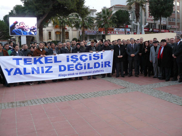 Tekel işçilerine, destek olmak amacıyla Petrol-İş Aliağa şubemiz ve tüm emek bileşenleri her gün 17.00-18.00 saatleri arasında Aliağa Demokrasi Meydanı’nda toplanmaya devam ediyor.