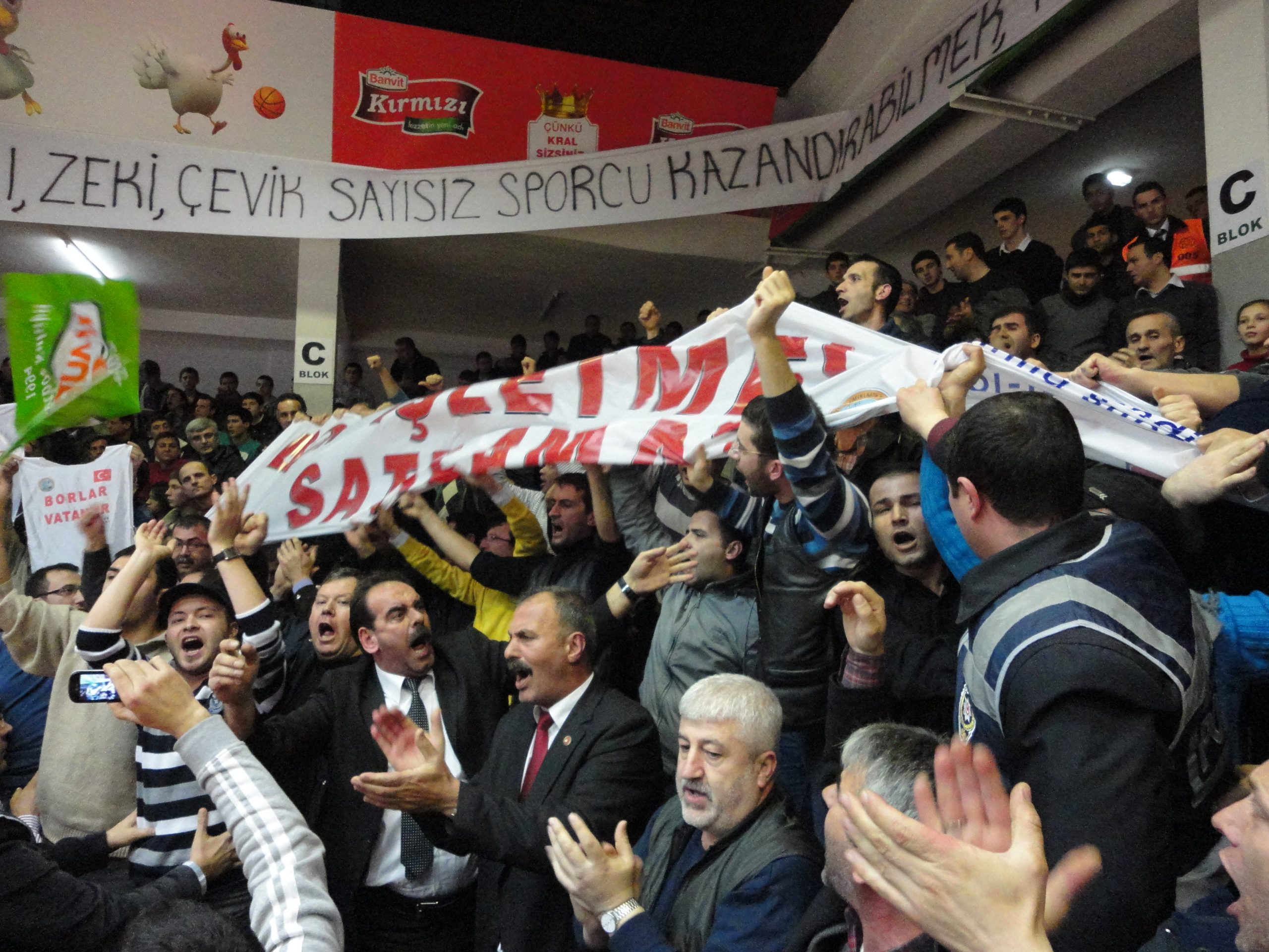 Bor işçisi sahaya indi. Bandırma’da şu anda oynanmakta olan Bandırma Banvitspor- Galatasaray karşılaşması için tribündeki yerini alan yüzlerce bor çalışanı, karşılaşmanın başlaması ile birlikte içlerine giydikleri eylem önlüklerini çıkartarak, bor madenlerinin özelleştirilmesini protesto ettiler.