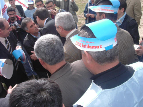 Daha sonra sözü alan Genel Başkanımız Sn. Mustafa ÖZTAŞKIN Batman’da olmaktan dolayı mutlu olduğunu, buraya her geldiğinde yoğun ilgiden dolayı duygulandığını belirtti. Bundan dolayı ayrıca bütün arkadaşlara teşekkür etti. Daha sonra, söz konusu iptal kararını değerlendiren Başkan kararda da belirtildiği gibi Batman rafinerisinde yatırımların sürekli olması gerektiğini söyledi. Öztaşkın; “.. sendikamız özelleştirme politikaları karşısında açık bir tavır almıştır, almaya da devam edecektir. Yapılan özelleştirmelerin ideolojik boşaltma politikaları olduğu anlaşılmaktadır. Özünde özelleştirme politikaları, Yeni Dünya Düzenin reel anlamda hayata geçirilmeye çalışılmasıdır. keza özelleştirmenin karlılıkla hiçbir alakası yoktur-özelleştirmenin mülkiyetle hiçbir alakası yoktur. Türkiye’deki 20 yıllık özelleştirme programları tam bir fiyaskodur, Sosyal devleti-sosyal adaleti ortadan kaldırmaya yönelik bu tür politikalar ülkemizin milyonlarca dolar zararına, 80 bin’in üzerinde insanın işsiz kalmasına neden olmuştur. Sendikamızın Tüpraş özelleştirmesine ilişkin politikasının ne kadar doğru olduğu anlaşılmıştır. Genel anlamda halkın % 35 i özelleştirme politikalarına destek olurken, Tüpraş özelleştirmesi konusunda bu desteğin %75 civarında olduğu görülmektedir. İkinci iptal kararı sizlerin ve örgütümüzün bir başarısıdır. Eğer yargı gereği yerine getirilmezse biz sizler (işçilere hitaben) dönecek ve tüm gücümüzle mücadeleye devam edeceğiz” diyerek devam etti.