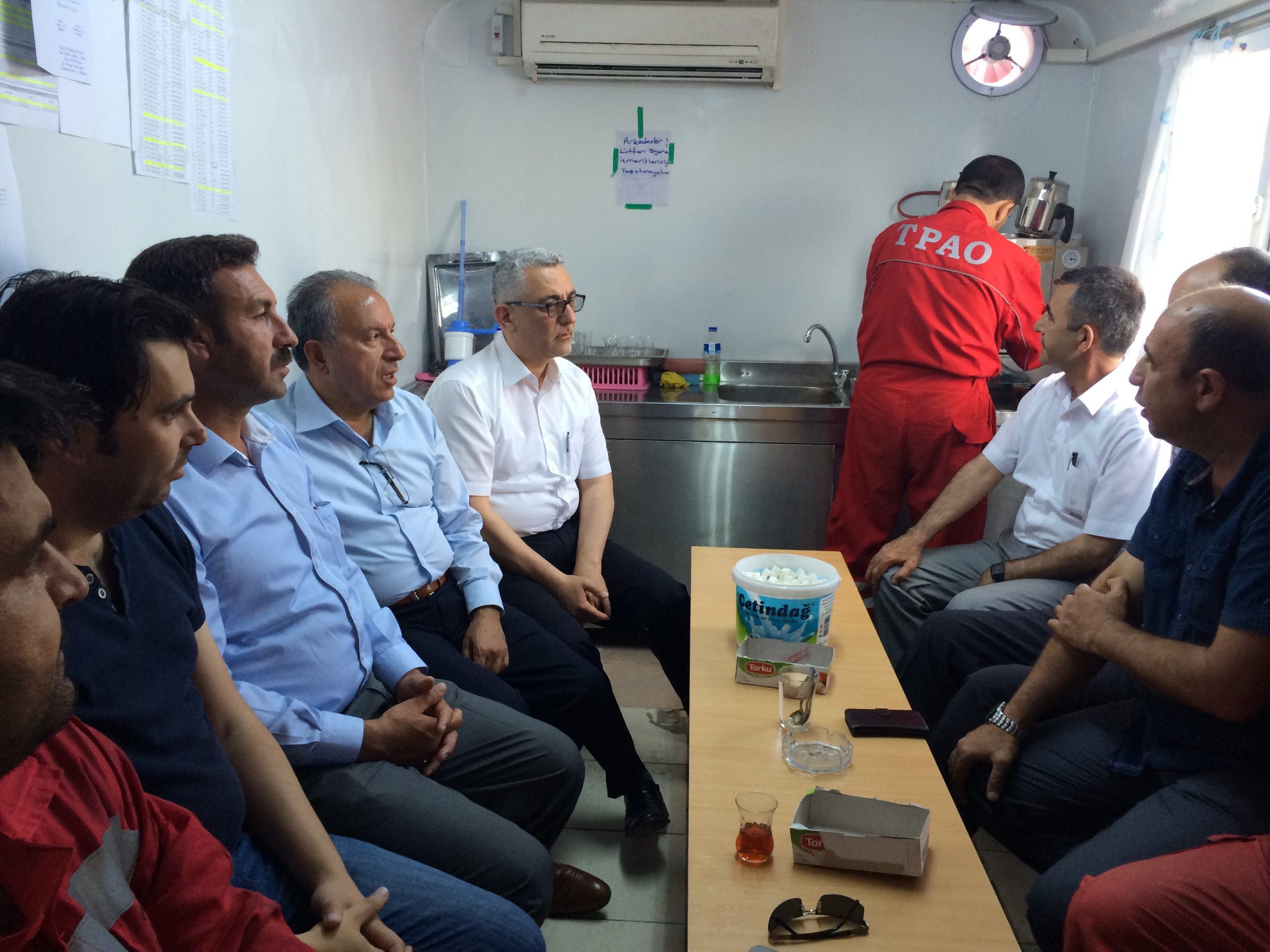 Genel Sekreterimiz Ali Ufuk Yaşar, Genel Yönetim Sekreterimiz Ahmet Kabaca,  Adıyaman Şubemizi 17 Haziran Salı günü ziyaret etti. Merkez Yöneticilerimiz Yaşar ve Kabaca’yı Adıyaman Şube Başkanımız Ali Tirpan, Şube Başkan Yardımcılarımız Şahin Yılmaz, Sait Mustafa Daşdelen ve Adıyaman Şube Yönetim Kurulumuz karşıladılar. 1.5 gün boyunca süren yoğun programda merkez yöneticilerimiz ve Adıyaman Şube Yöneticilerimiz TPAO Bölge Müdürlüğünü, atölyeleri, Karakuş üretim ve sondaj sahalarını ziyaret ettiler.