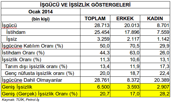 İşgücüne dahil edilmeyen iş bulmaktan umudunu kesenler, iş aramayanlar, zamana bağlı eksik istihdam edilenler, yılın bir bölümünde çalışan mevsimlik işçilerin de dahil edildiği gerçek (geniş) işsizlik oranı yüzde 20,7. Geniş anlamda işsizlerin sayısı 6,5 milyon kişiyi buluyor.