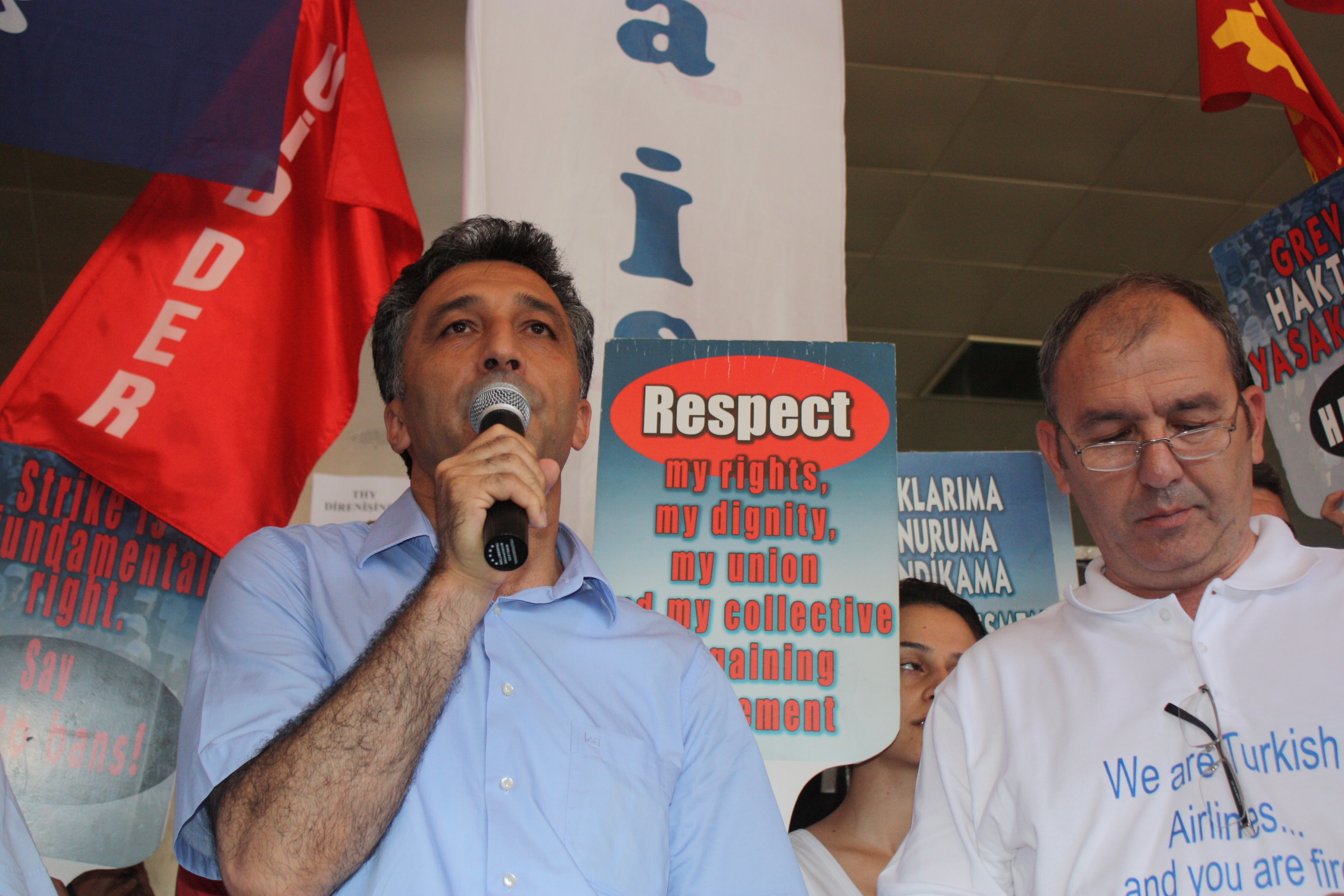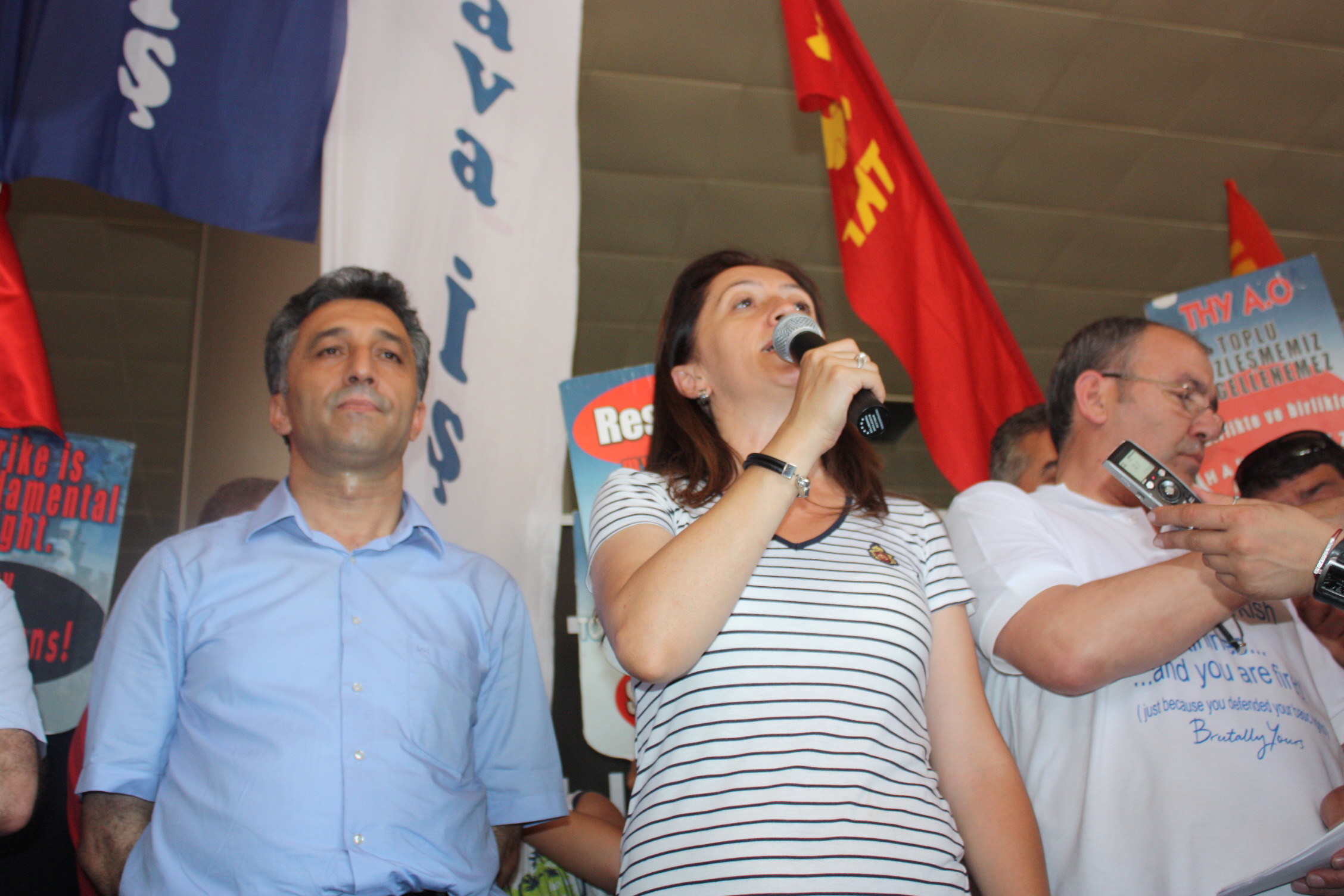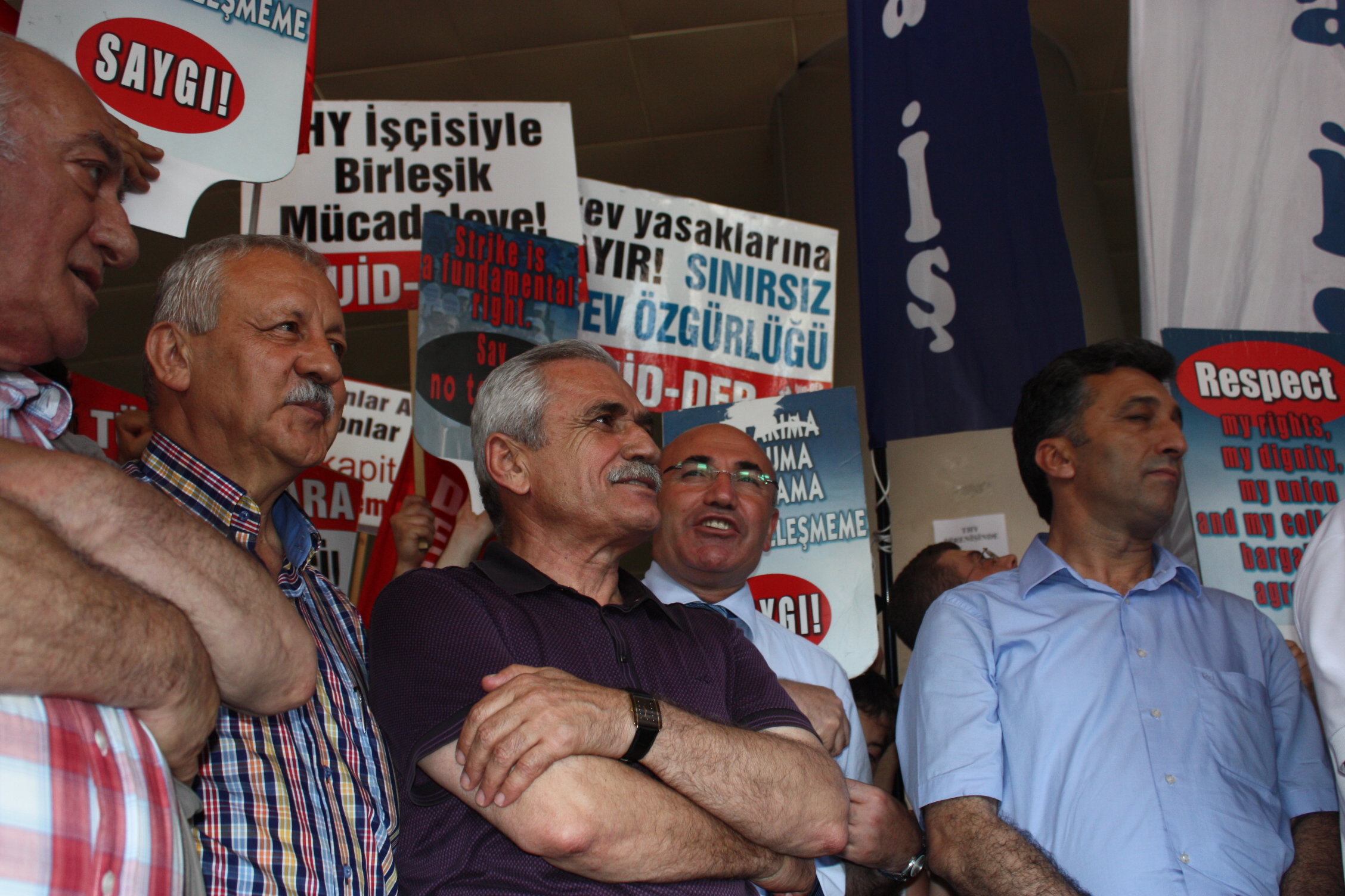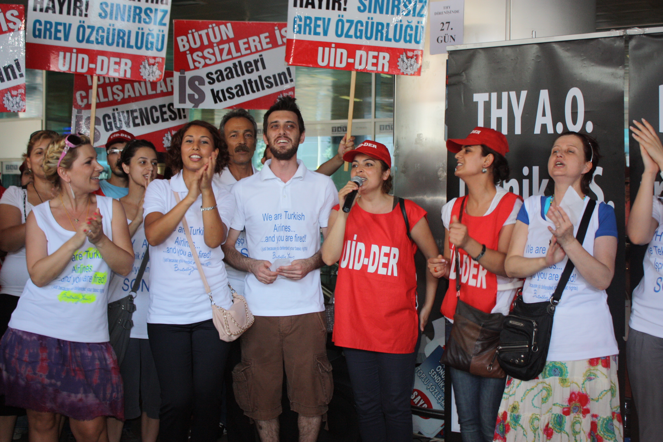 Sayın, “Bugün eylemin 27. günü. Bize destek veren herkese şükranlarımızı sunuyoruz. Mücadelemizden sonuç alıncaya kadar vazgeçmeyeceğiz. AK Parti iktidarı ve onların atadığı THY yönetiminin uygulamalarını kabul etmiyoruz. Bizler işçilerin haklarını savunmaya devam edeceğiz. Dünyanın hiçbir tarafında havacılık kolunda görev yapan personelin grev yapması yasak değilken bizim ülkemizde bu yasak meclisten geçirildi ve Cumhurbaşkanı tarafından gece vaktinde onaylandı. Ertesi gün de resmi gazetede yani 3 Haziran’dan yayınlandı. Eğer yayınlanmamış olsaydı bizler 5 Haziran’da grev kararı alacaktık. Ancak şimdi süreç Anayasa Mahkemesi’ne taşınacak. CHP’nin Anayasa Mahkemesi’ne yapacağı başvuru hazırlığı da sona ermiş durumda” dedi.