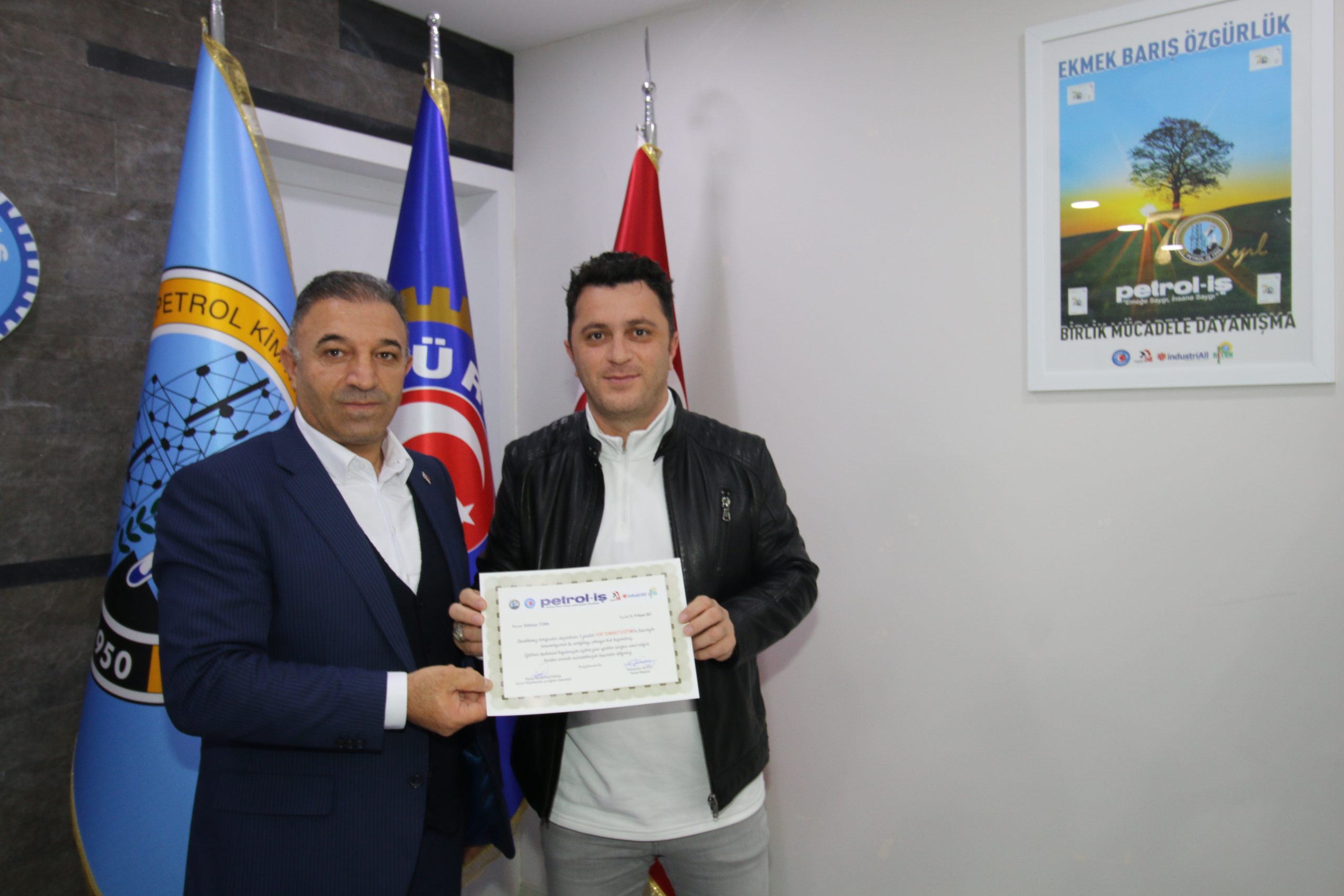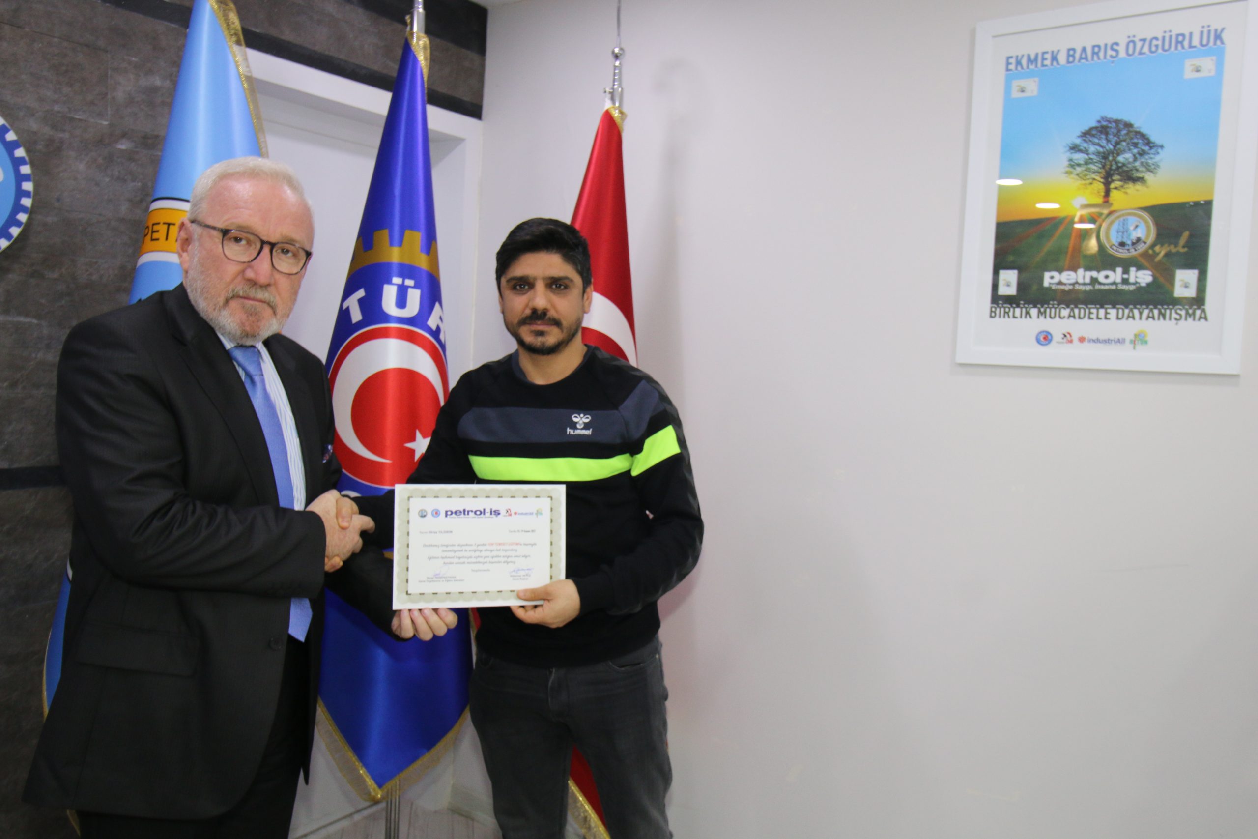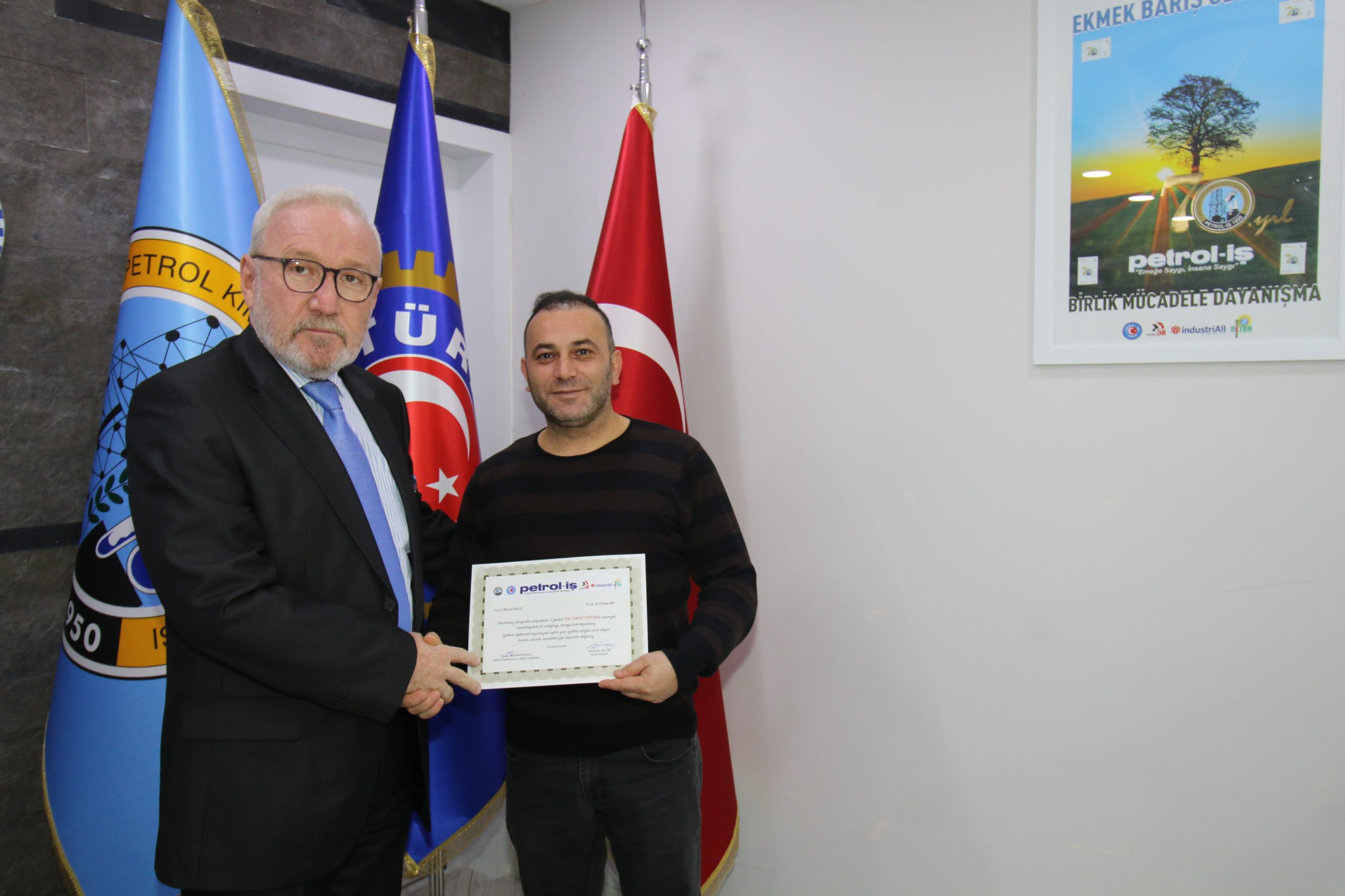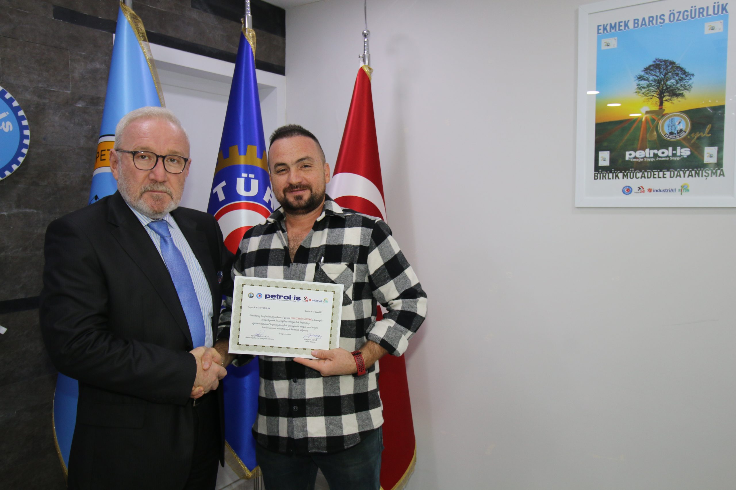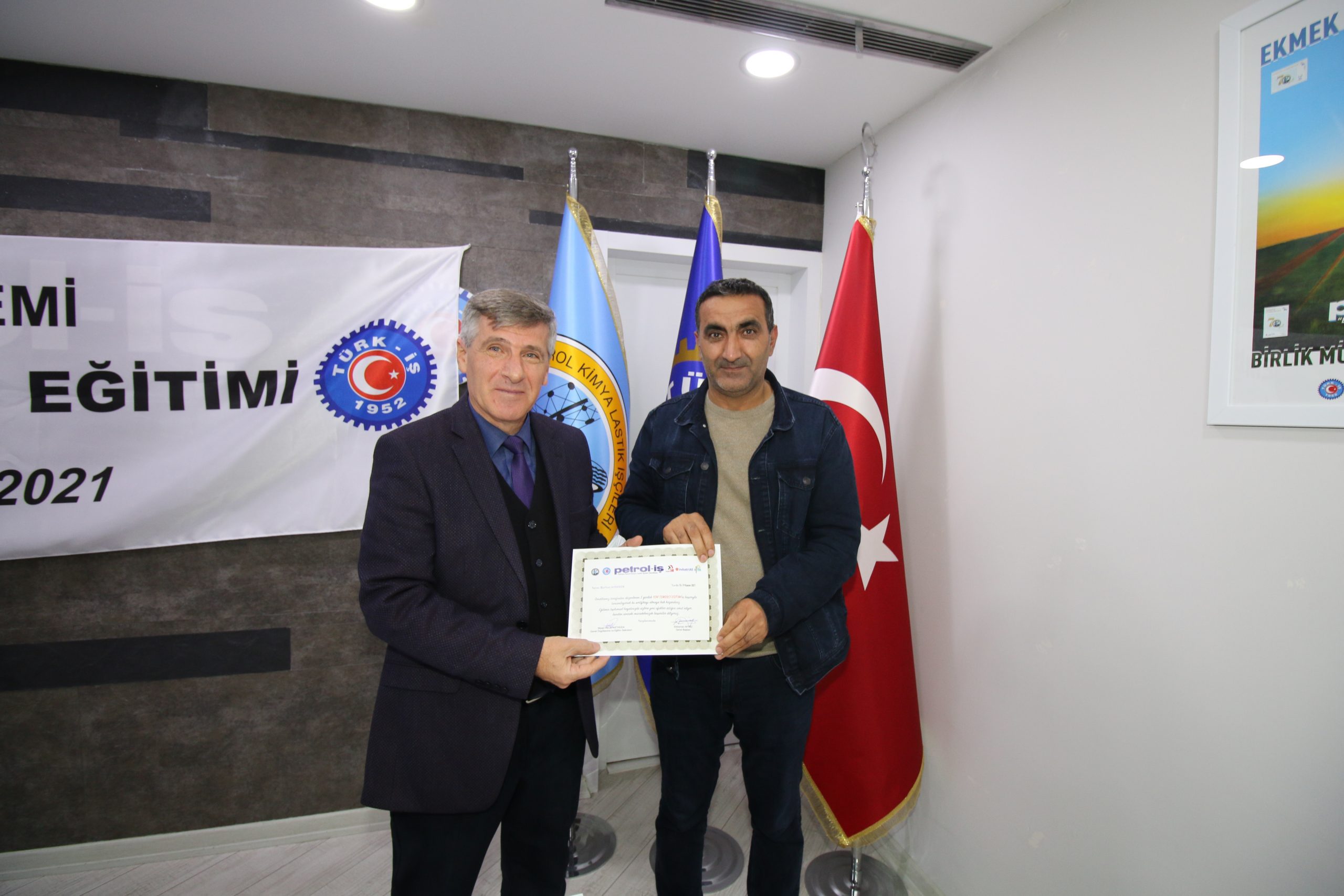 2021 yılı güz dönemi Yeni Temsilci Eğitiminin dördüncü grubu, 15 Kasım günü başladıkları eğitimi bugün başarılı bir şekilde sonlandırdı. Eğitimin son gününde Merkez Yönetim Kurulu üyelerimiz temsilcilerimizle biraraya geldi. Saat 09.30’da Merkez Yönetim Kurulunun selamlaması ile başlayan toplantı, Genel Başkanımız Süleyman Akyüz’ün emeğin gündemi, Petrol-İş’in idari ve örgütsel yapısı üzerine yaptığı değerlendirme ile devam etti. Temsilcilerden gelen soruların yanıtlanmasının ardından Merkez Yönetim Kurulu Üyelerimiz temsilcilere sertifikalarını verdiler.