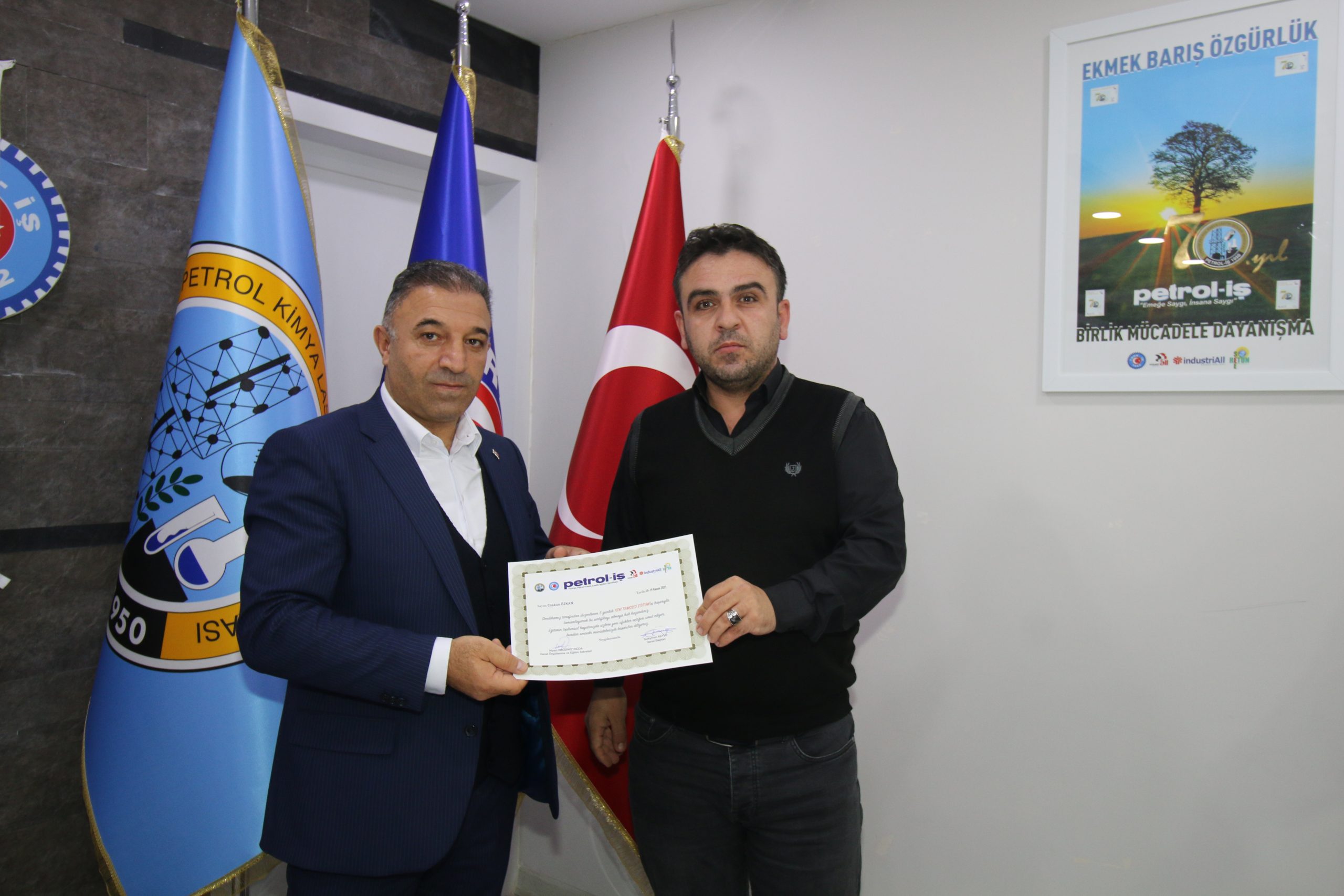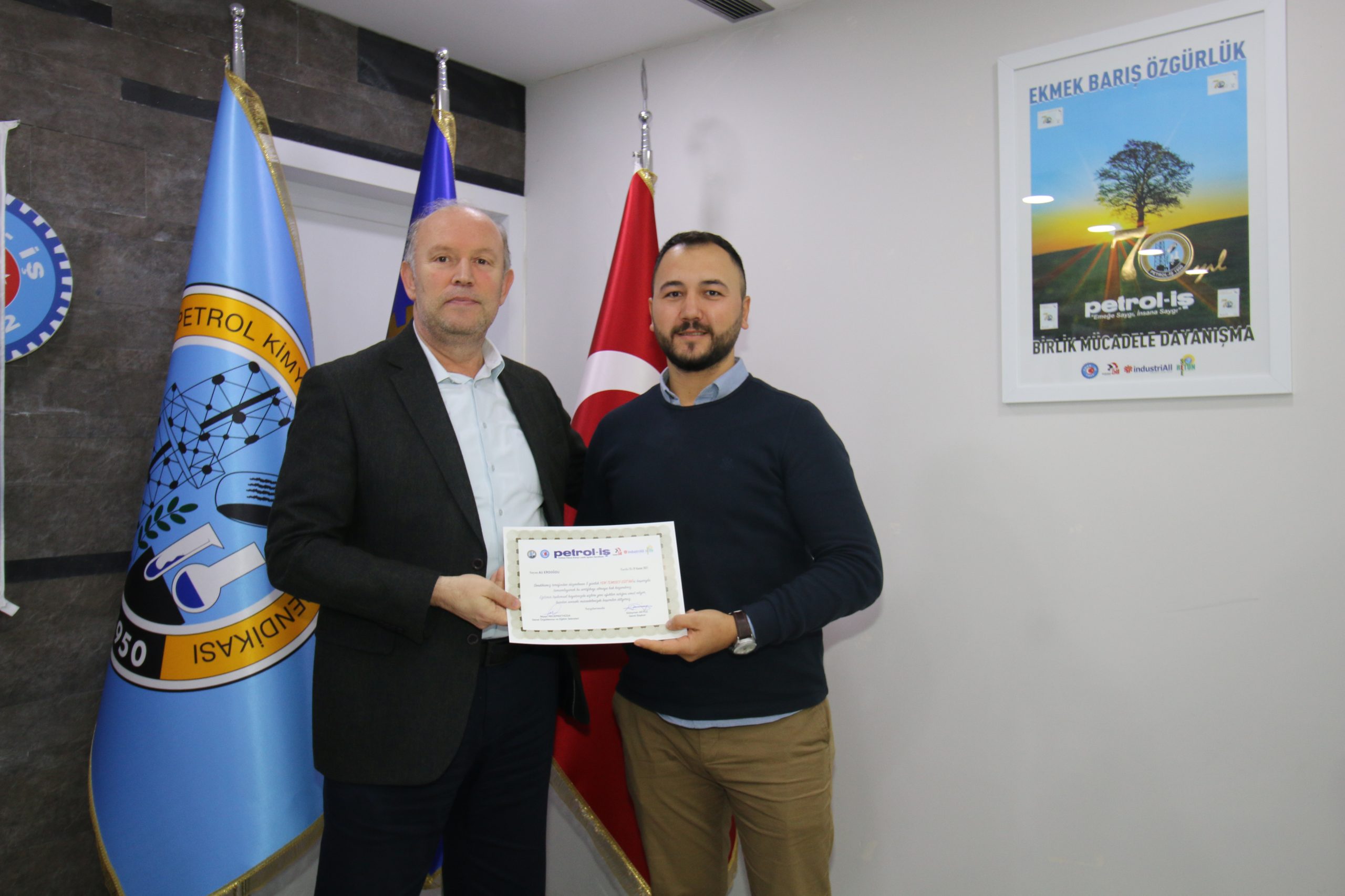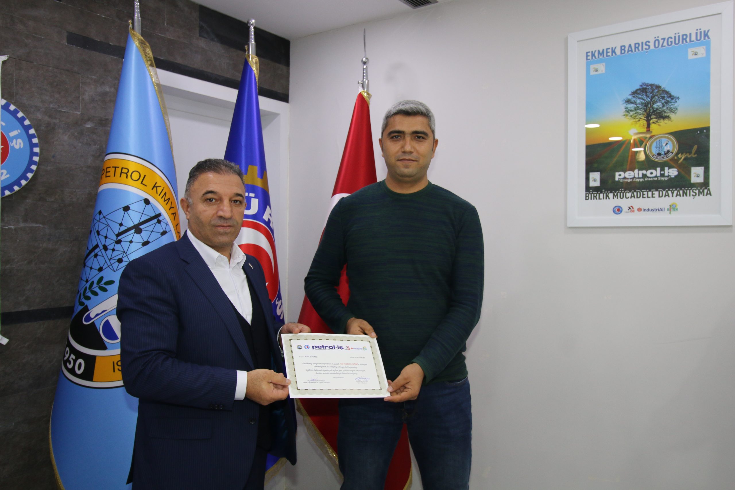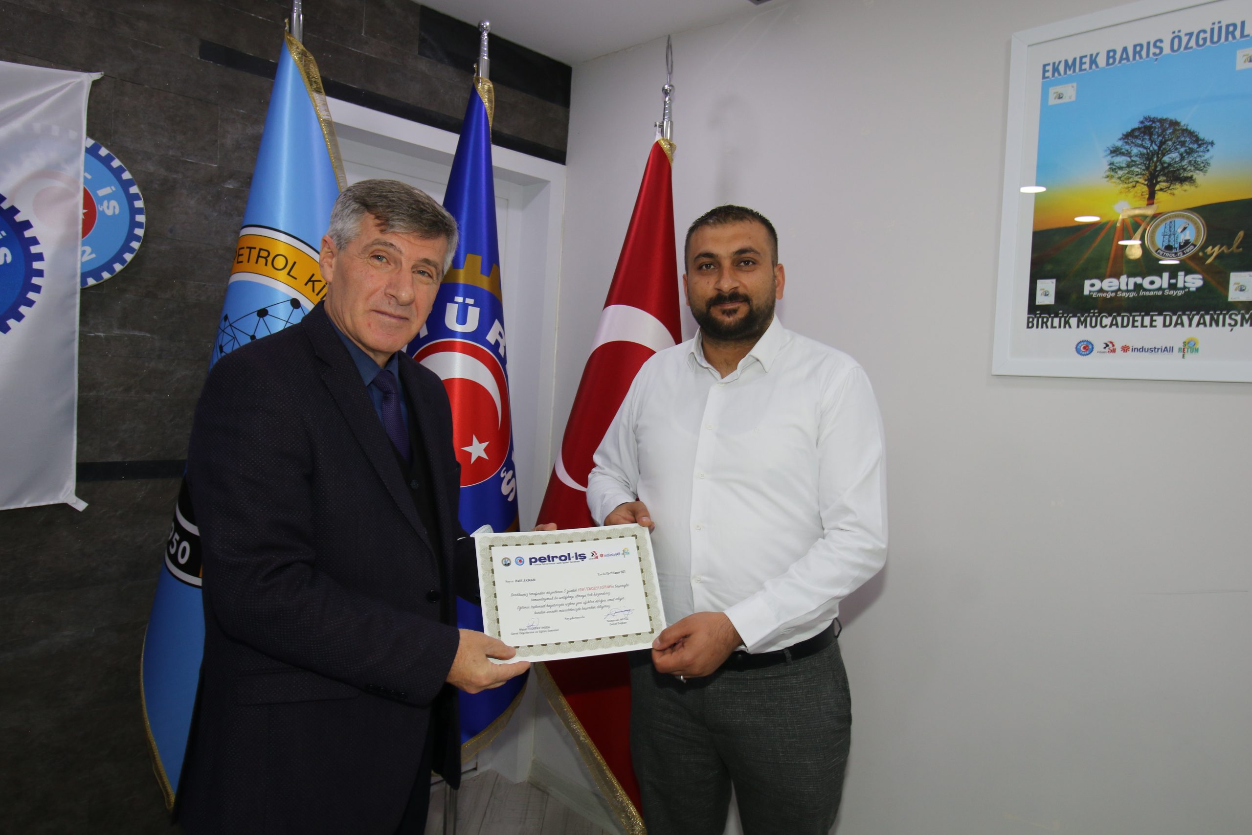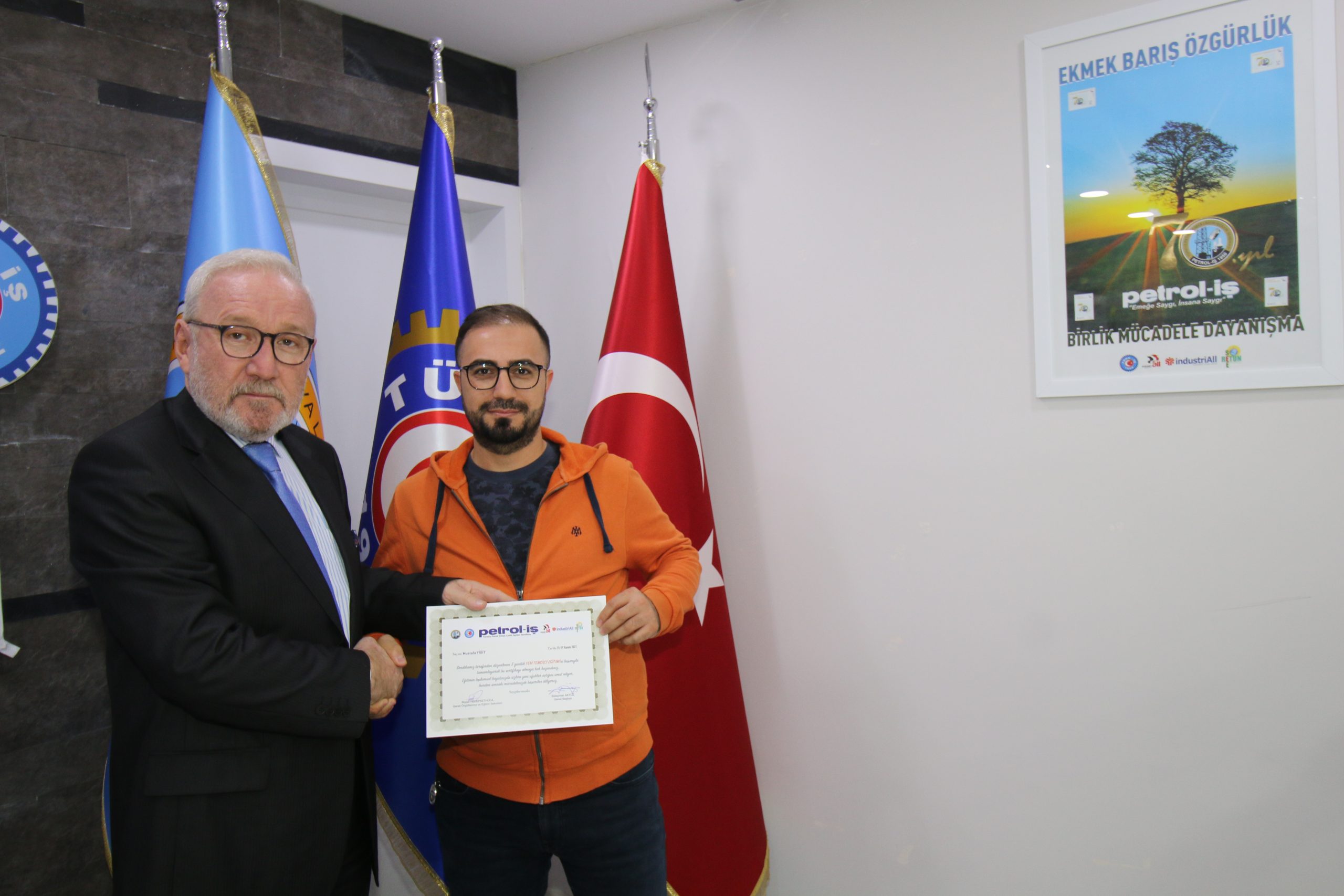 2021 yılı güz dönemi Yeni Temsilci Eğitiminin dördüncü grubu, 15 Kasım günü başladıkları eğitimi bugün başarılı bir şekilde sonlandırdı. Eğitimin son gününde Merkez Yönetim Kurulu üyelerimiz temsilcilerimizle biraraya geldi. Saat 09.30’da Merkez Yönetim Kurulunun selamlaması ile başlayan toplantı, Genel Başkanımız Süleyman Akyüz’ün emeğin gündemi, Petrol-İş’in idari ve örgütsel yapısı üzerine yaptığı değerlendirme ile devam etti. Temsilcilerden gelen soruların yanıtlanmasının ardından Merkez Yönetim Kurulu Üyelerimiz temsilcilere sertifikalarını verdiler.