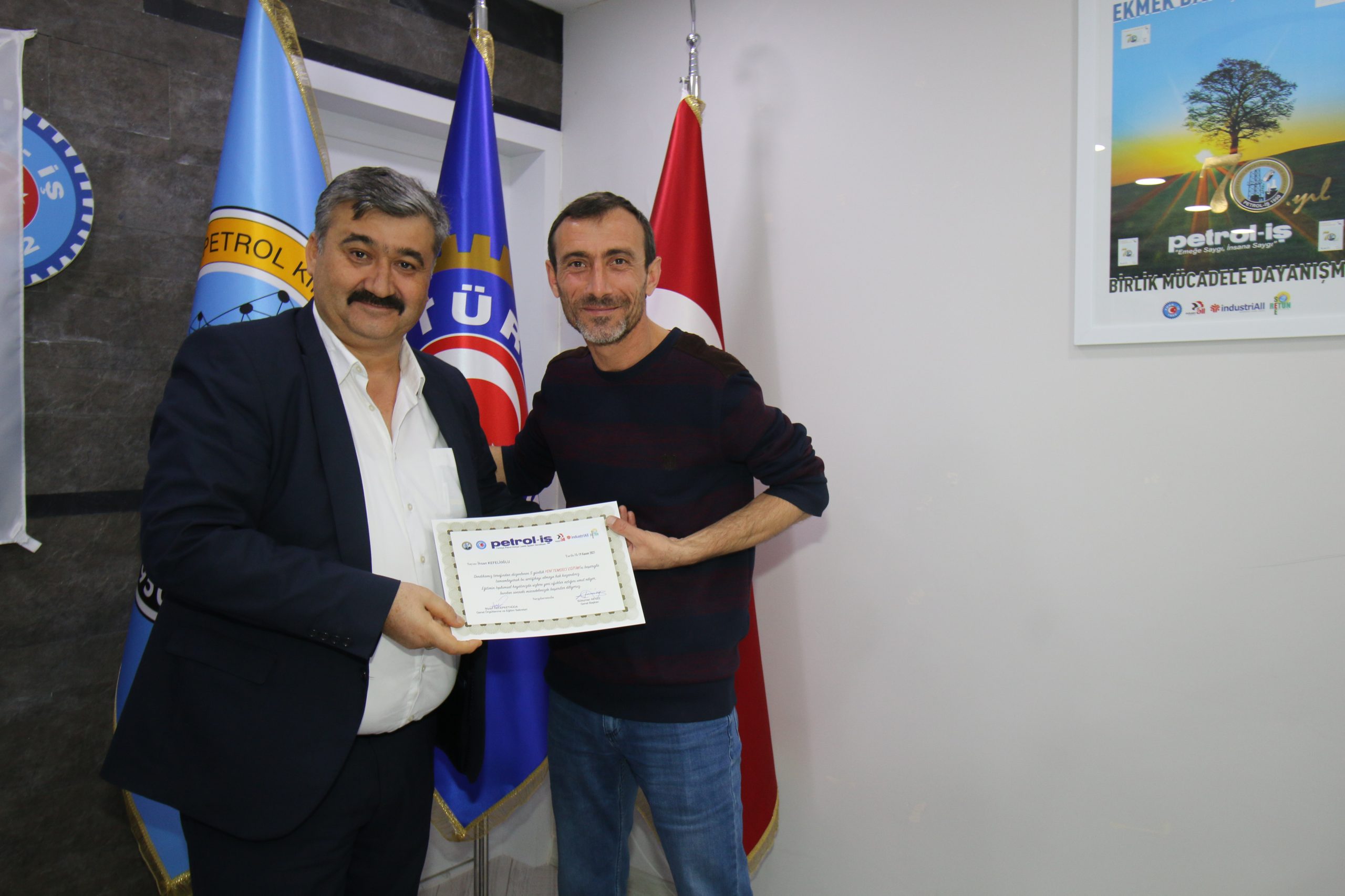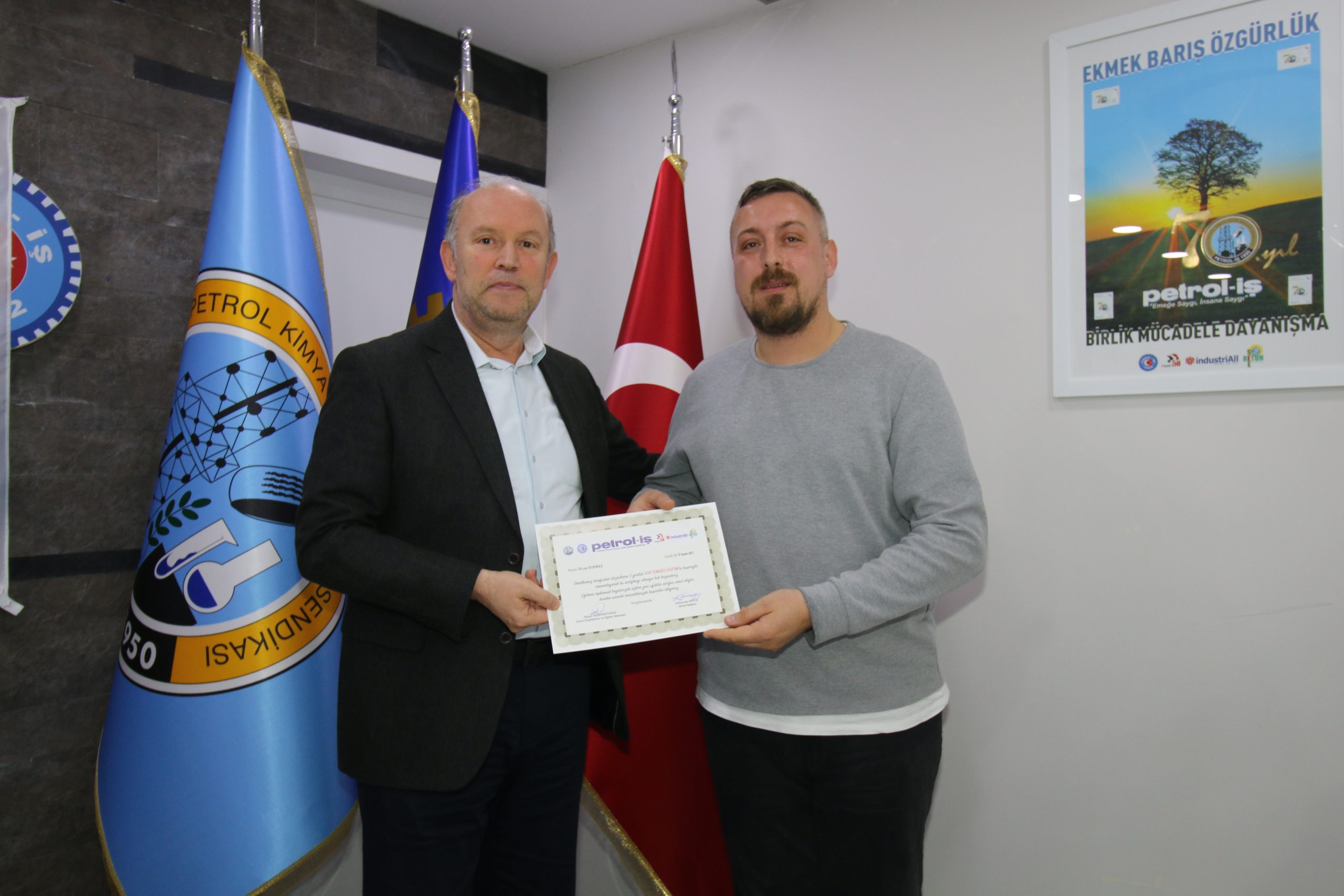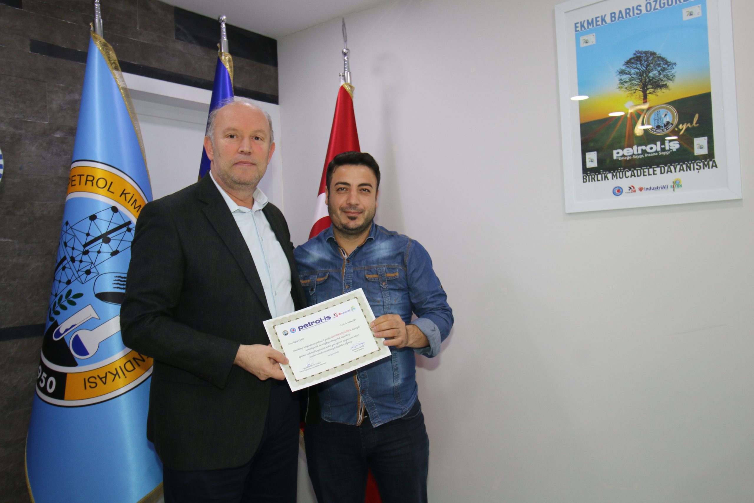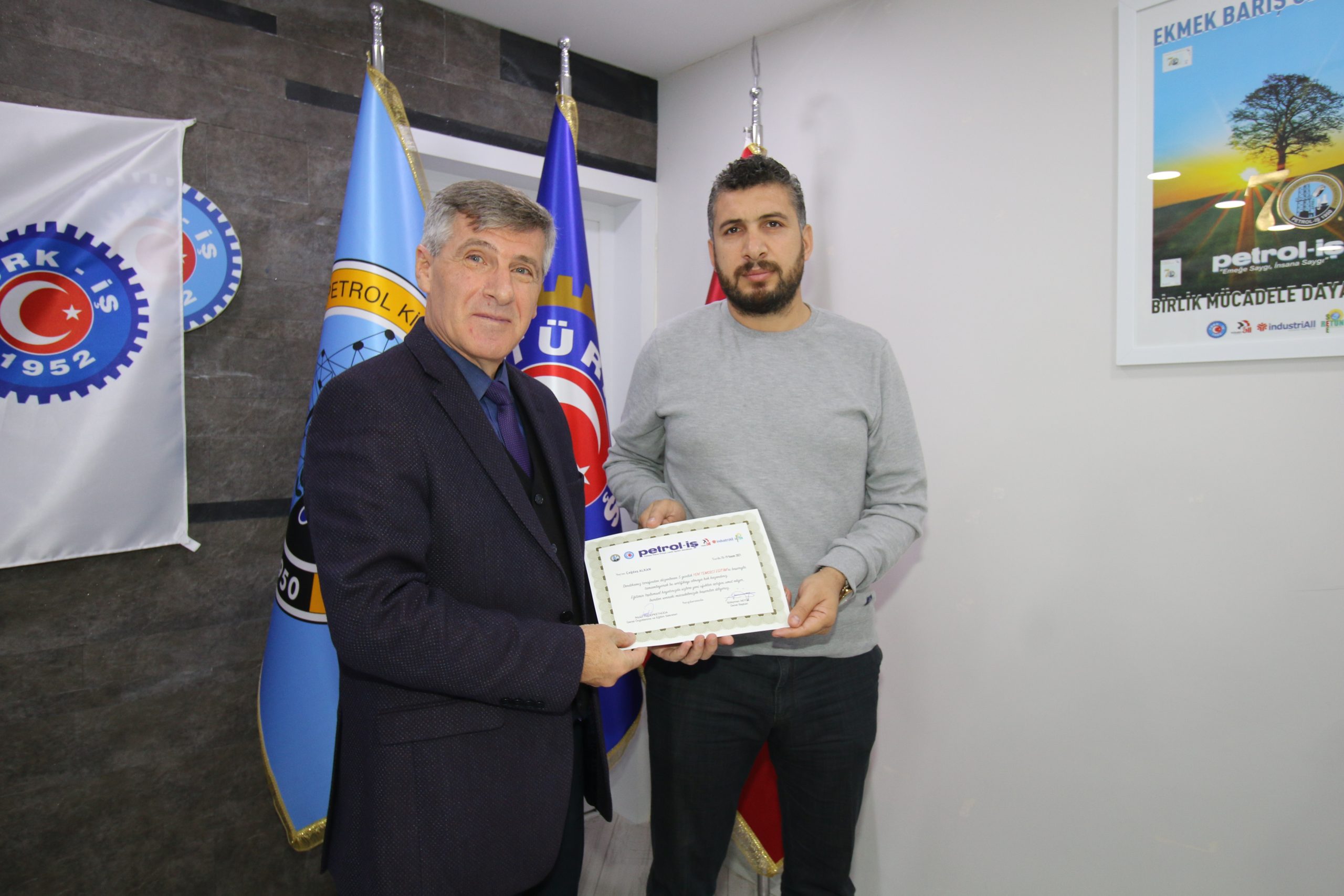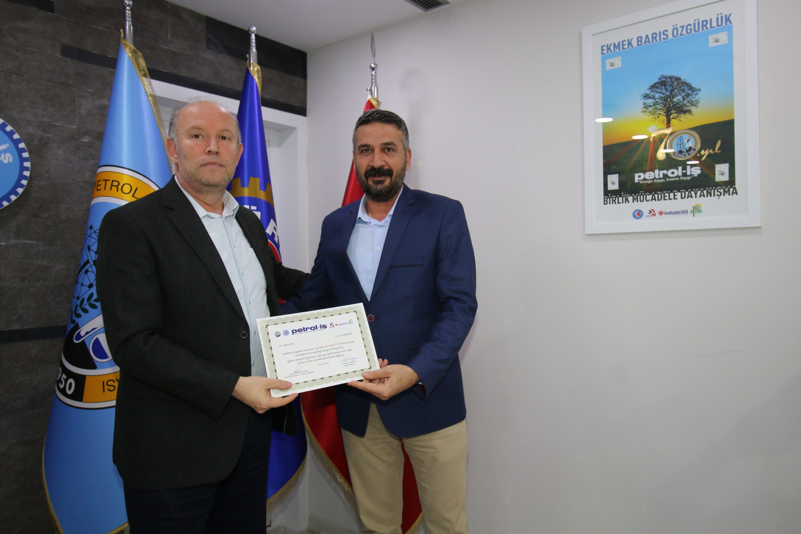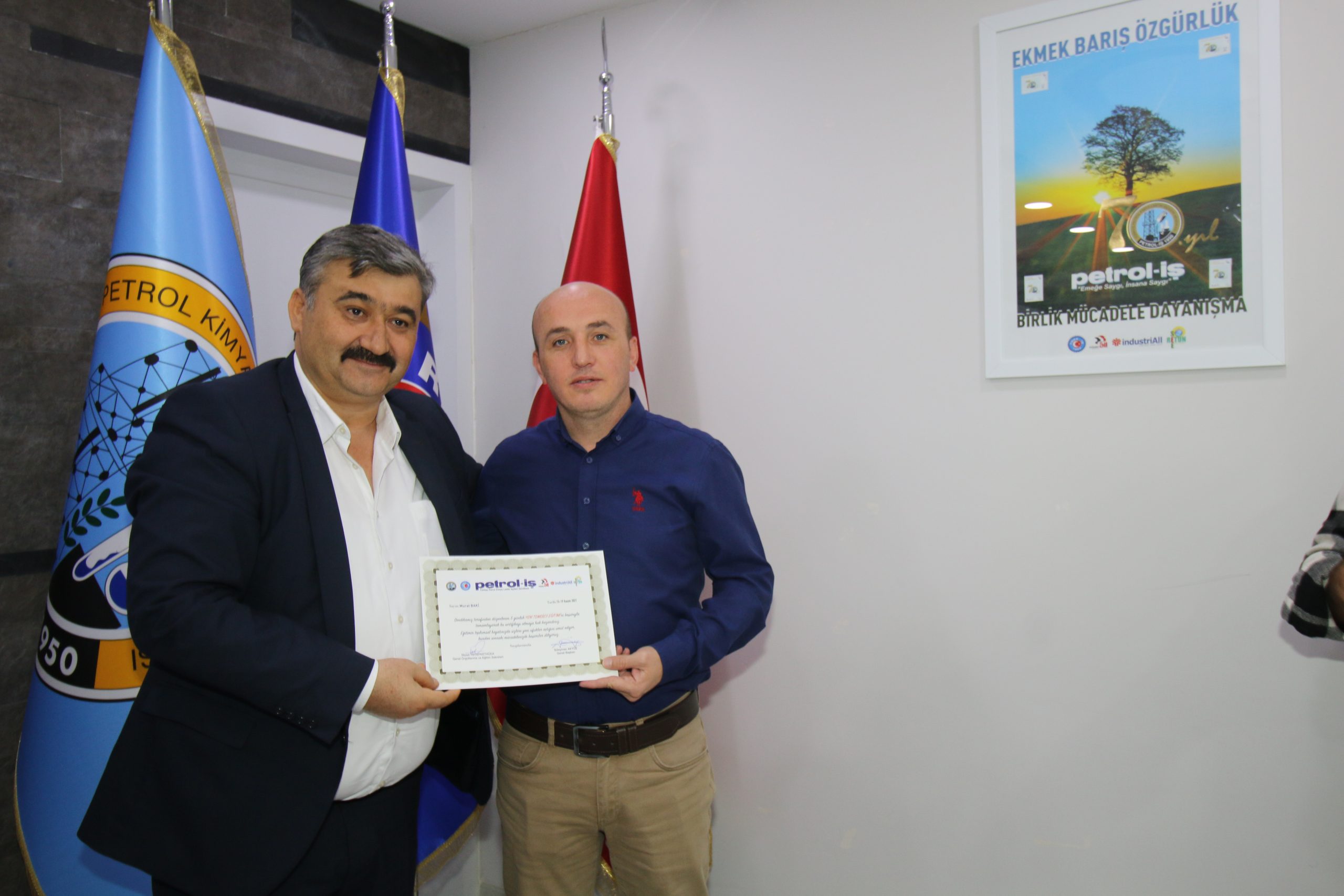 2021 yılı güz dönemi Yeni Temsilci Eğitiminin dördüncü grubu, 15 Kasım günü başladıkları eğitimi bugün başarılı bir şekilde sonlandırdı. Eğitimin son gününde Merkez Yönetim Kurulu üyelerimiz temsilcilerimizle biraraya geldi. Saat 09.30’da Merkez Yönetim Kurulunun selamlaması ile başlayan toplantı, Genel Başkanımız Süleyman Akyüz’ün emeğin gündemi, Petrol-İş’in idari ve örgütsel yapısı üzerine yaptığı değerlendirme ile devam etti. Temsilcilerden gelen soruların yanıtlanmasının ardından Merkez Yönetim Kurulu Üyelerimiz temsilcilere sertifikalarını verdiler.