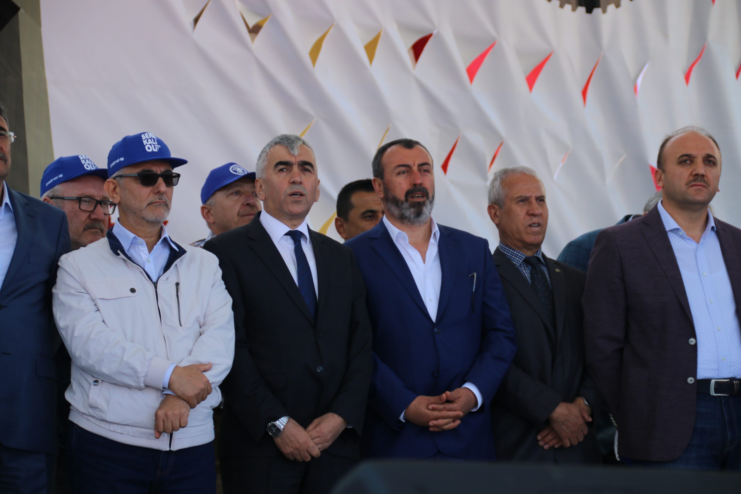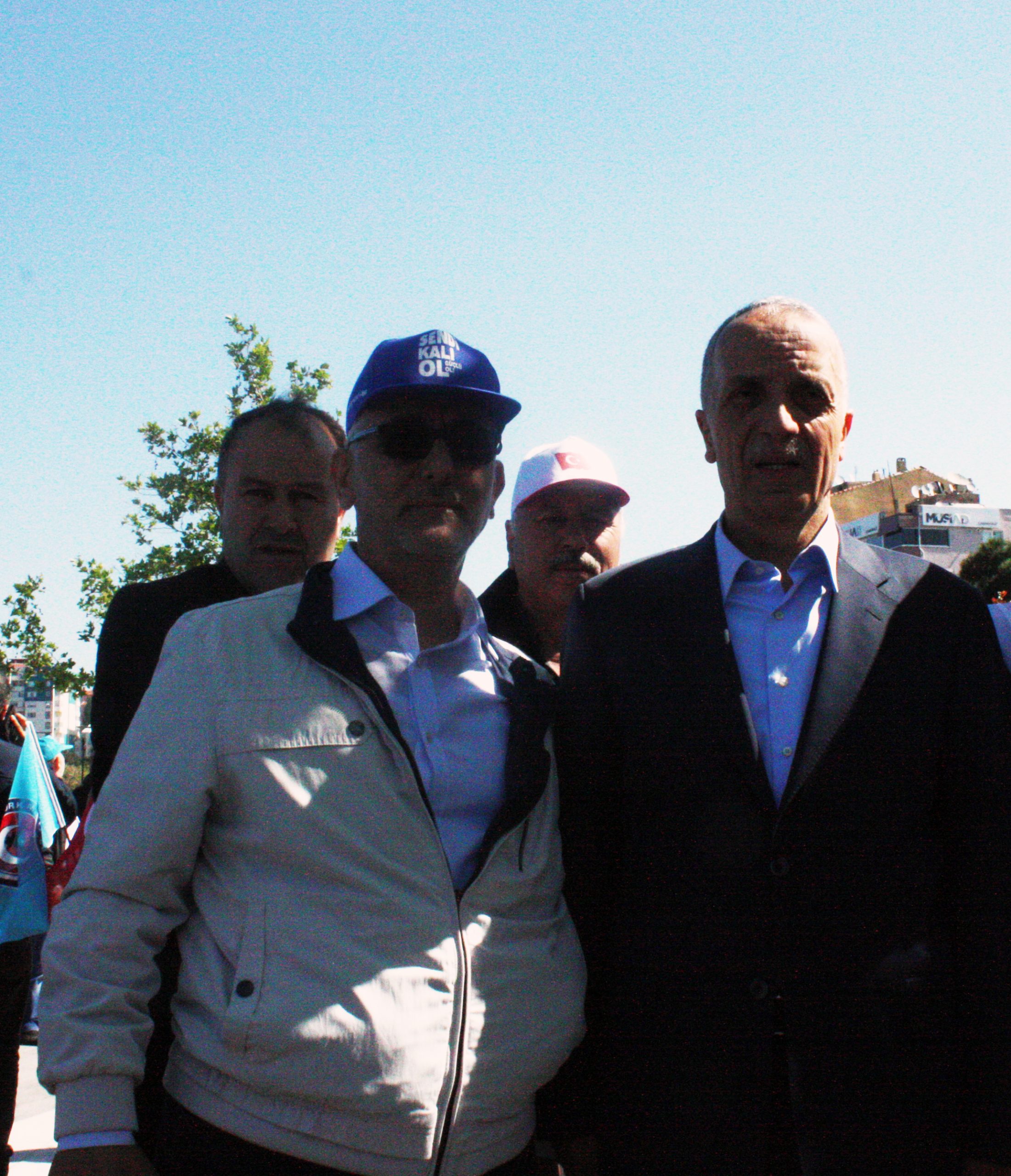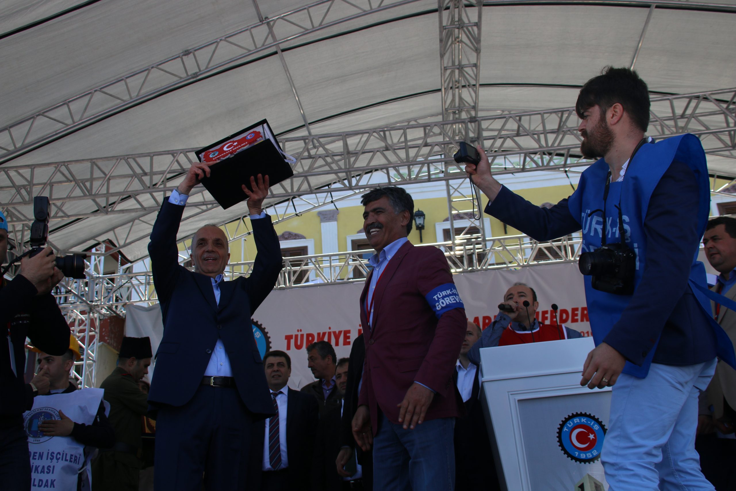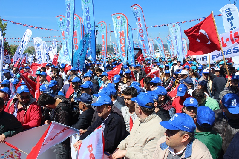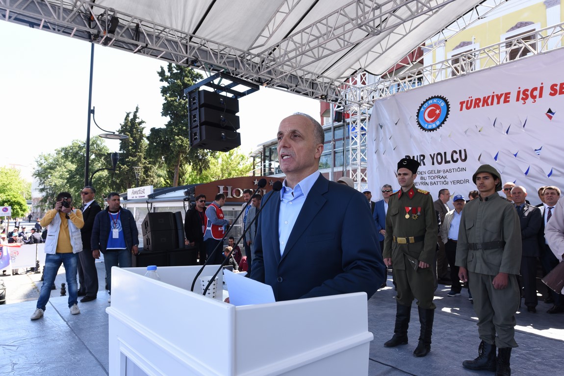 Daha sonra Türk-İş Genel Başkanı Ergün Atalay alandaki işçilere hitap etti. Türkiye’de yaşanan terör olaylarına rağmen işçilerin alanlara çıktığını söyleyen Türk-İş Genel Başkanı Ergün Atalay, “Geçen hafta Çanakkale Kara savaşının 101. yıldönümüydü. 253 bin şehidimiz karşıki topraklarda yatıyor. Her gün ortalama 6 askerin şehit olduğu bir ülkedeyiz. Şu anda Çanakkale Savaşı hâlâ devam ediyor. Katiller bugün Gaziantep’te polislerimizi ve sivil vatandaşlarımızı şehit ettiler. Ayrıca katiller bugün 3 askerimizi şehit ettiler. Dışarıdaki insanlar, hainlerle beraber ülkeyi karıştırmaya devam ediyorlar. Vatan yoksa, ülke yoksa, sendika da yok, parti de yok, dernek de yok, oda da yok. Yaşamak yok. Buradan Türkiye’ye sesleniyorum, hainlere sesleniyorum, onun ağa babalarına sesleniyorum; aklınızı başınıza alın. Ülkemizi karıştırmayın, ülkemizi bölmeye gayret etmeyin. Bundan 100 sene evvel dedelerimiz buna fırsat vermedi. Biz de vermeyiz, Türk-İş buna izin vermez.” dedi.