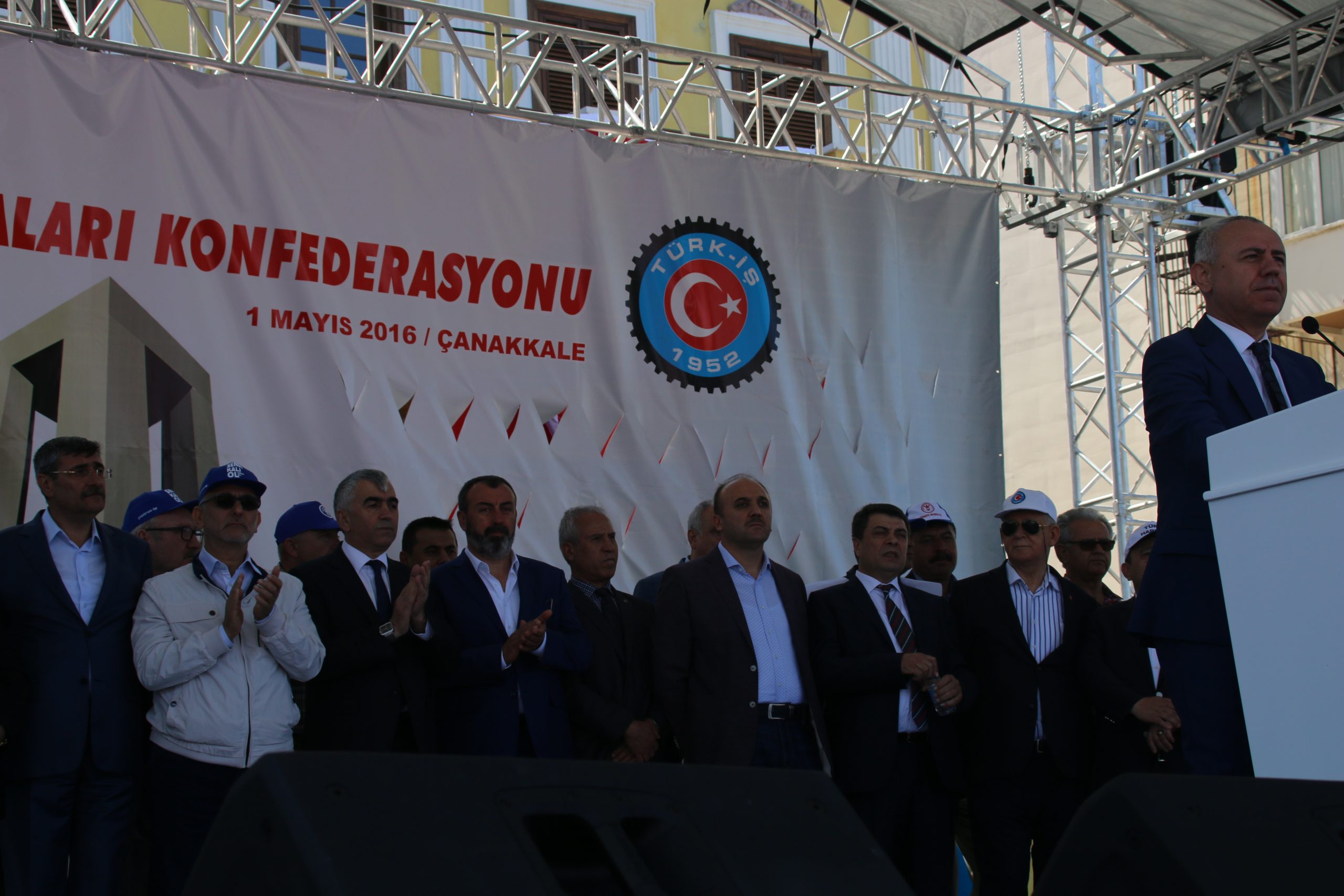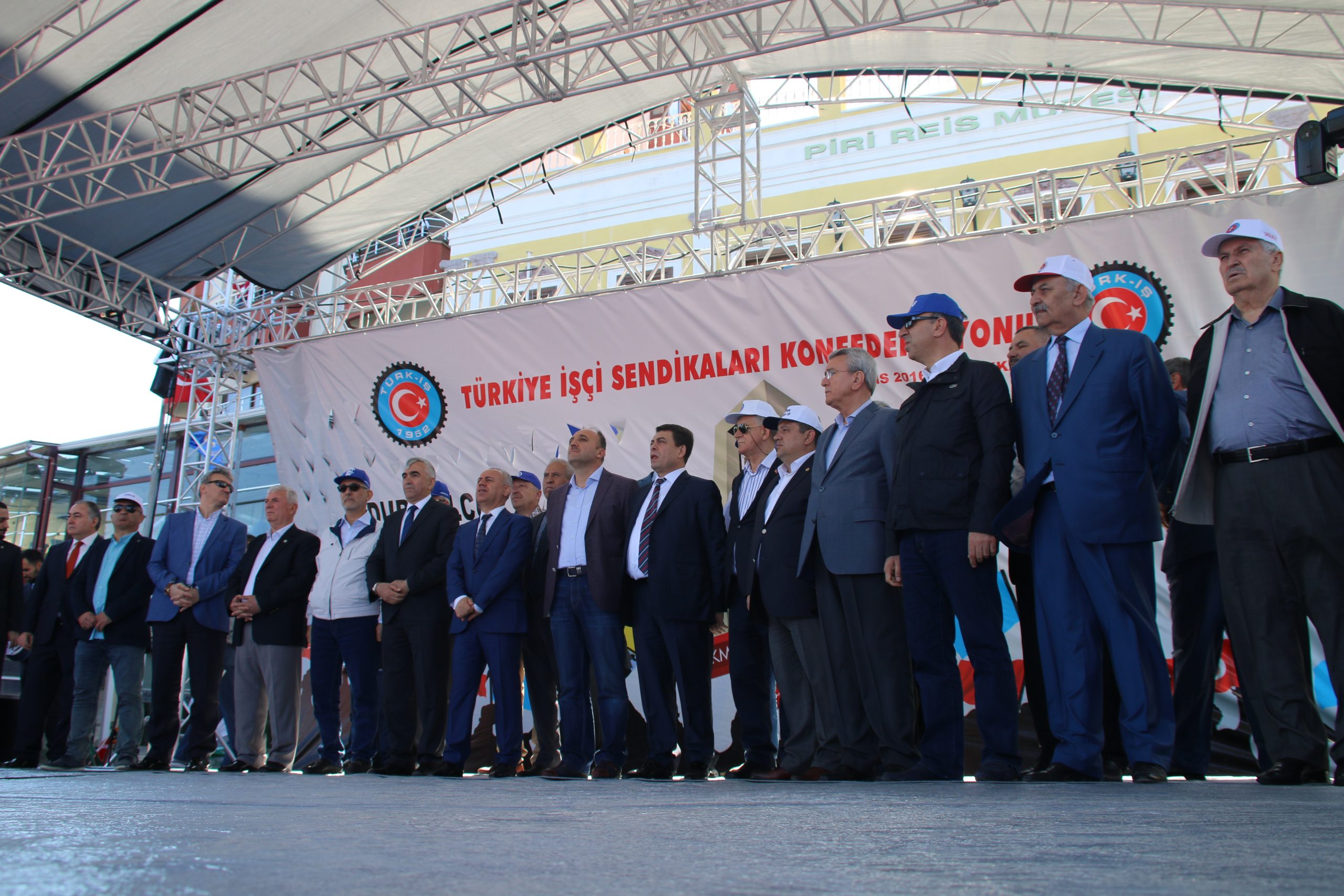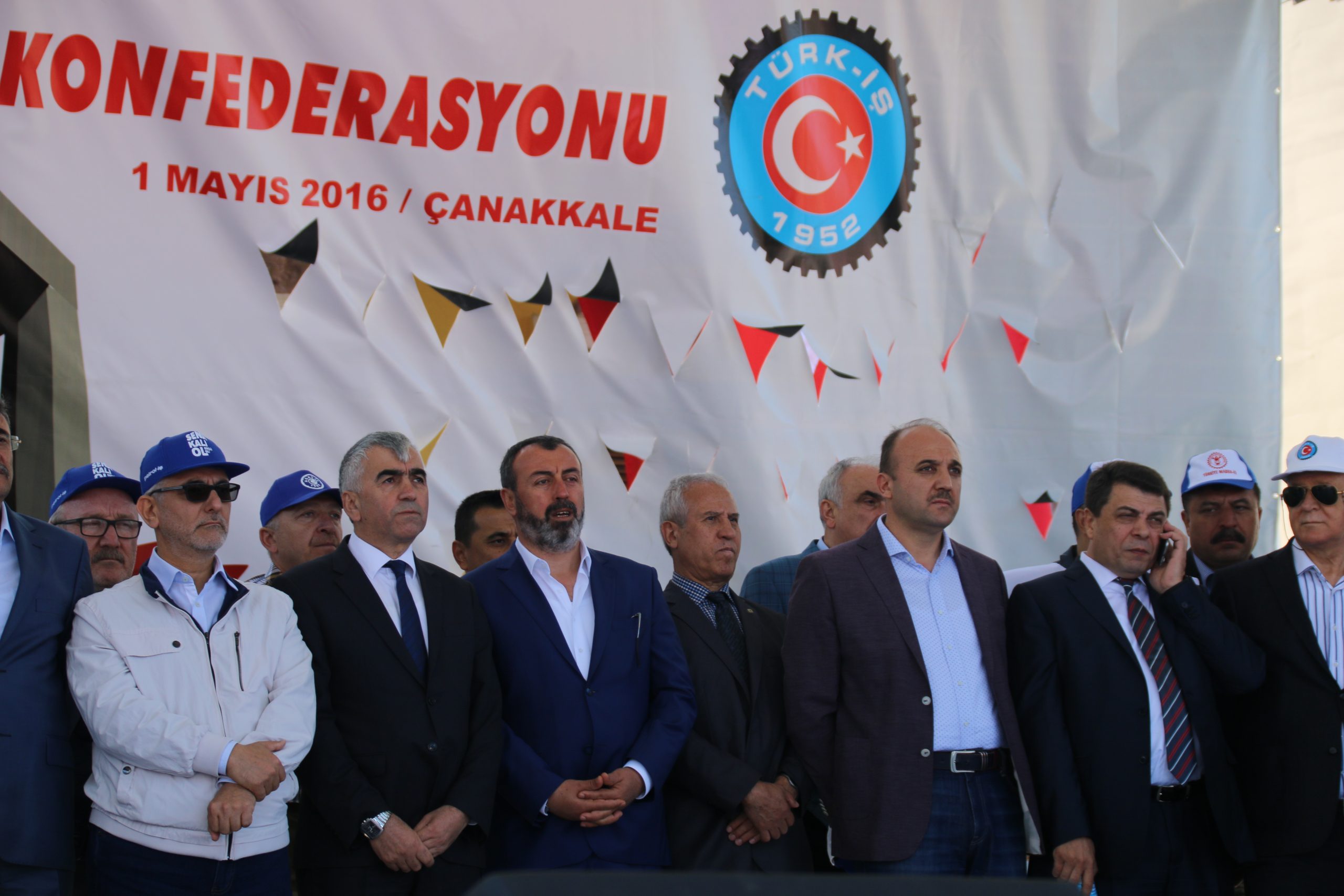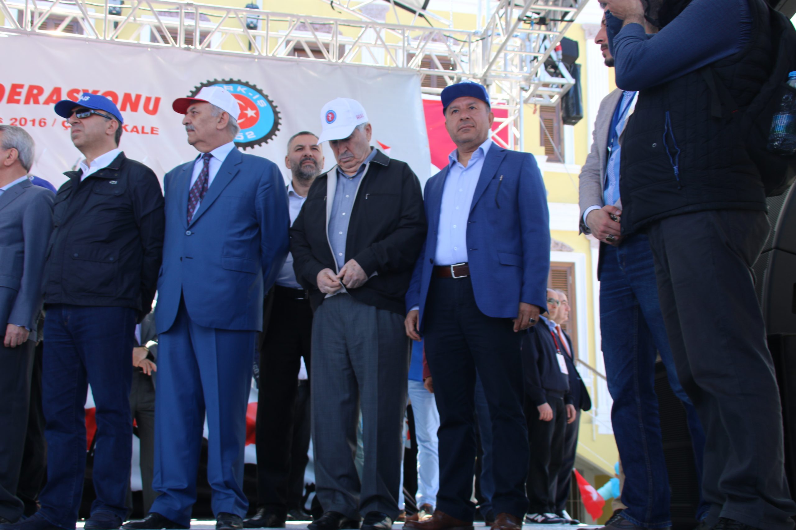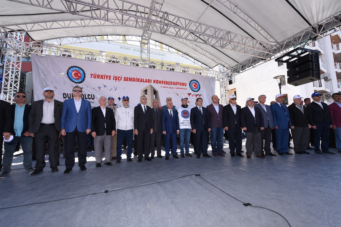 En önde Türk-İş’e bağlı tüm sendikaların genel başkanlarının aralarında Genel Başkanımız Ali Ufuk Yaşar’ın bulunduğu kortej ile Kordon’a kadar yapılan yürüyüşün ardından saat 10.30’da iskeledeki miting meydanına ulaşıldı. Kordon’da yer alan Piri Reis Müzesi önüne büyük bir platform kuruldu. 20 bine yakın işçi bu alanda bir araya geldi. Kortejin alana ulaşmasının ardından Türk-İş Genel Teşkilatlandırma Sekreteri ve Koop-İş Genel Başkanı Eyüp Alemdar açılış konuşmasını yaptı. Alemdar’dan sonra ise Türk-İş Genel Sekreteri ve Türk Metal Genel Başkanı Pevrul Kavlak konuştu. On binlerce emekçiye seslenen Kavlak, konuşmasında Çanakkale’de verilen şanlı direnişe değinerek, Türk işçi hareketinin de verdiği mücadelelerden zaferle ayrılacağını ifade etti.