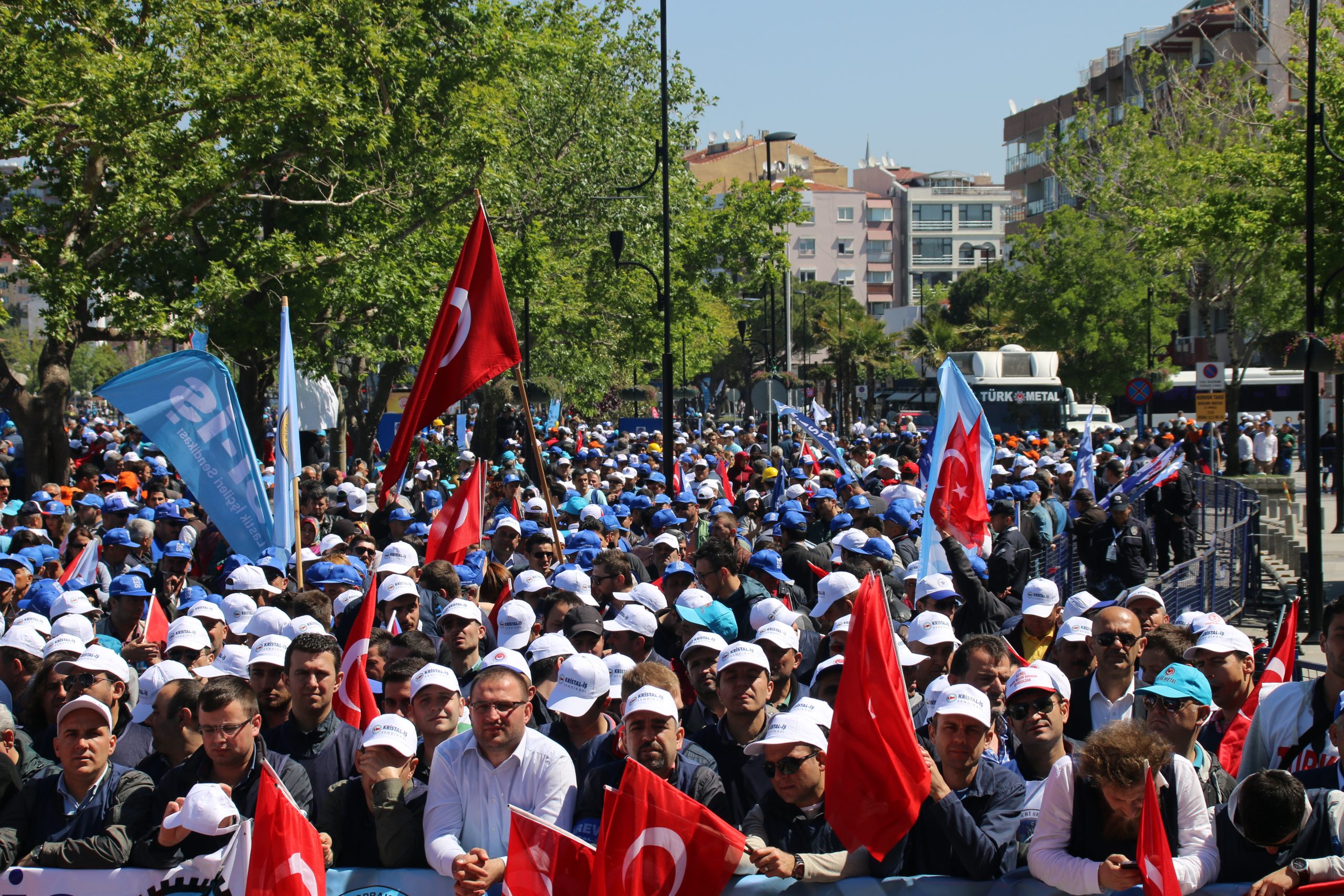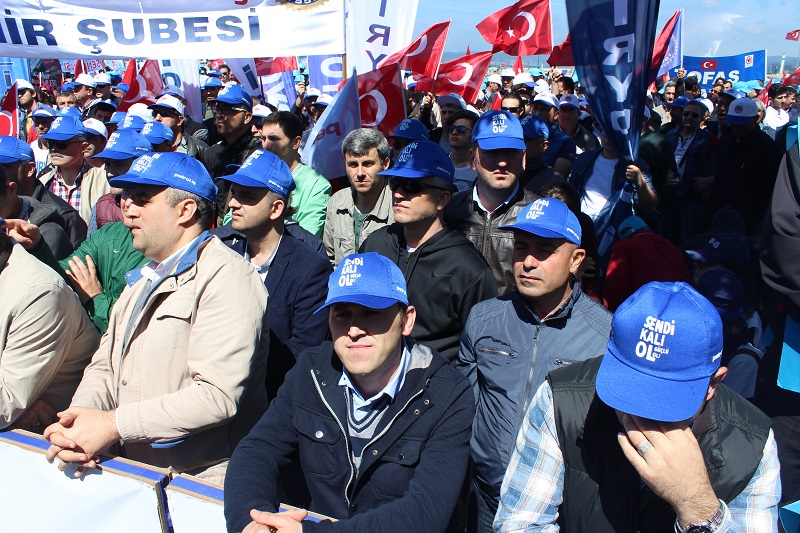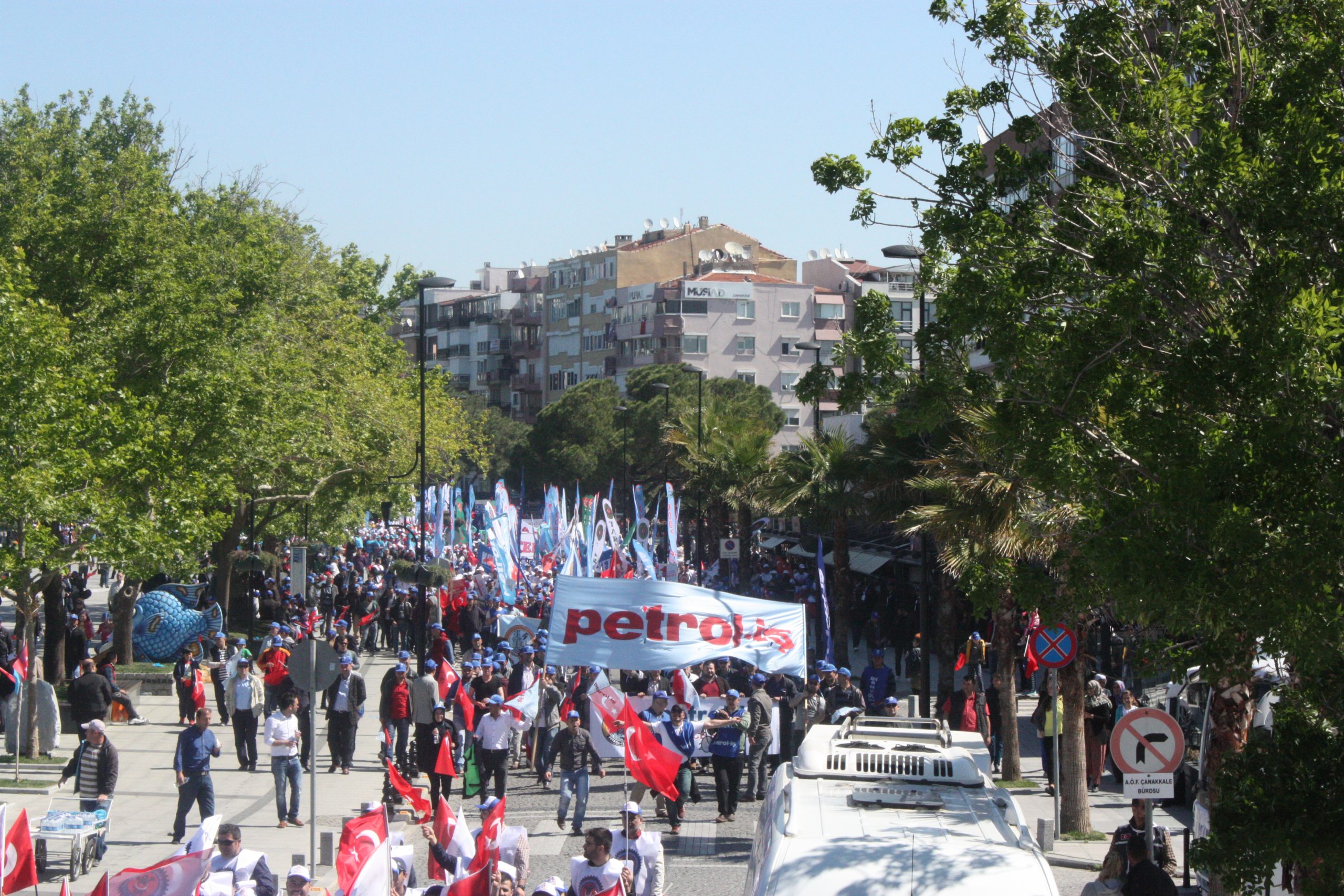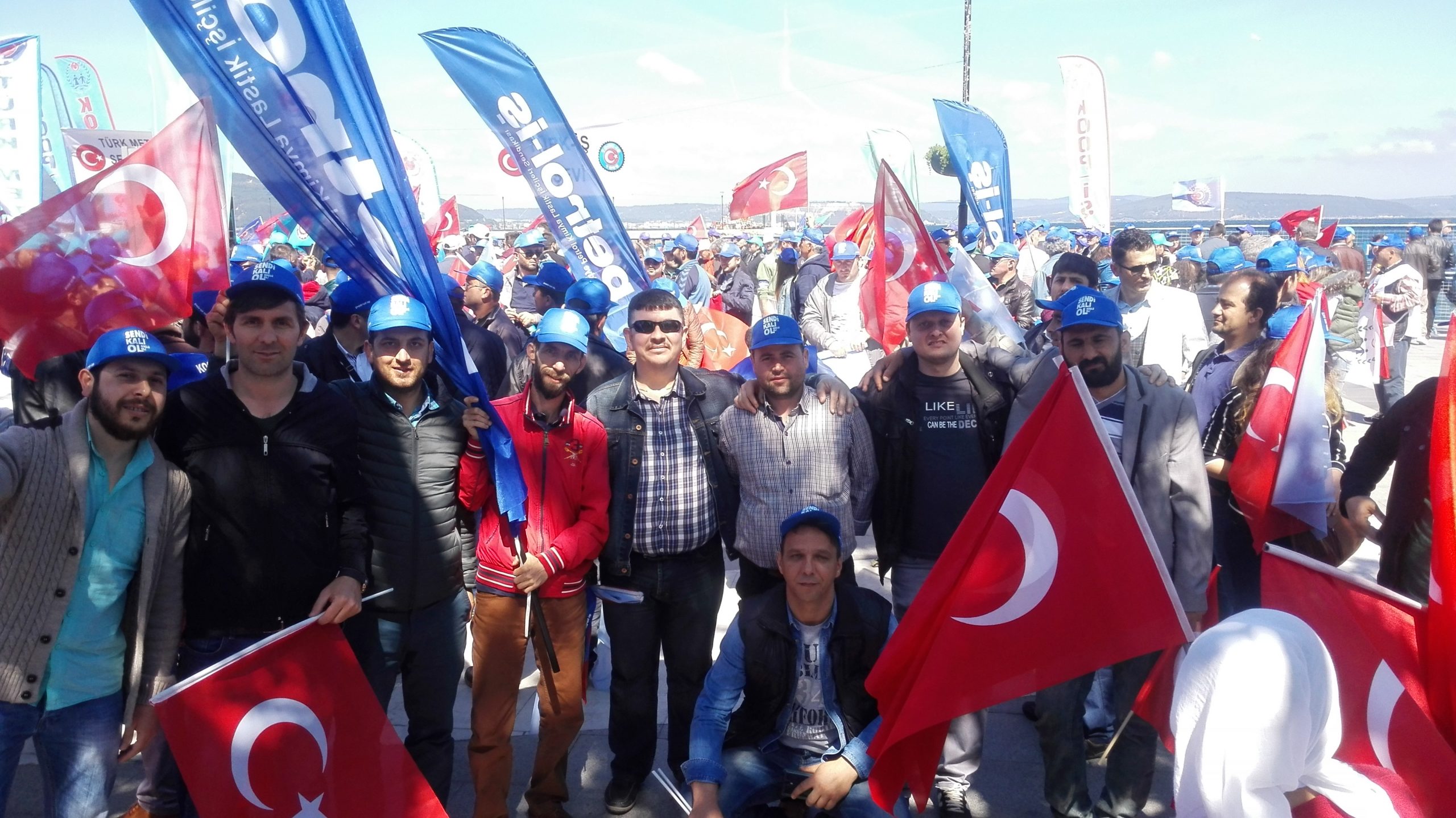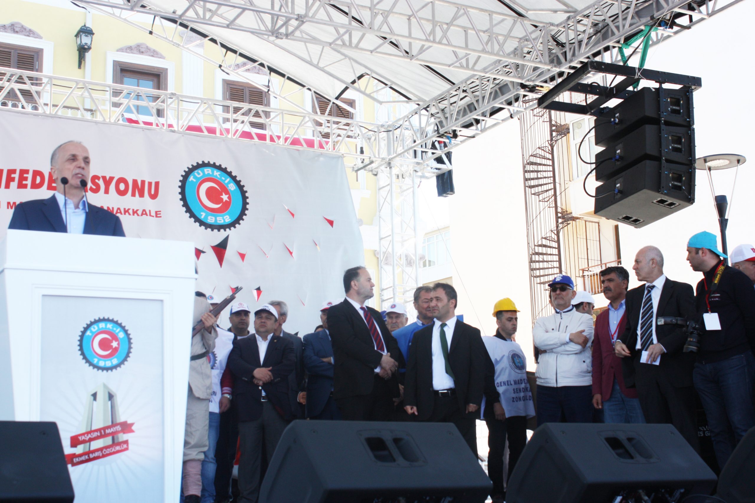 En önde Türk-İş’e bağlı tüm sendikaların genel başkanlarının aralarında Genel Başkanımız Ali Ufuk Yaşar’ın bulunduğu kortej ile Kordon’a kadar yapılan yürüyüşün ardından saat 10.30’da iskeledeki miting meydanına ulaşıldı. Kordon’da yer alan Piri Reis Müzesi önüne büyük bir platform kuruldu. 20 bine yakın işçi bu alanda bir araya geldi. Kortejin alana ulaşmasının ardından Türk-İş Genel Teşkilatlandırma Sekreteri ve Koop-İş Genel Başkanı Eyüp Alemdar açılış konuşmasını yaptı. Alemdar’dan sonra ise Türk-İş Genel Sekreteri ve Türk Metal Genel Başkanı Pevrul Kavlak konuştu. On binlerce emekçiye seslenen Kavlak, konuşmasında Çanakkale’de verilen şanlı direnişe değinerek, Türk işçi hareketinin de verdiği mücadelelerden zaferle ayrılacağını ifade etti.