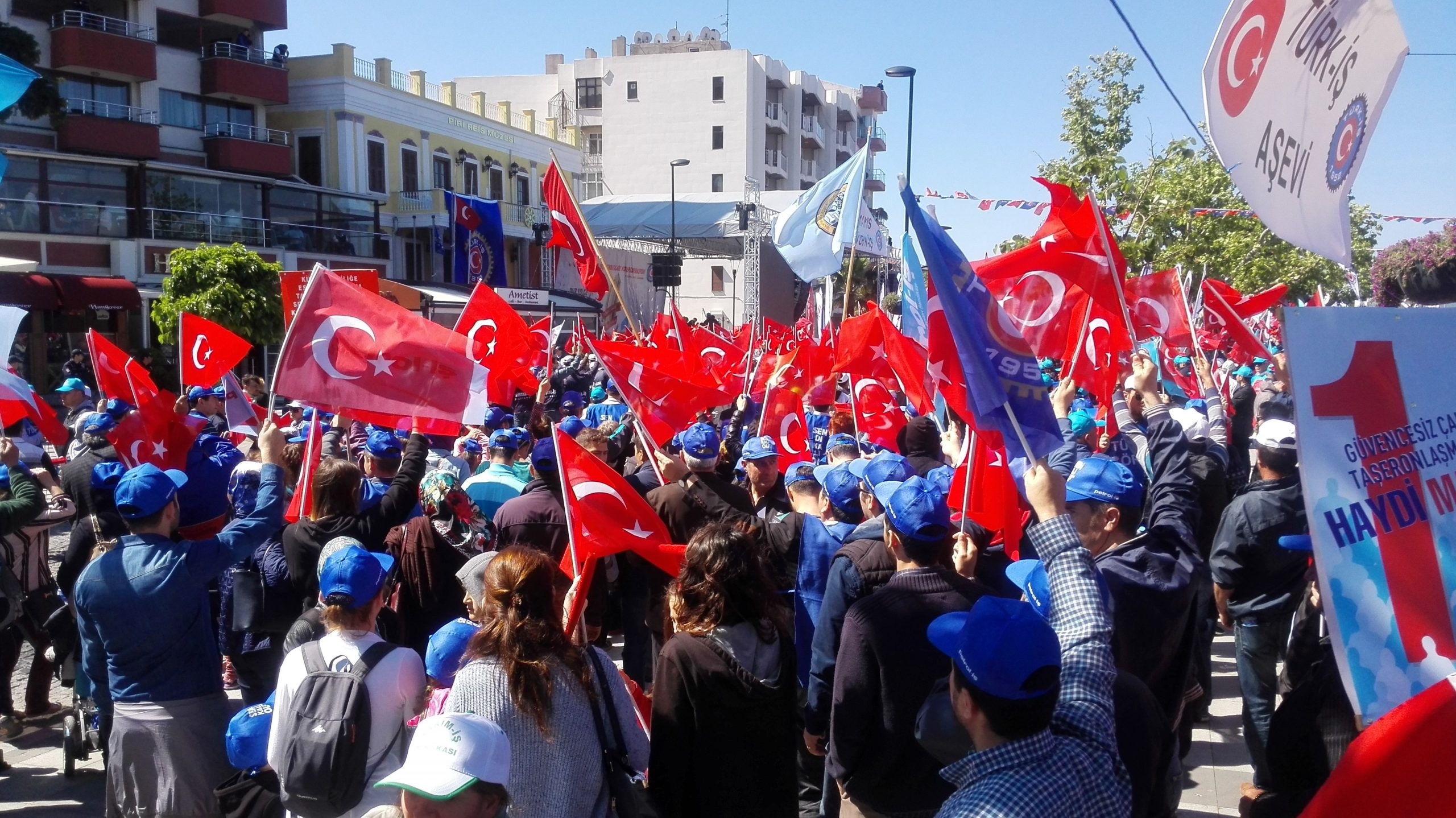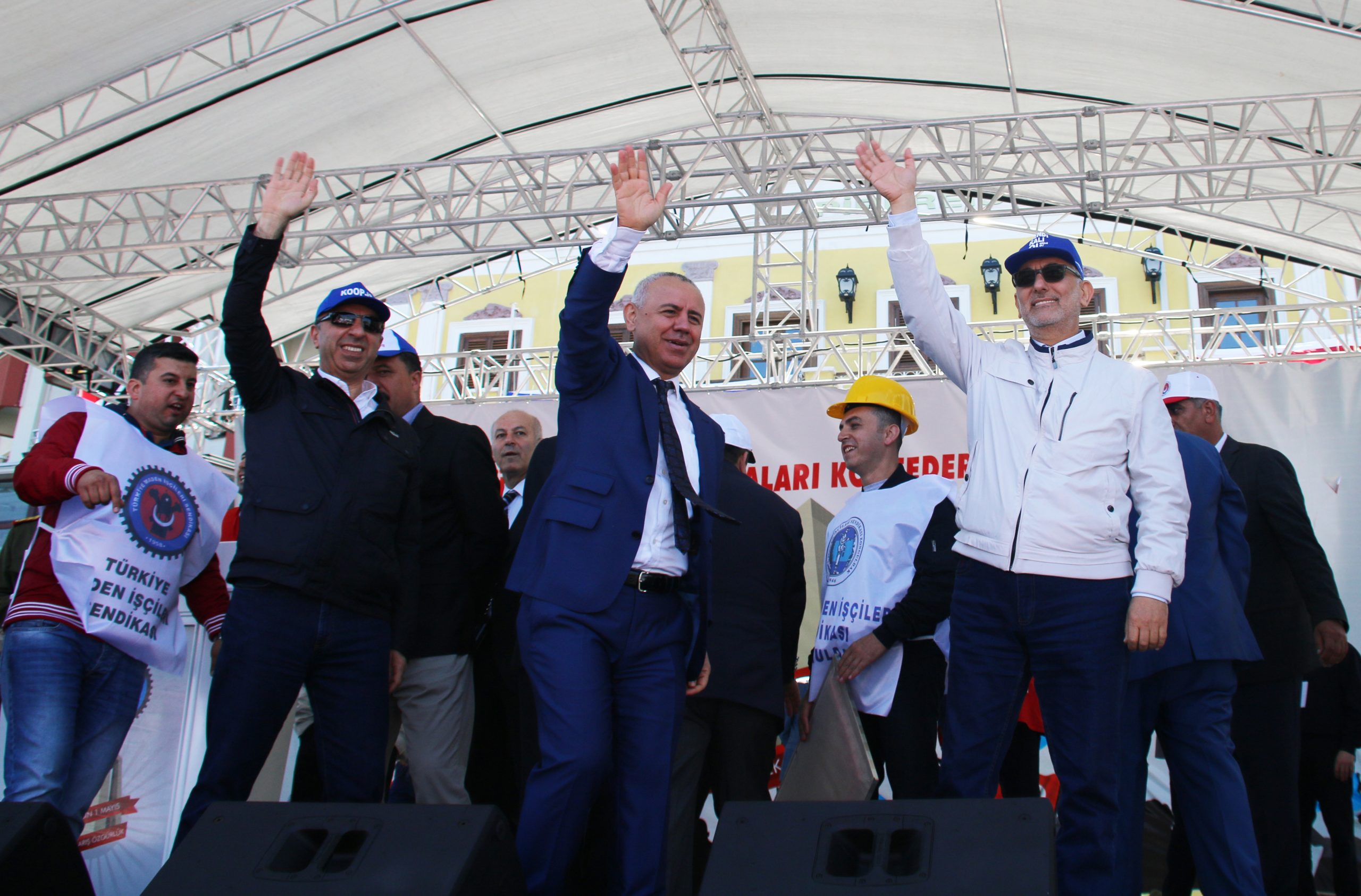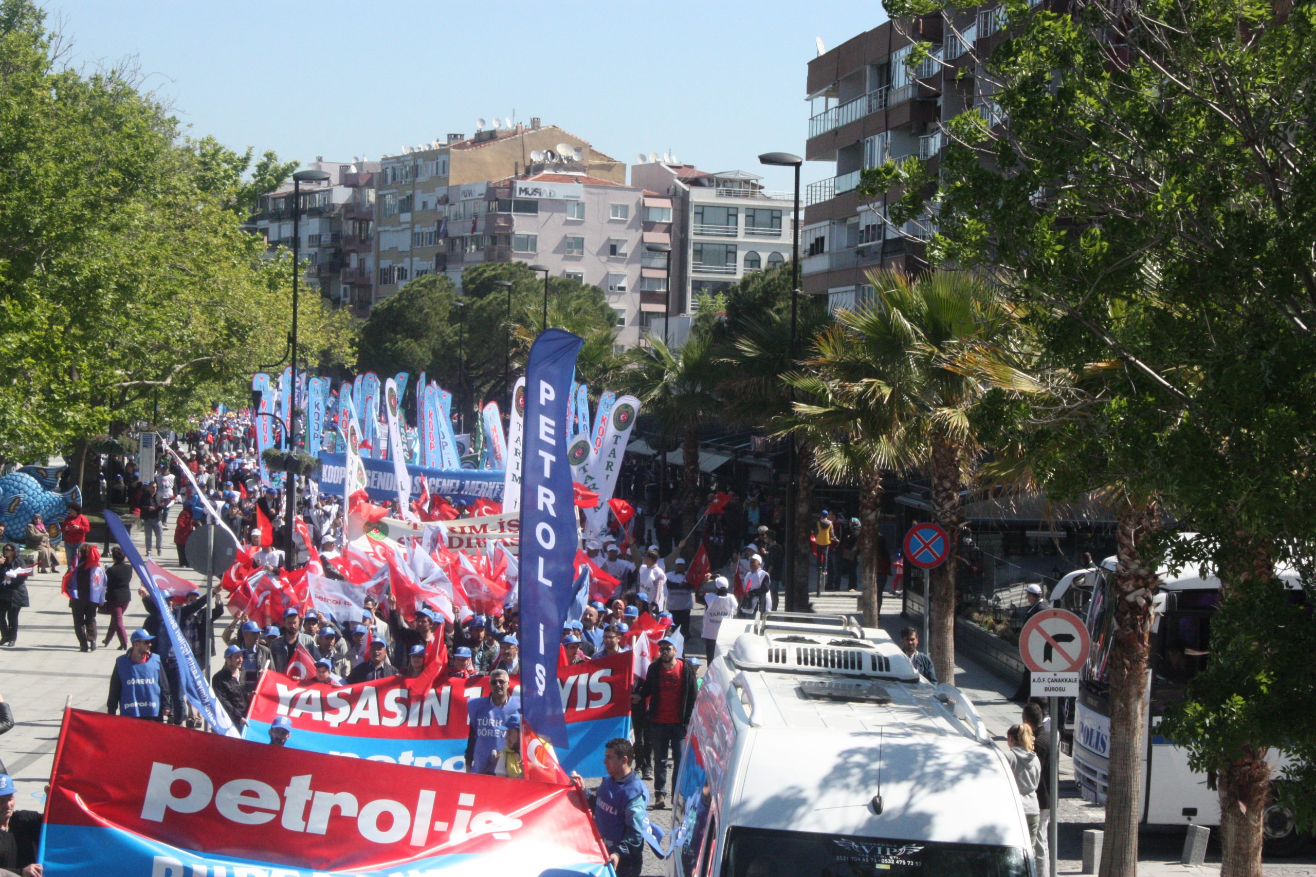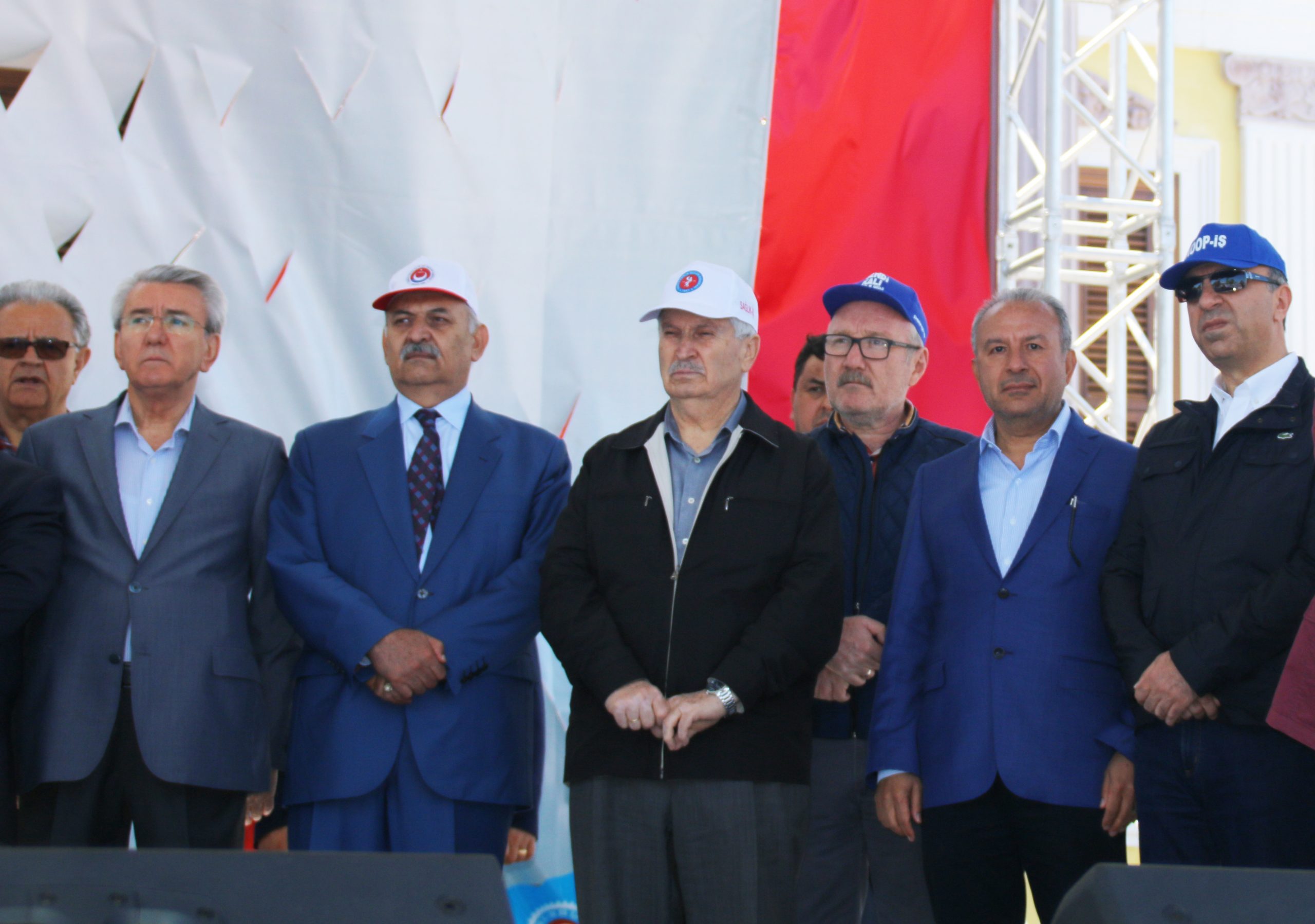 En önde Türk-İş’e bağlı tüm sendikaların genel başkanlarının aralarında Genel Başkanımız Ali Ufuk Yaşar’ın bulunduğu kortej ile Kordon’a kadar yapılan yürüyüşün ardından saat 10.30’da iskeledeki miting meydanına ulaşıldı. Kordon’da yer alan Piri Reis Müzesi önüne büyük bir platform kuruldu. 20 bine yakın işçi bu alanda bir araya geldi. Kortejin alana ulaşmasının ardından Türk-İş Genel Teşkilatlandırma Sekreteri ve Koop-İş Genel Başkanı Eyüp Alemdar açılış konuşmasını yaptı. Alemdar’dan sonra ise Türk-İş Genel Sekreteri ve Türk Metal Genel Başkanı Pevrul Kavlak konuştu. On binlerce emekçiye seslenen Kavlak, konuşmasında Çanakkale’de verilen şanlı direnişe değinerek, Türk işçi hareketinin de verdiği mücadelelerden zaferle ayrılacağını ifade etti.