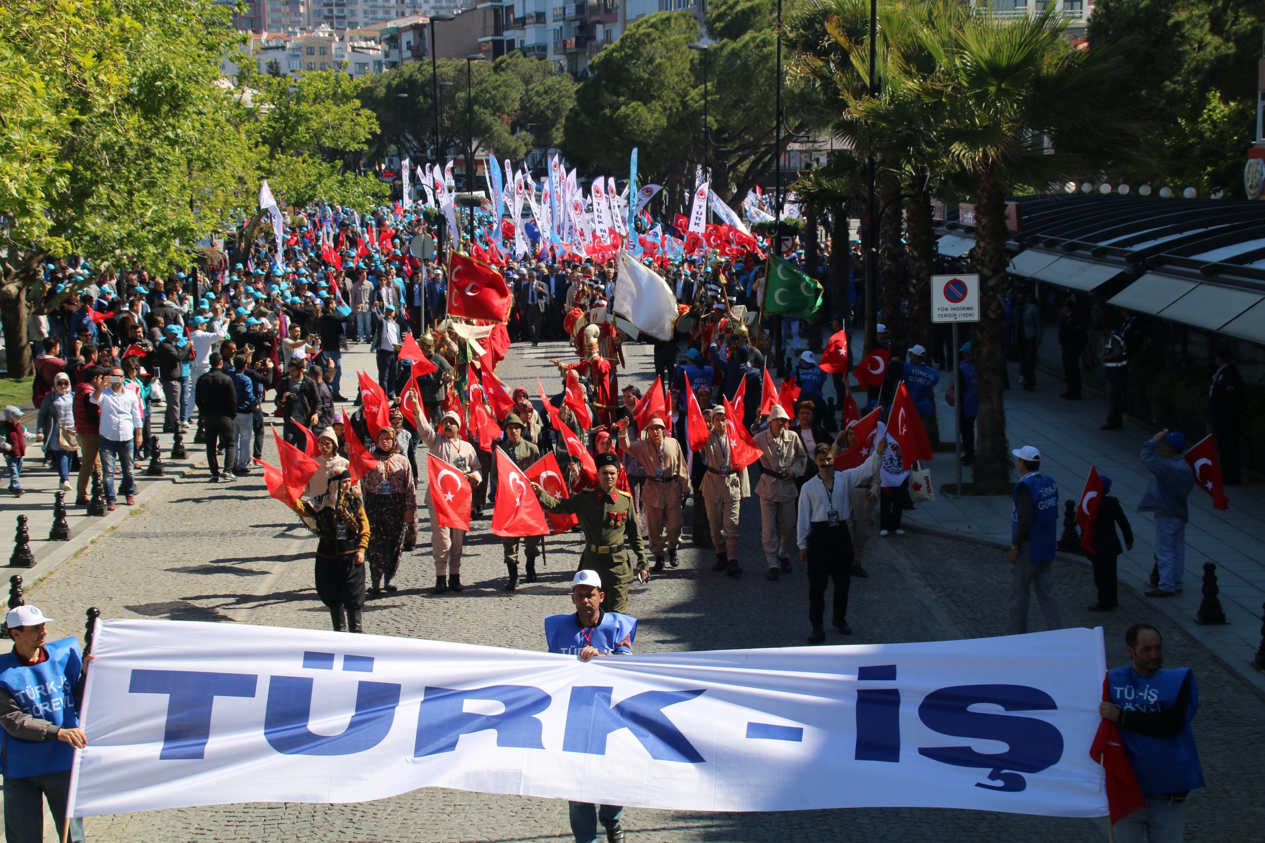 Çanakkale’deki 1 Mayıs kutlamasına Türk-İş’e bağlı sendikalardan yoğun katılım sağlanırken yürüyüş esnasında korteje yöresel halk kıyafetleri giymiş gençler, Çanakkale ruhunu temsilen askerler ve Mehter Takımı eşlik etti.