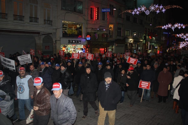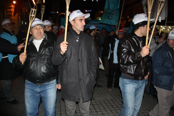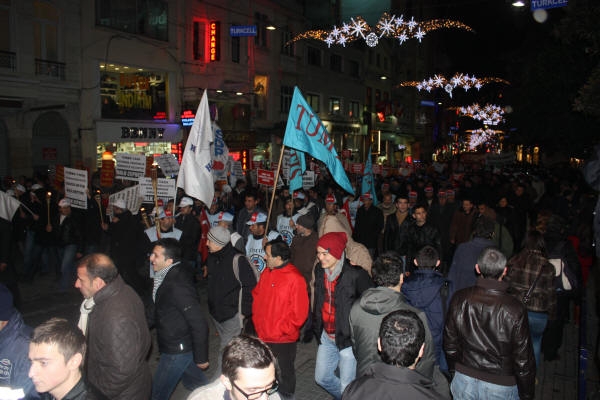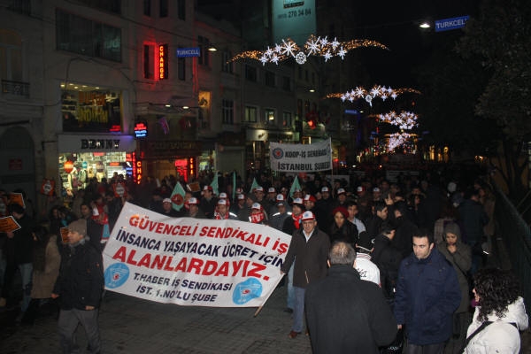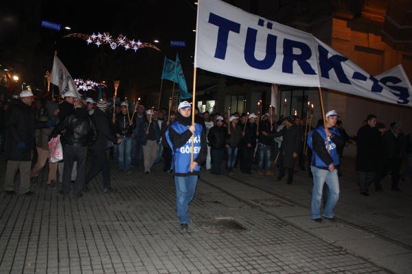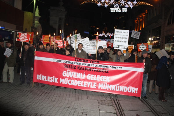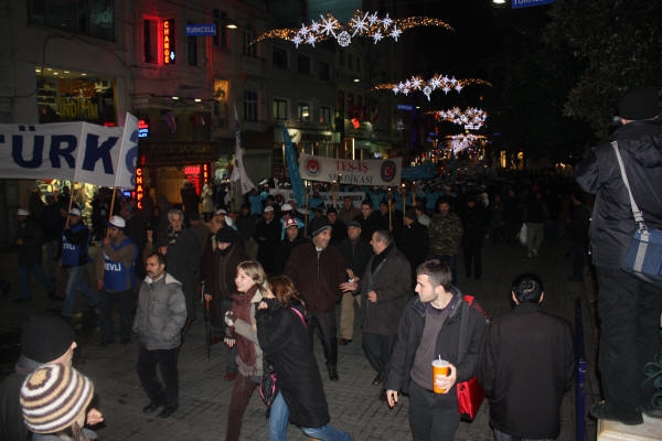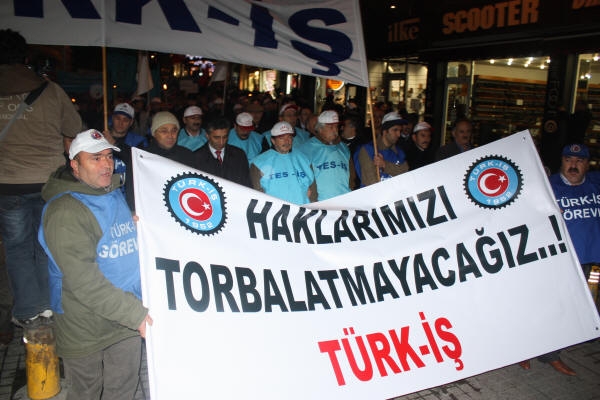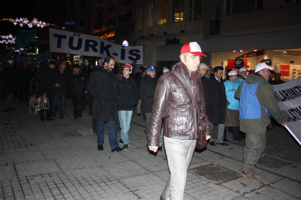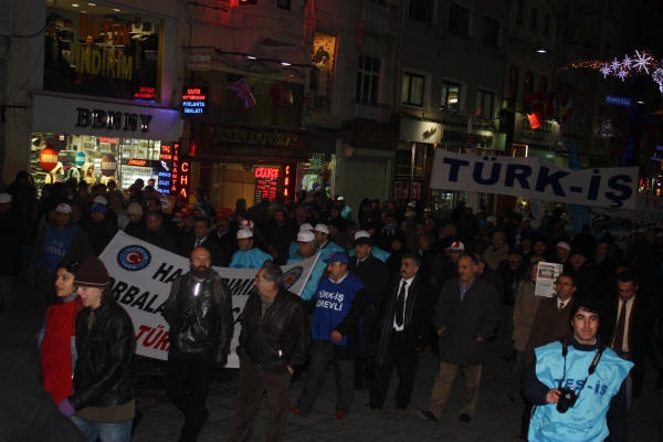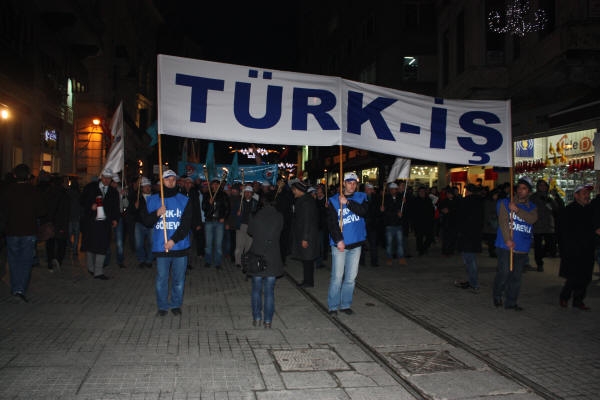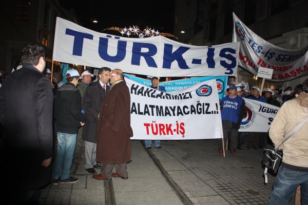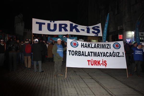 “Haklarımızı Torbalatmayacağız” yazılı Türk-İş pankartı ardında, Beyoğlu-Tünel’den Taksim Meydanı’na doğru saat 18.00’de yürüyüşe geçen kitle “Hükümet torbanı al başına çal”, “Emekçiyiz, haklıyız, kazanacağız”, “Direne direne kazanacağız”, “Haklarımızı gasp edemezsiniz”, “Üreten biziz, yöneten de biz olacağız”, “Güvenceli iş, güvenceli yaşam” sloganları atarak siyasi iktidarı protesto ettiler. Eyleme katılanlar “Torbayı AKP’nin başına geçirelim”, “ “Torbayı başımıza geçirip haklarımızı gasp edemezsiniz”, “Torba Yasaya karşı genel grev genel direniş”, “Kölece çalışmaya, kölece çalışmaya hayır” dövizleri taşıdılar.