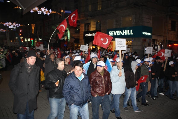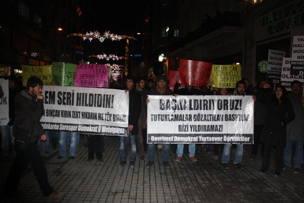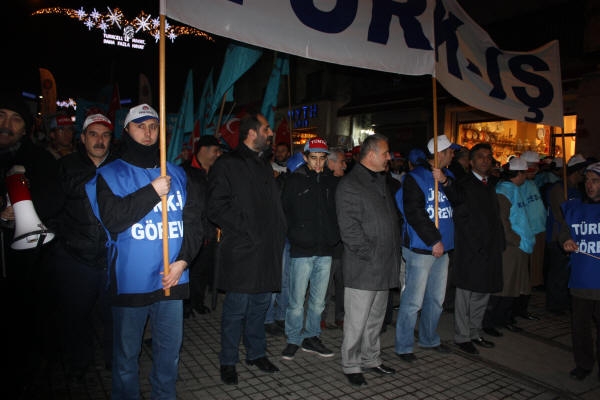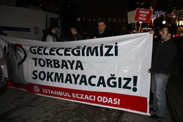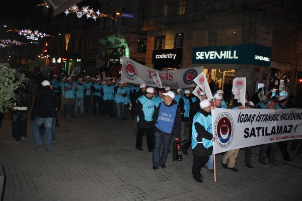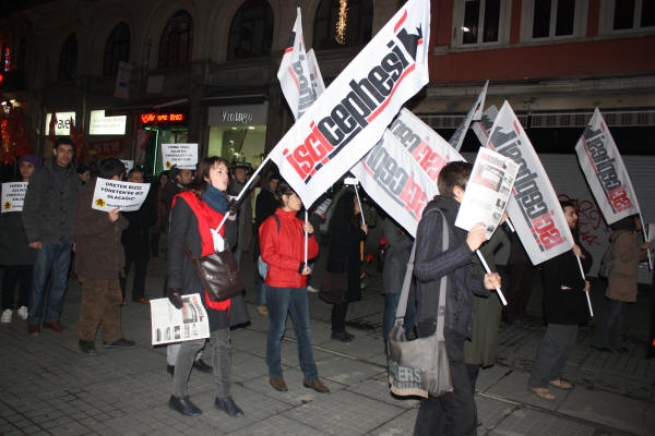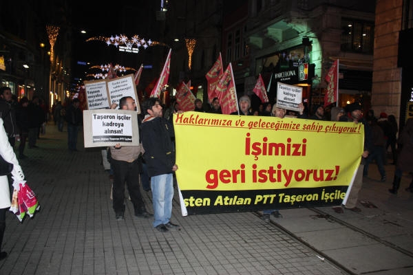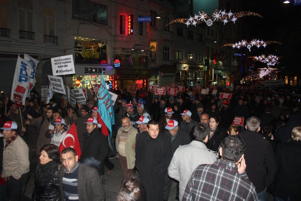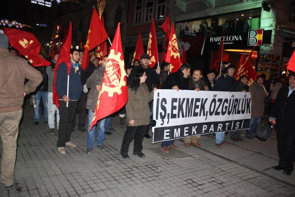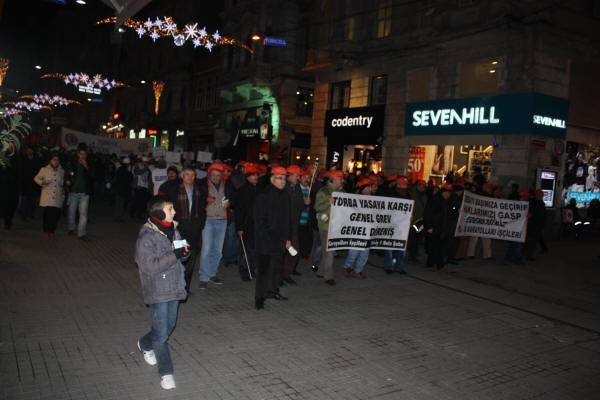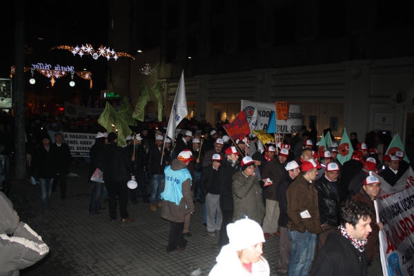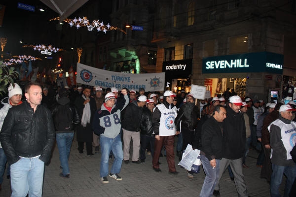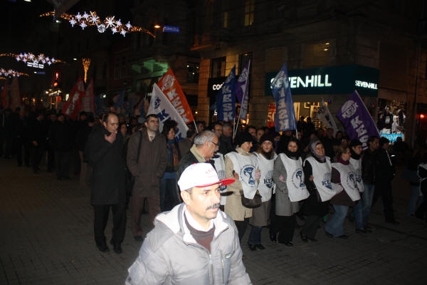 “Haklarımızı Torbalatmayacağız” yazılı Türk-İş pankartı ardında, Beyoğlu-Tünel’den Taksim Meydanı’na doğru saat 18.00’de yürüyüşe geçen kitle “Hükümet torbanı al başına çal”, “Emekçiyiz, haklıyız, kazanacağız”, “Direne direne kazanacağız”, “Haklarımızı gasp edemezsiniz”, “Üreten biziz, yöneten de biz olacağız”, “Güvenceli iş, güvenceli yaşam” sloganları atarak siyasi iktidarı protesto ettiler. Eyleme katılanlar “Torbayı AKP’nin başına geçirelim”, “ “Torbayı başımıza geçirip haklarımızı gasp edemezsiniz”, “Torba Yasaya karşı genel grev genel direniş”, “Kölece çalışmaya, kölece çalışmaya hayır” dövizleri taşıdılar.