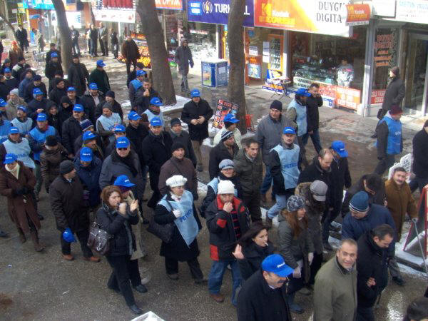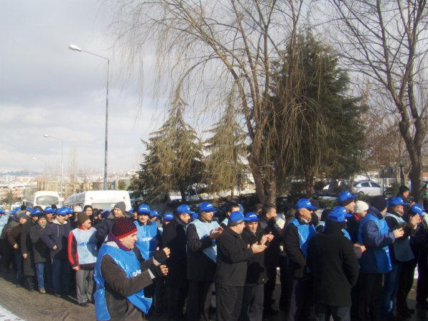 Konfederasyonumuz Türk-İş ile birlikte 6 konfederasyonun Tekel işçisine destek olmak, dayanışma göstermek ve işçilere yönelik tüm saldırılara karşı 4 Şubat 2010 Perşembe günü için aldığı iş bırakma eylemi Ankara Şubemize bağlı işyerlerimizde başarı ile gerçekleştirildi. Sabah işyerlerine gelerek işbaşı yapmayan üyelerimiz saat 10.00’da servislerle Çalışma Bakanlığı önüne geldiler. Yüzlerce üyemiz Türk-İş Genel Merkezi önündeki Tekel işçilerini ziyaret etmek amacıyla harekete geçtiler.