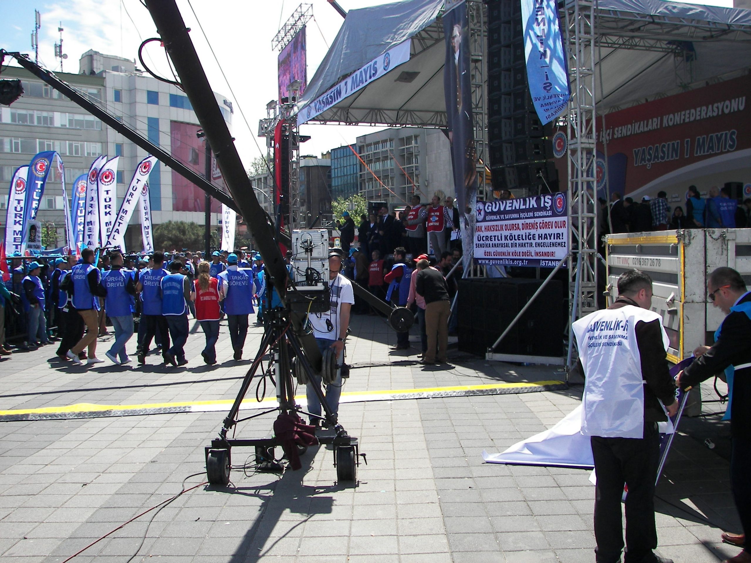 En önde Türk-İş’e bağlı tüm sendikaların genel başkanlarının bulunduğu kortej yaklaşık bir saatlik yürüyüşün ardından saat 11.30’da iskeledeki miting meydanına ulaştı.