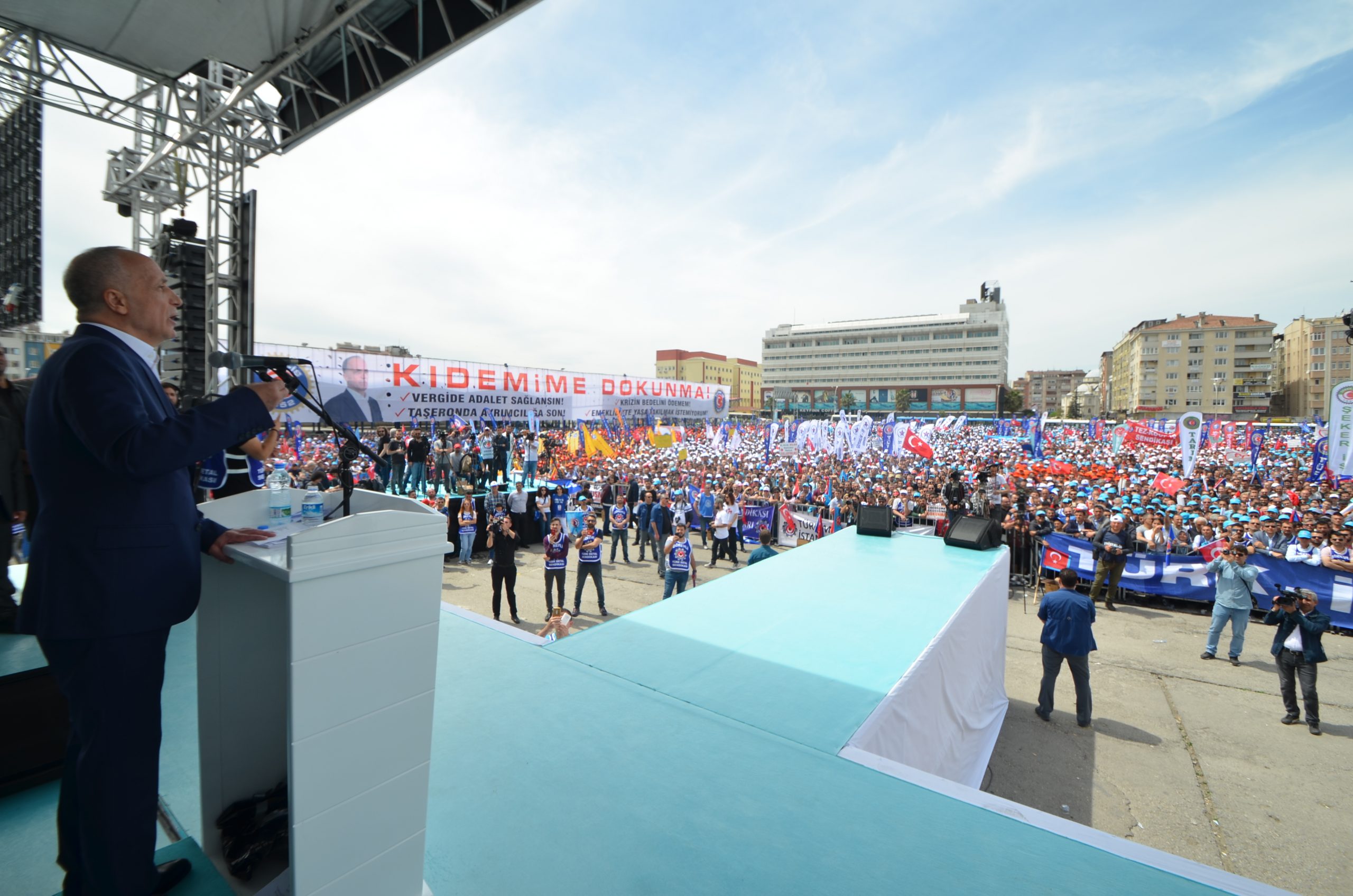 “Bu alandan Türkiye’yi yönetenlere sesleniyorum. Bu alandan Meclis’e, kamuoyuna sesleniyorum. 3 bin lira brüt ücret alan bir kardeşimiz 250 lira yemek parası, 250 lira yol parası, 3 bin 500 lira. Bu kardeşimiz 25 sene çalışabilirse alacağı kıdem 86 bin lira. TOKİ’den alt gelir grubuyla ilgili en düşük 50 metrekarelik konut 116 bin lira. Kıdem ile ilgili olumsuz bir çalışma yapmayın. Kıdemle ilgili nokta kadar geriye gidecek bir çalışma yapmayın. Kıdem bizim kızımızın çeyiz parası, oğlumuzun düğün parası. Kıdem bizim nefes almamızı sağlıyor, duymamızı sağlıyor. Kıdem bizim görmemizi sağlıyor. Kıdemin nokta kadar geri gidişini aklınıza getirmeyin. Mevcut yapıya nokta kadar dokundurmayız. Fon diyorlar, Size de ailenize de buradaki genel başkanlara da bana da fenalık geliyor. Geçmişte fonların akıbetini biliyoruz. Fon lafını ülke gündeminden çıkartın, her ramazan ayı gibi her sene kıdemi ülke gündemine getirmeyin. İş yerlerinde verimimiz düşüyor, evimizde huzurumuz kaçıyor. Huzurumuzu bozmayın, verimimizi düşürmeyin.