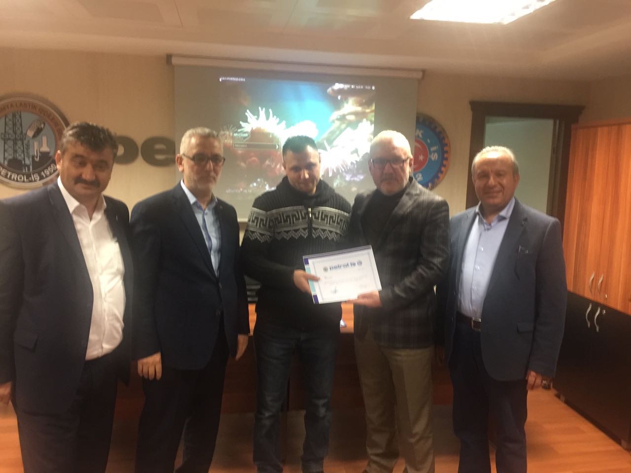 Genel Başkanımız Ali Ufuk Yaşar, Genel Sekreterimiz Ahmet Kabaca, Genel Yönetim Sekreterimiz Ünal Akbulut, İst 2 Nolu Şube Başkanımız Niyazi Recepkethüda, Şube Başkan Yardımcımız Satılmış Çilli, Şube Başkan Yardımcımız (Mali) Mehmet İldem’in katılımlarıyla 24 Şubat 2017 tarihinde, Petrol İş Marş Yarışmasında eseri ödüle layık görülen üyelerimize ödülleri veridi.