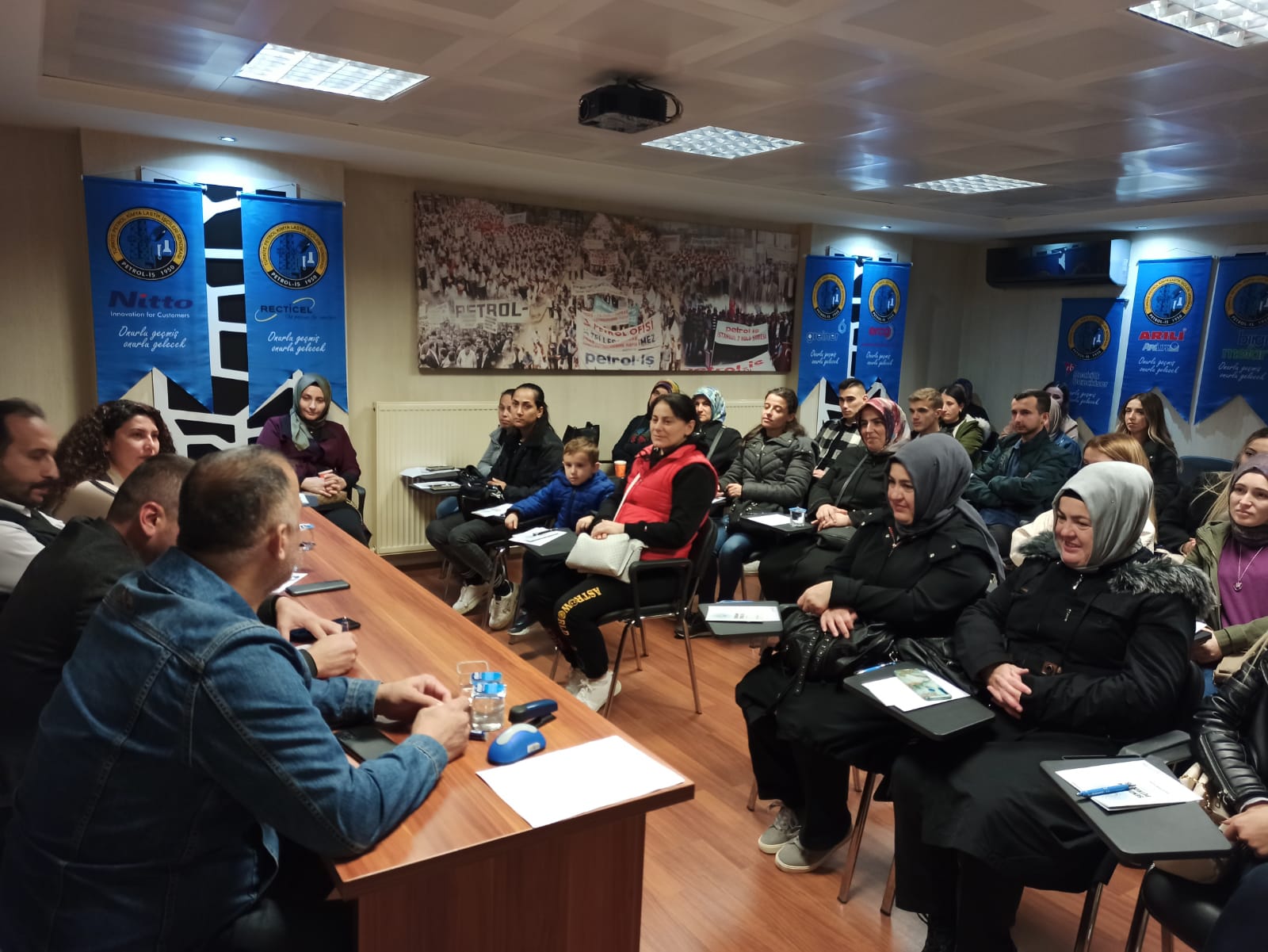 İki grup halinde yapılan eğitimlerin açış konuşmaları Şube Yönetim Kurulu tarafından gerçekleştirildi. Daha sonra üyelere “Sendika Nedir? Neden Sendikalı Olmalıyız? Toplu İş Sözleşmesi Nedir? Dayanışmanın Önemi” konuları aktarıldı.