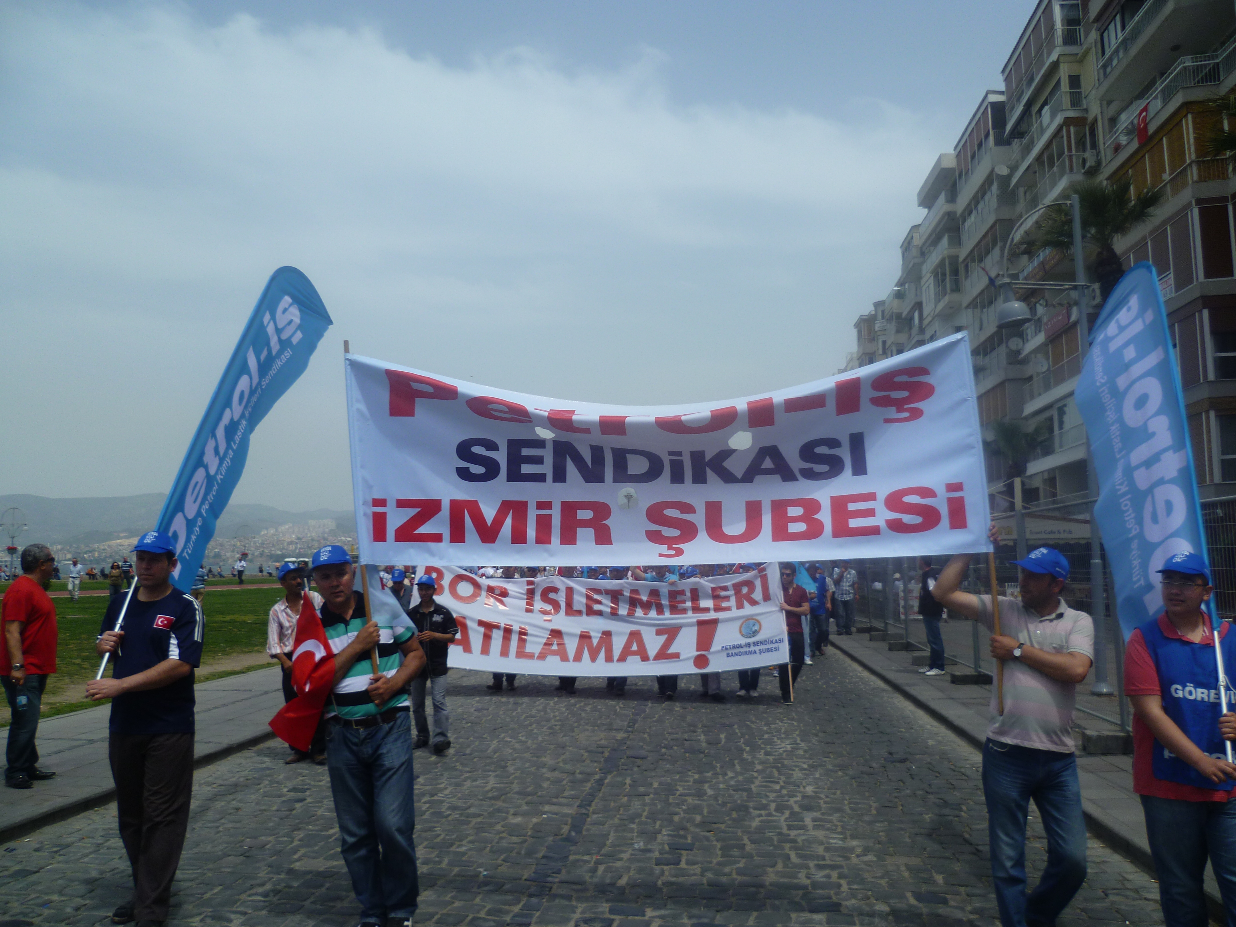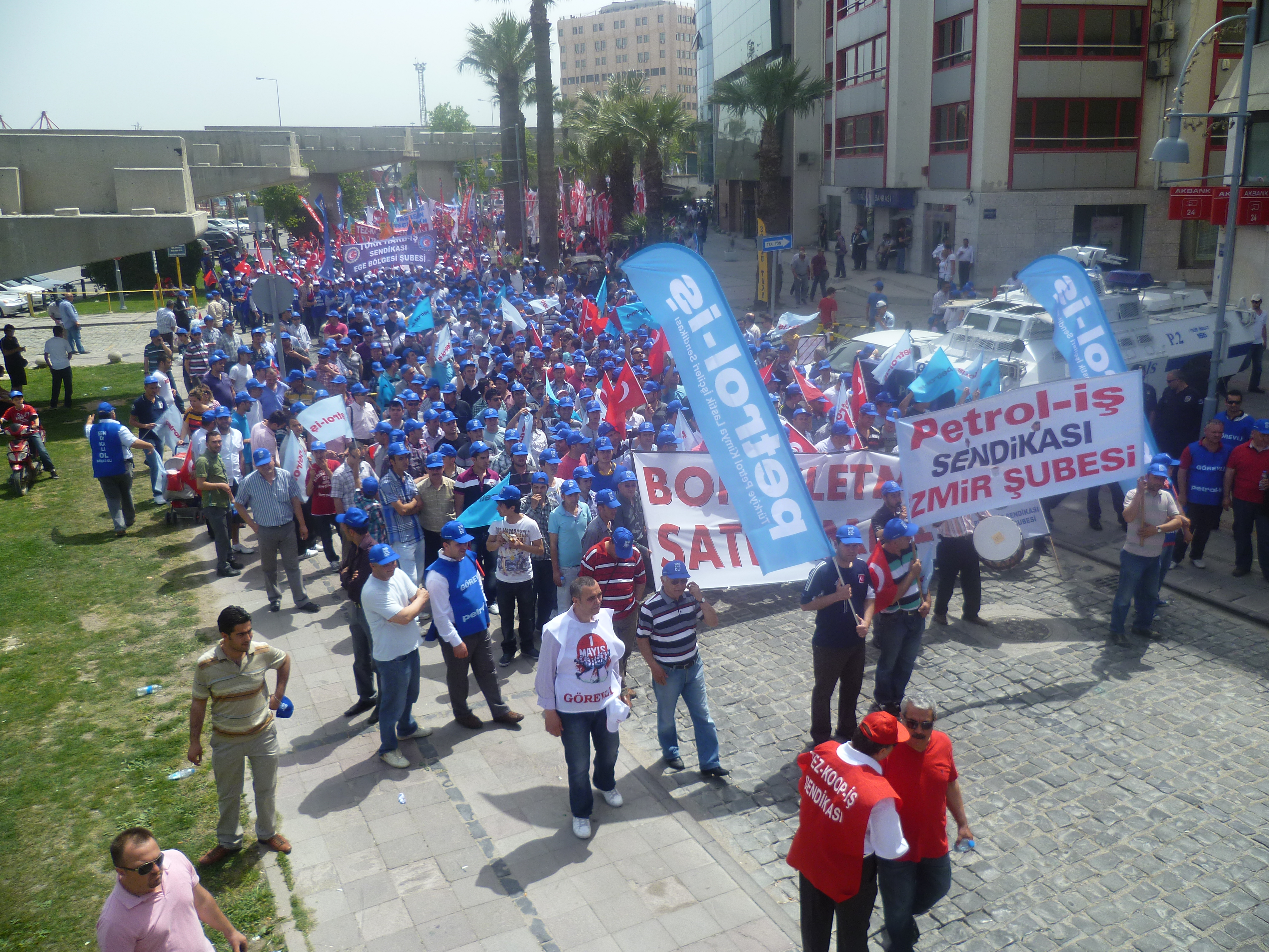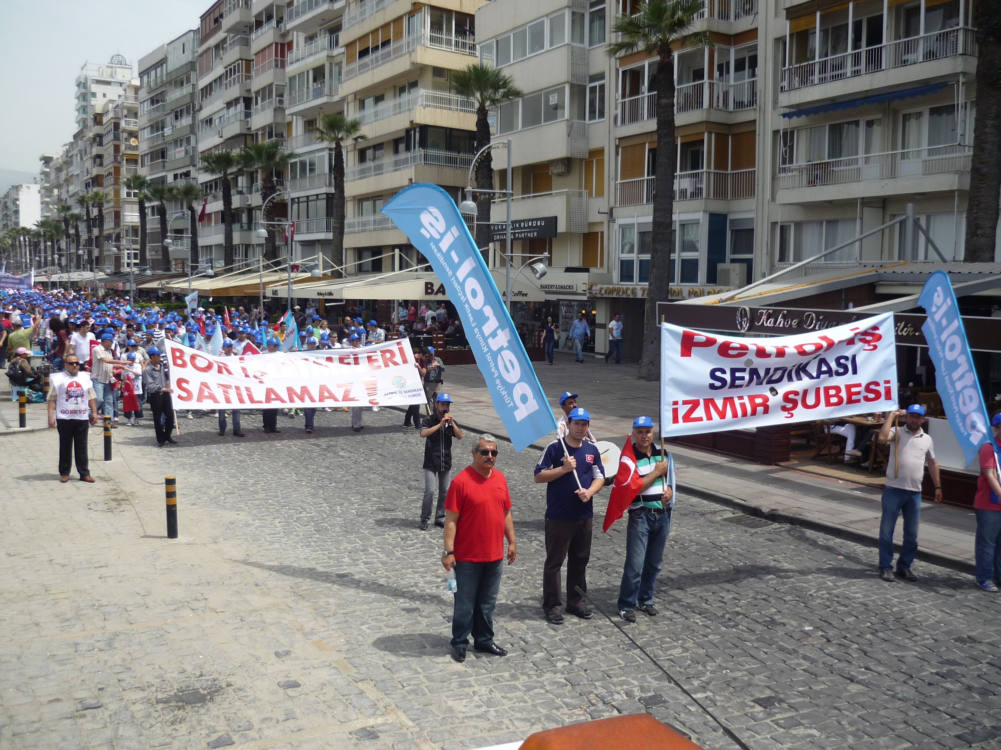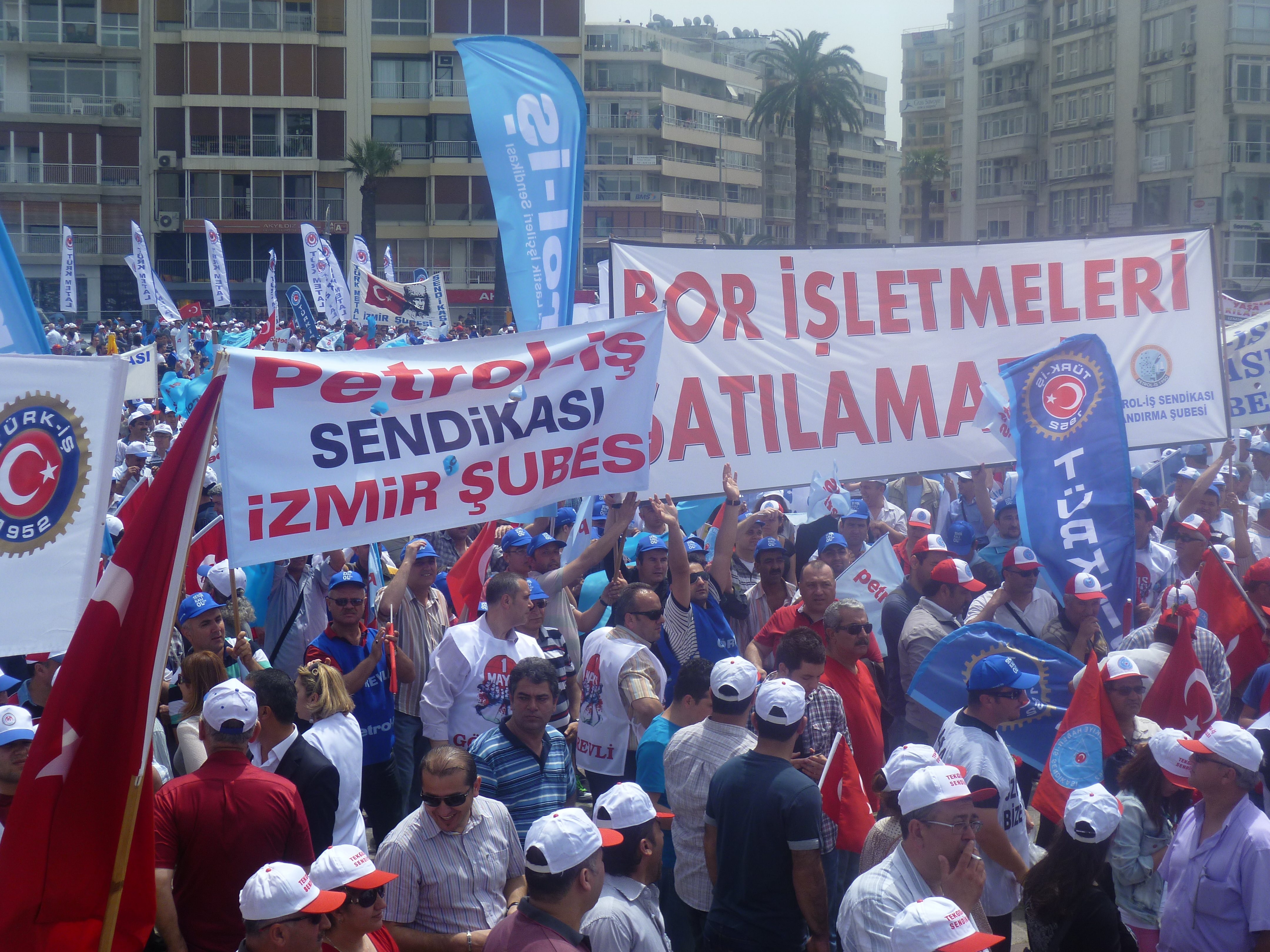 1 Mayıs İzmir ilimizde Gündoğdu Meydanında büyük bir coşkuyla kutlandı. İzmir Şubemiz 492 üye, 25 eş ve çocukla toplam 517 kişiyle davul zurna eşliğinde 1 Mayıs’a katılılım sağladı. Bandırma Şubemizden üç üyemiz de BOR İŞLETMELERİ SATILAMAZ pankartıyla kortejin başında yürütülerek Gündoğdu Meydanında seslerini duyurdu. 1 Mayıs kürsüsünden defalarca anons edilerek, katılımcılar “BORLAR SATILAMAZ” sloganları attılar. 1 Mayıs İşçi ve Emekçi Bayramımız kutlu olsun!