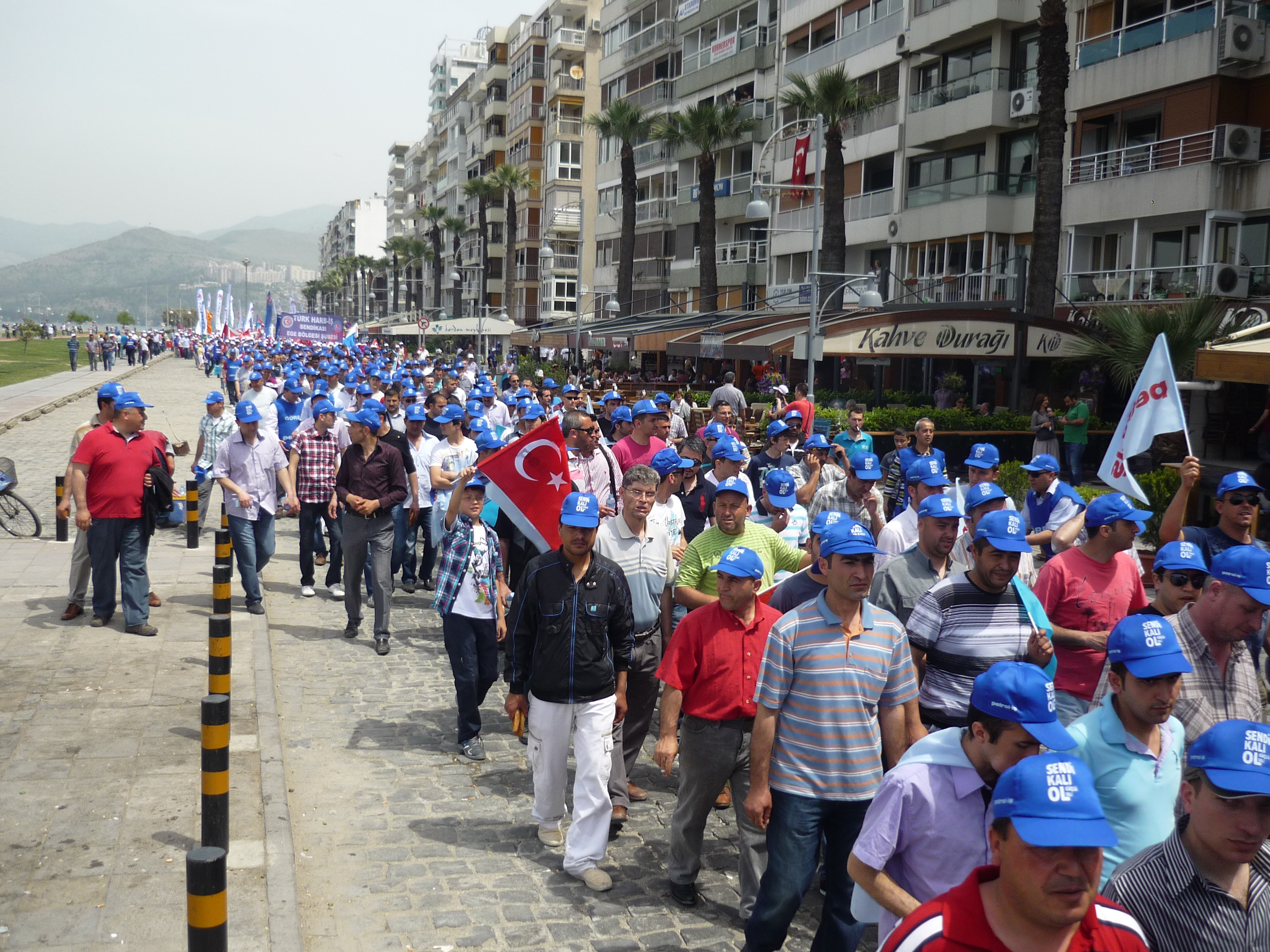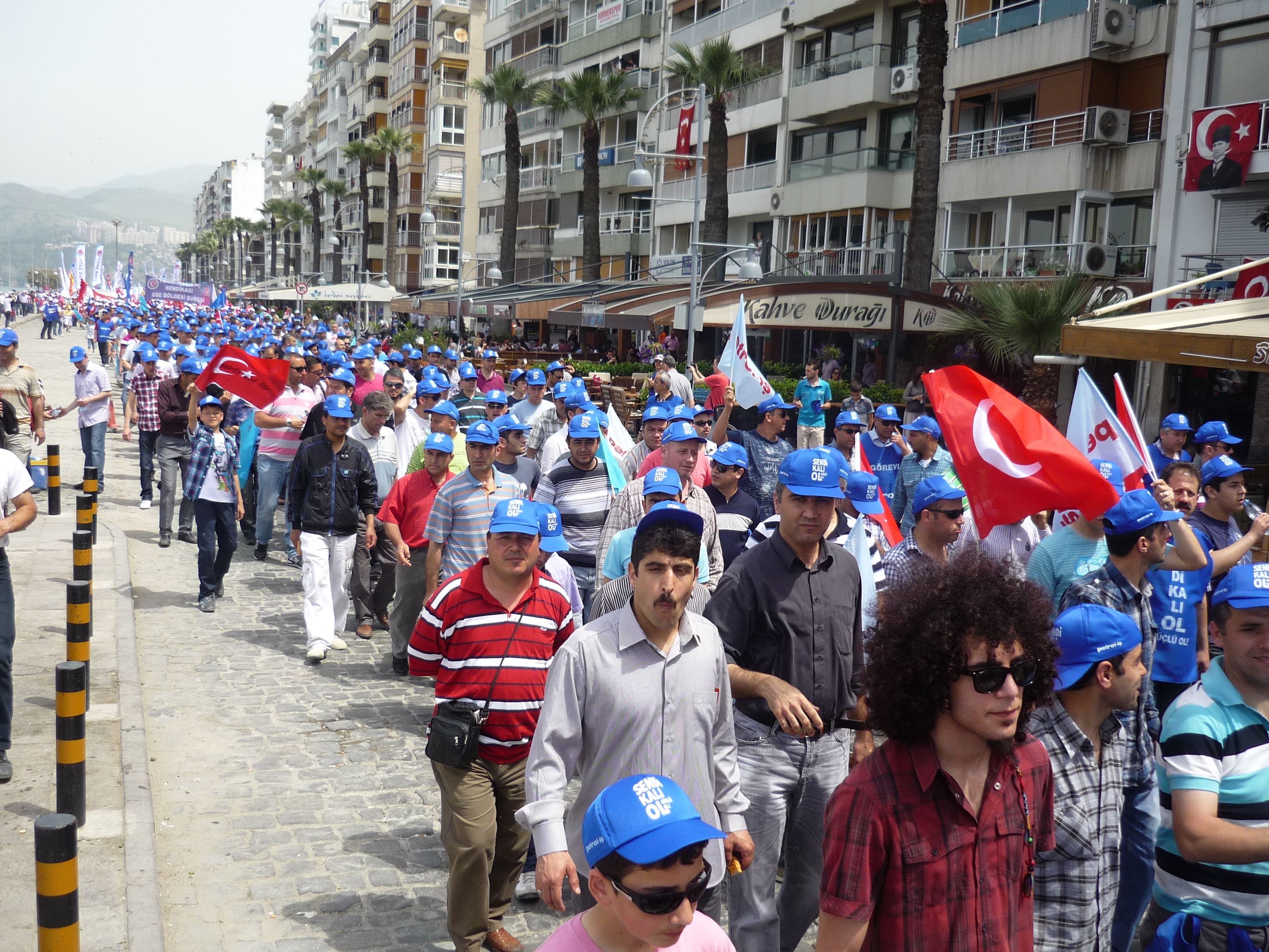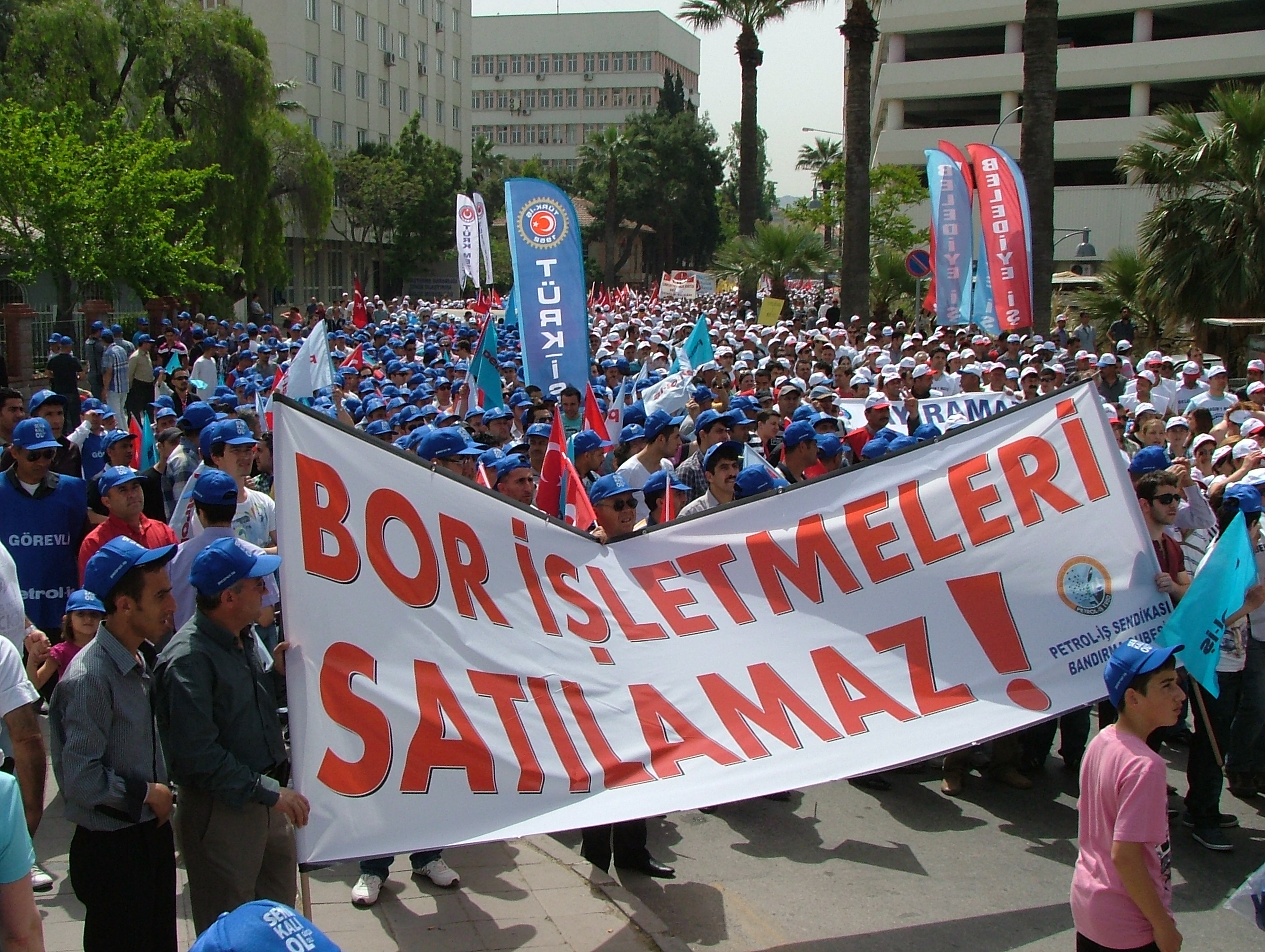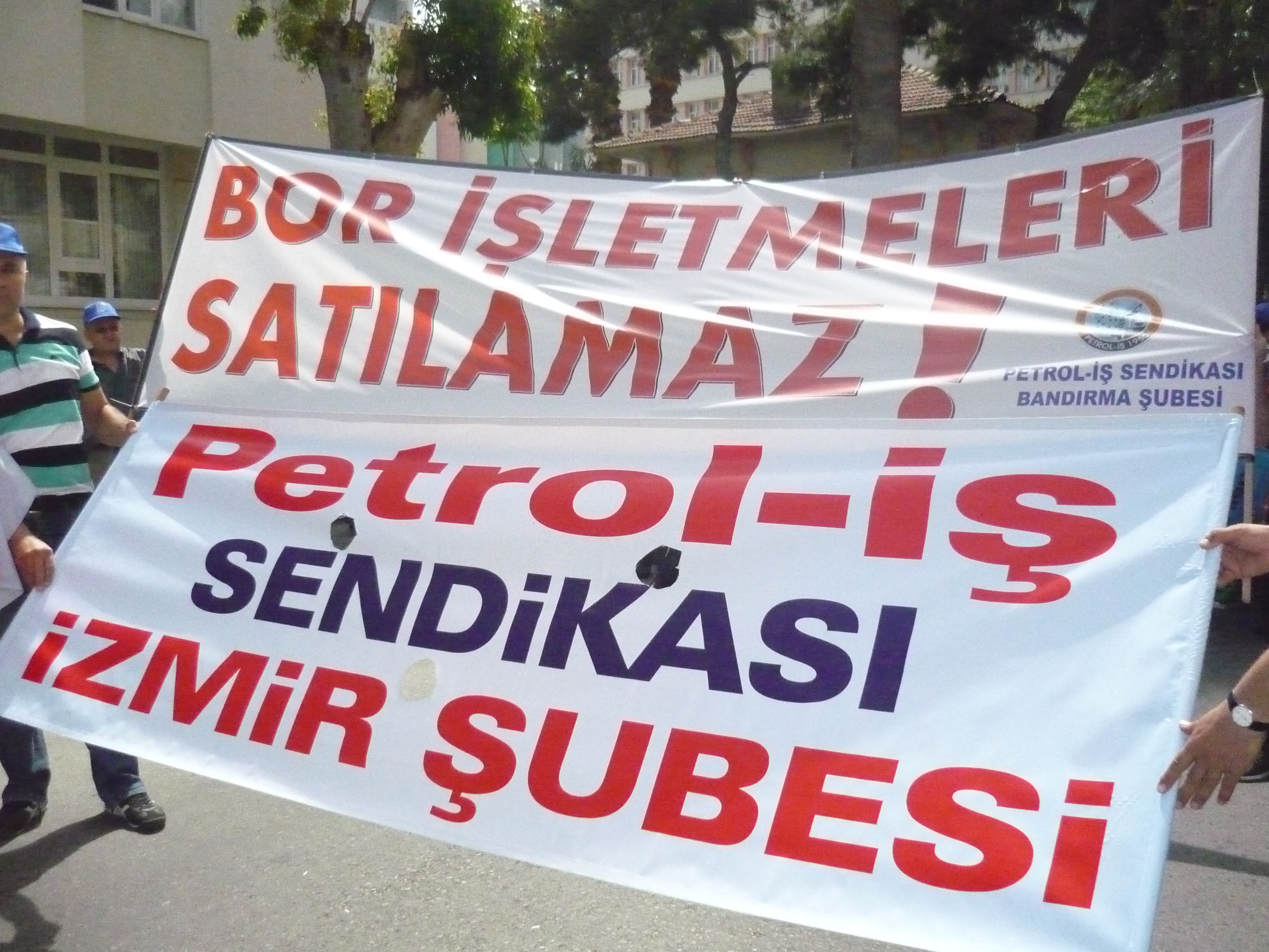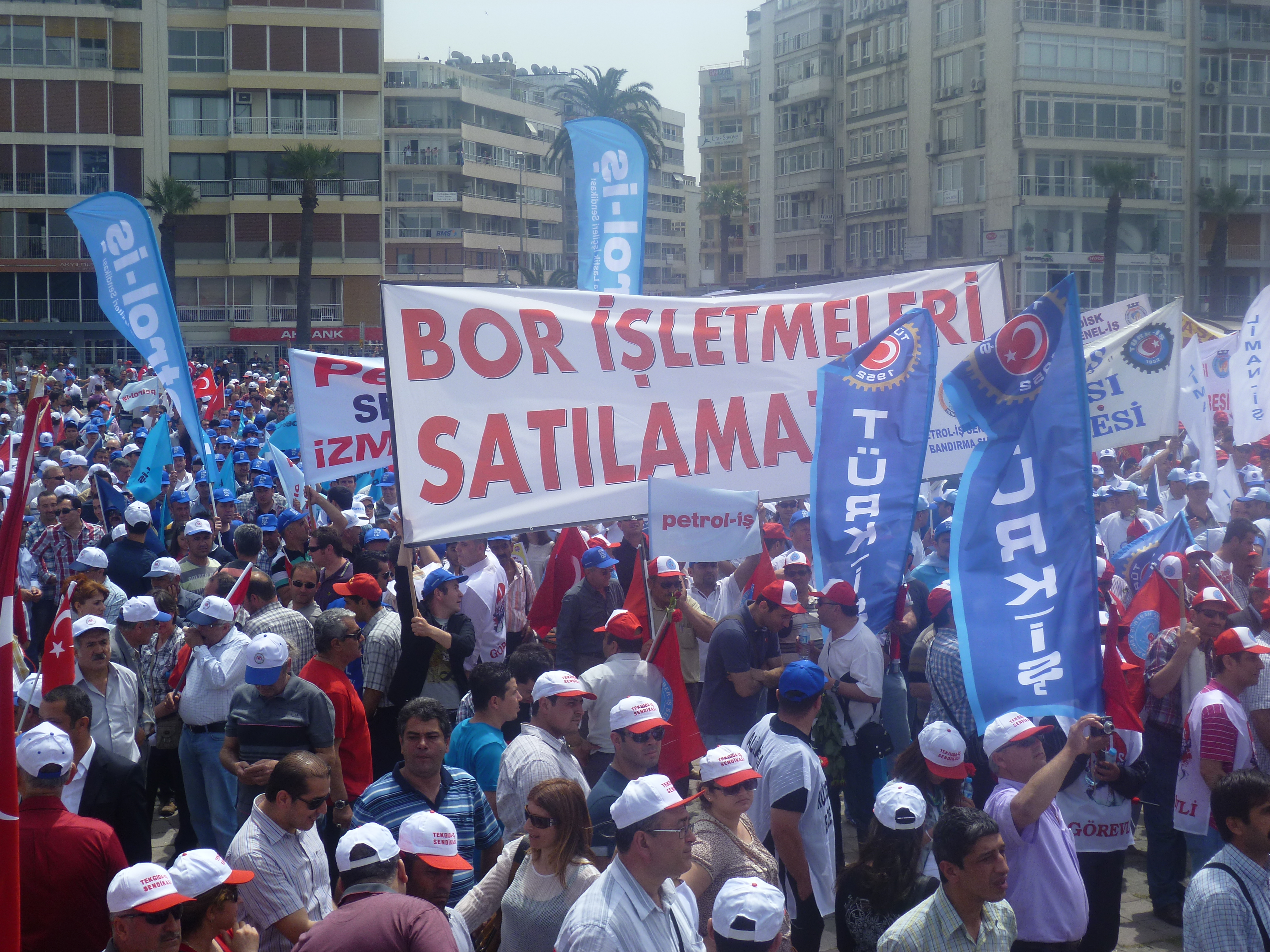 1 Mayıs İzmir ilimizde Gündoğdu Meydanında büyük bir coşkuyla kutlandı. İzmir Şubemiz 492 üye, 25 eş ve çocukla toplam 517 kişiyle davul zurna eşliğinde 1 Mayıs’a katılılım sağladı. Bandırma Şubemizden üç üyemiz de BOR İŞLETMELERİ SATILAMAZ pankartıyla kortejin başında yürütülerek Gündoğdu Meydanında seslerini duyurdu. 1 Mayıs kürsüsünden defalarca anons edilerek, katılımcılar “BORLAR SATILAMAZ” sloganları attılar. 1 Mayıs İşçi ve Emekçi Bayramımız kutlu olsun!
