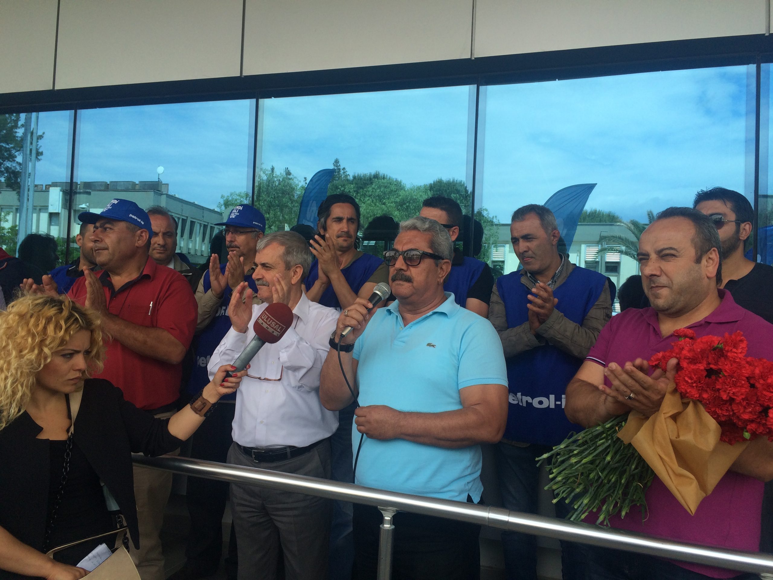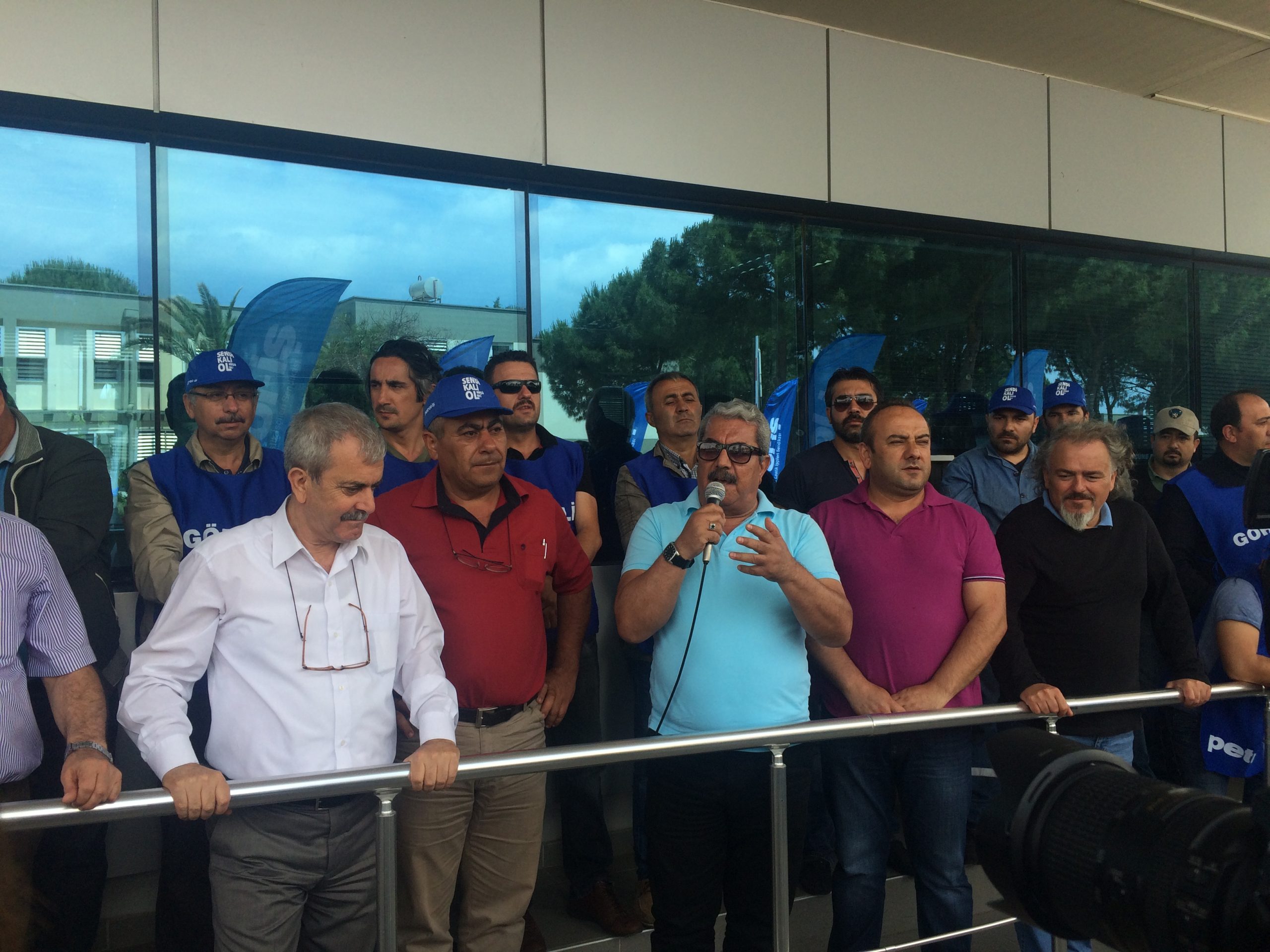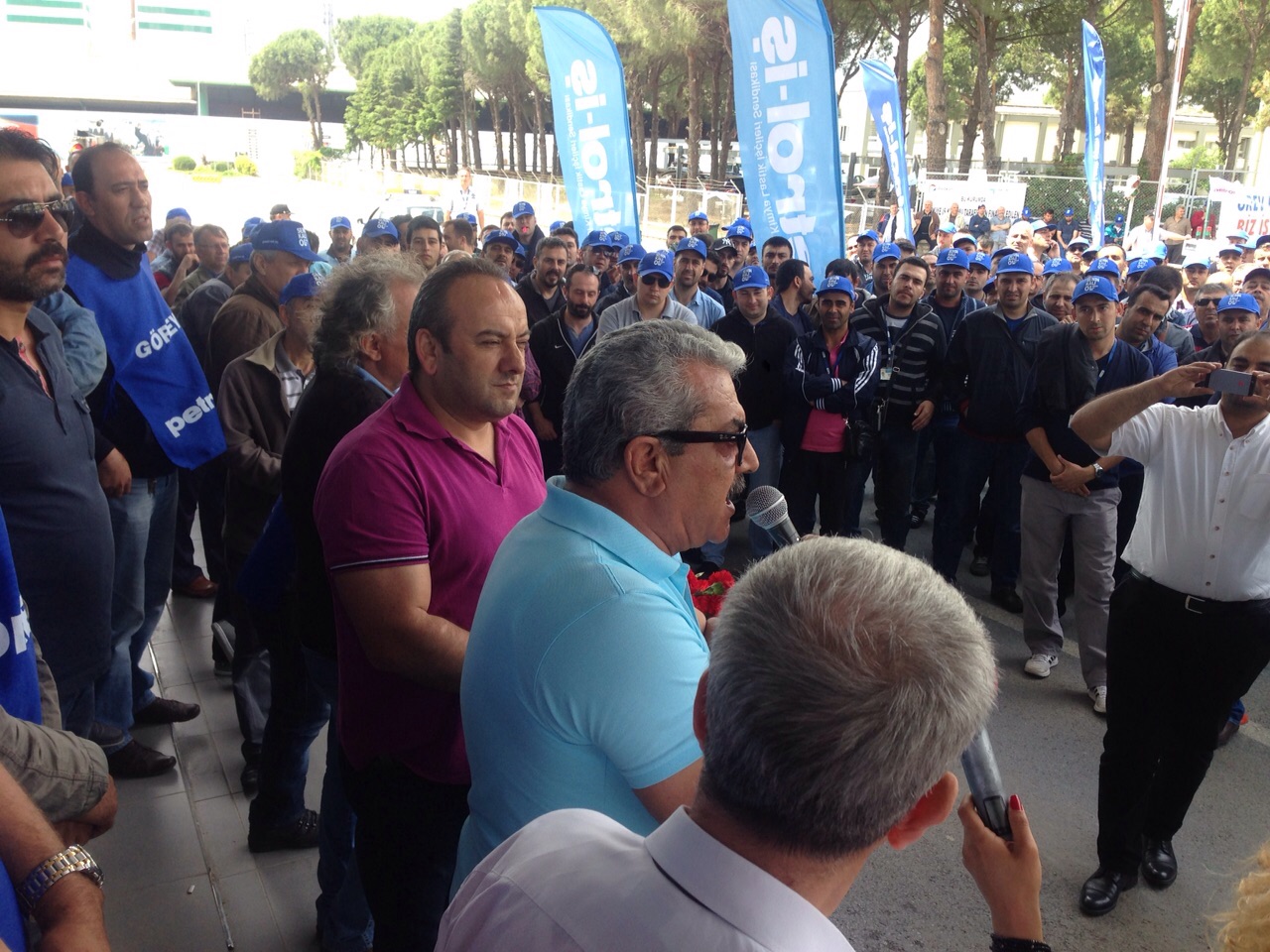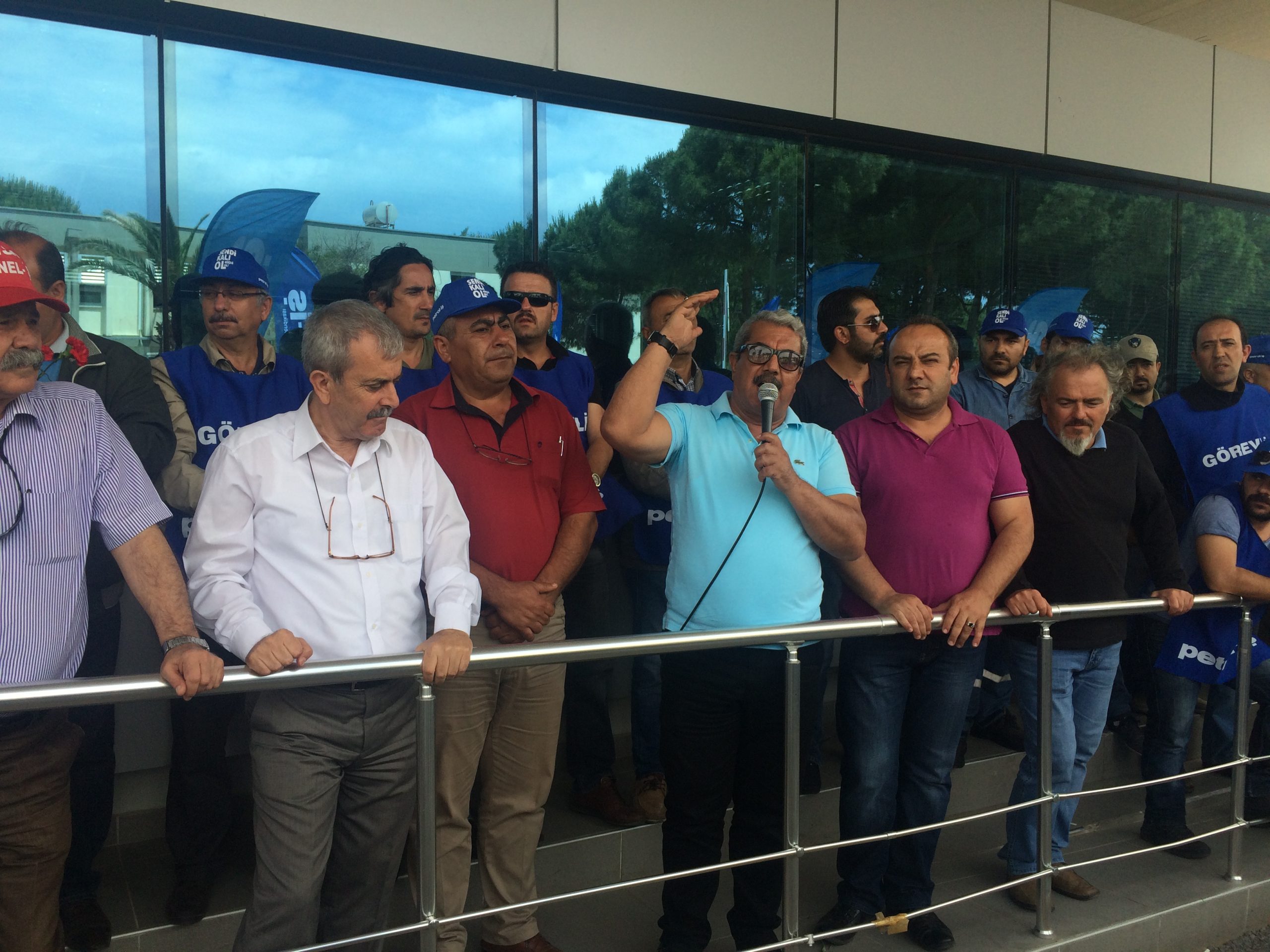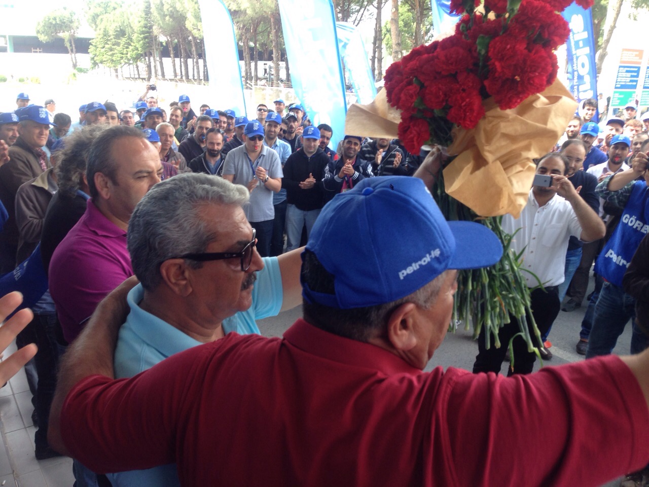 Toplu İş Sözleşme görüşmeleri tıkanan ve iki gündür eylemde olan Petkim işçisini ziyaret eden İzmir Şube Başkanımız A.Gani GÜNDOĞDU ve Şube Başkan Yardımcısı Orhan ZENGİN ile Dyo Boya Fabrikaları A.Ş. Baş Temsilcisi Hakan ZAPTİYEOĞLU eylemci Petkim işçisine destek vererek kırmızı karanfil dağıttılar