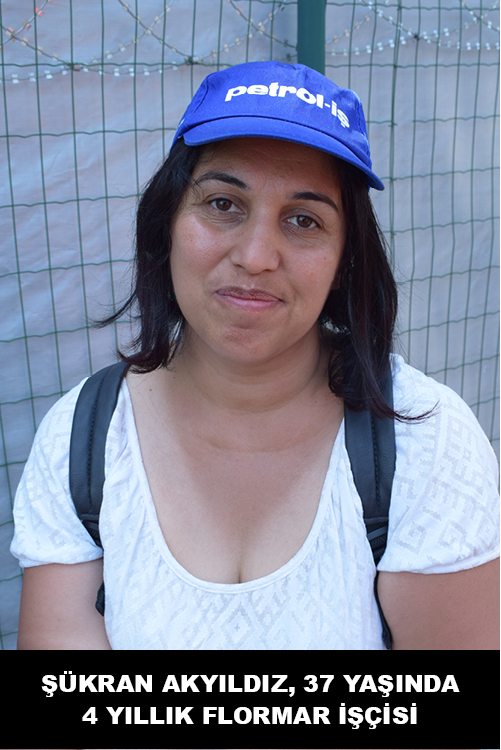 Dört yıldır Flormar’da çalışan Şükran Akyıldız, 37 yaşında. Sevkiyat bölümünde, üretimden ayrı bir yerde depoda çalışıyor. O yüzden direnişte en çok üretimdeki arkadaşlarla yakınlaştığı için memnun. Evli ve iki çocuk annesi Şükran Akyıldız, başta eşinin baskısıyla da karşılaşmış, borçları olduğu için “işten çıkarılırsan iyi olmaz, o yüzden bulaşma” demiş. Şimdi destekliyor ama. “Buradaki herkesin borcu var” diye ekliyor düşüncelerini.