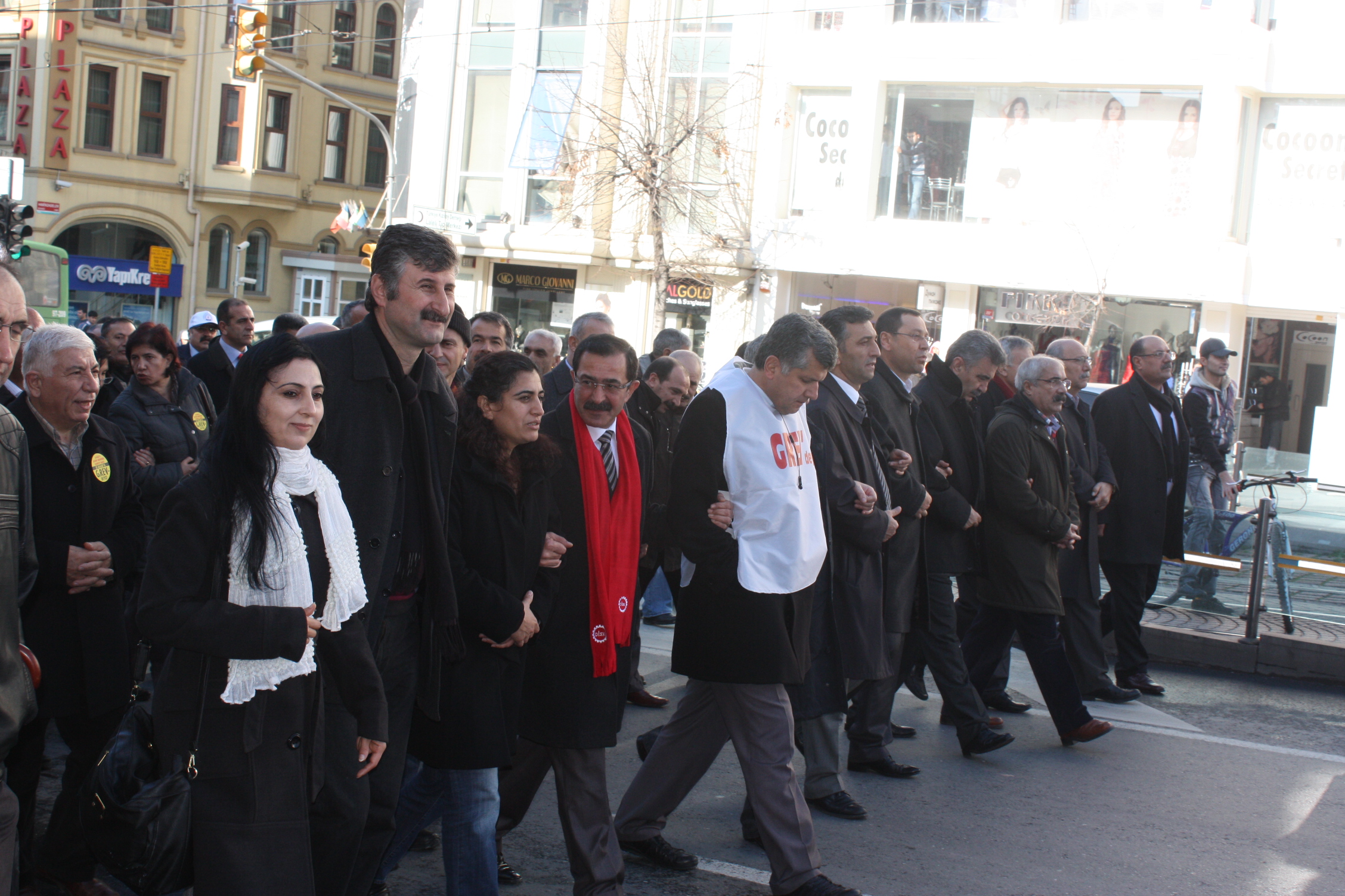 Yürüyüş boyunca sık sık, “Kapıkulu değiliz, emekçiyiz”, “Bu sömürü düzenine karşı grevdeyiz”, “İnsanca yaşanılacak bir ücret için grevdeyiz” “Tüm emekçiler için grevdeyiz”, Taşeronlaşmaya karşı grevdeyiz”, “Parasız eğitim için grevdeyiz”, “Parasız sağlık için grevdeyiz”, “İş, ekmek, özgürlük, eşitlik, barış için grevdeyiz” “1 Ocak’tan itibaren yeşil kartın iptal edilmesine karşı grevdeyiz”, “İnsanca bir yaşam için grevdeyiz” “İşsizliğe, yoksulluğa karşı grevdeyiz” , “Toplu sözleşme hakkımız, grev silahımız”, “ Kurtuluş yok tek başına, ya hep beraber ya hiç birimiz”, “Gün gelecek, devran dönecek, AKP halka hesap verecek”, “ Emeğimize, geleceğimize ve sağlık hakkına sahip çıkmak için g(ö)revdeyiz”, “ “Sağlık haktır satılamaz”, “Parasız eğitim, parasız sağlık” şeklinde sloganlar atıldı, dövizler taşındı.