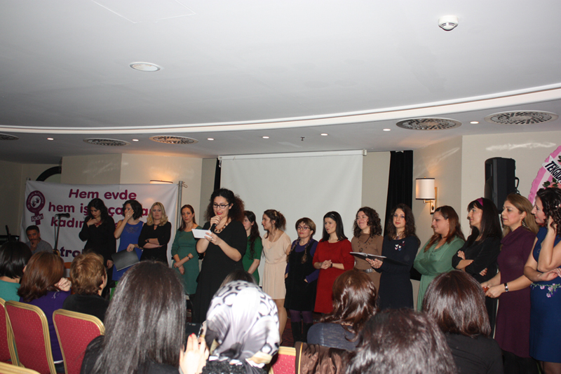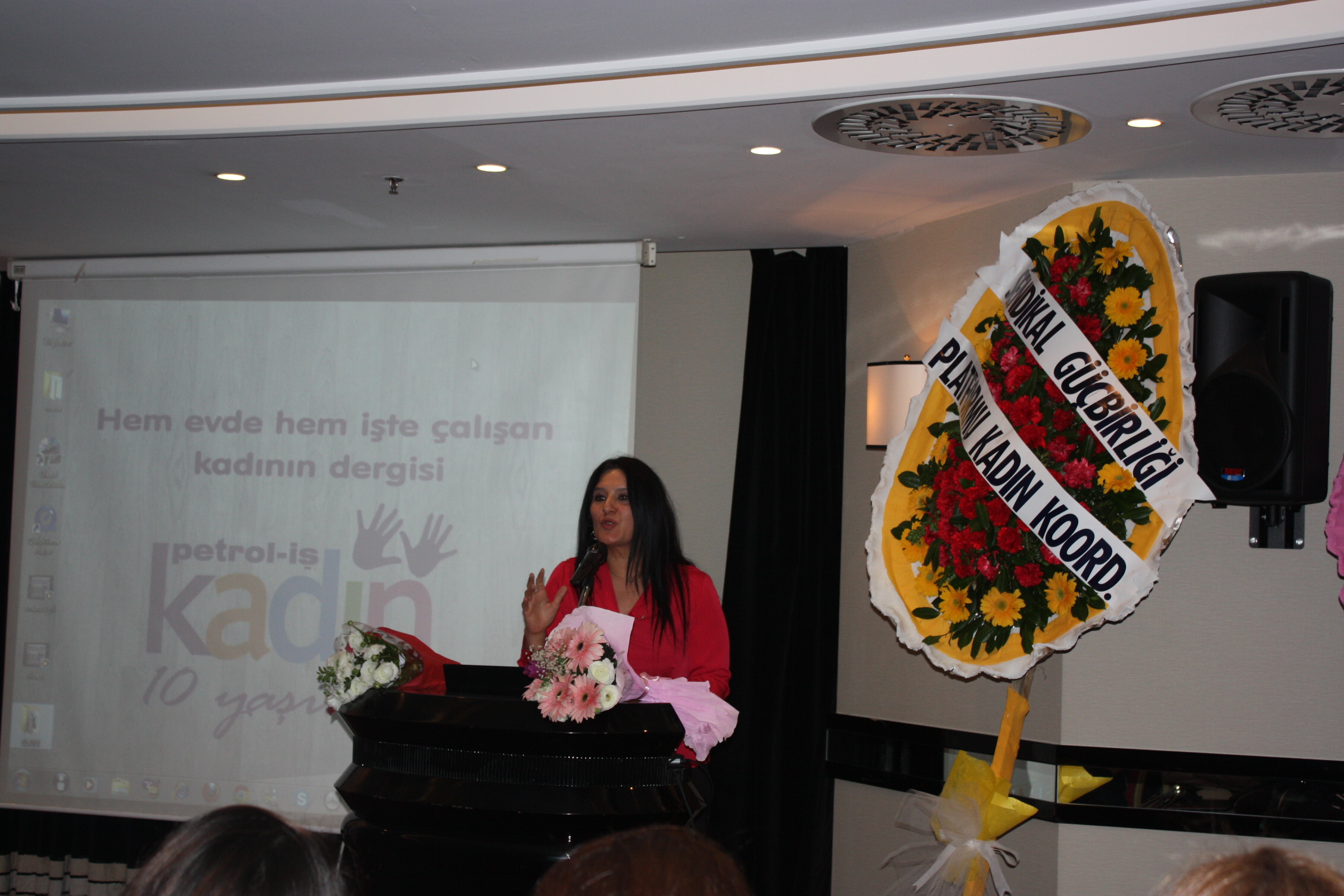 Derginin tasarımcısı ve editörlerinden biri olan Selgin Zırhlı Kaplan, konuşmasında “… Genel başkanımızın da söylediği gibi bu işe sıfırdan başladık. Bir işe sıfırdan başlayarak buraya getirmiş olmak da mutluluk veriyor, insana kendini mimar gibi hissettiriyor. On yılda epey ileri noktalara geldik hepinizin katkılarıyla. Necla’nın hoşuma giden deyişiyle “küçük kızımız on yaşına geldi” Kadın dergimizin dünyaya gelmesine vesile olan Petrol-İş yönetimine teşekkürümüzü unutmuyoruz. Petrol-İş üye ve üye eşi kadınlar için yola çıktık, bugün daha farklı noktalardayız… Her kesimden kadınların sorunlarına yer vermeye çalıştık. Ortak sorunlara ortak çözümler üretme ve eylemlilik noktasında birlikte hareket etmeye çalıştık. Burada birlikte hareket ettiğimiz arkadaşların çoğunu görebiliyorum. Bu alanda emek harcayan herkese teşekkür etmek istiyorum. Akademi dünyasından, sendikalardan, farklı kesimlerden kadınlar bu işe katkı sağladılar. … Neden kadın dergisi diyerek bitireceğim. Bu soruya şöyle cevap vermek istiyorum: “Kadın dergisi, çünkü kadın erkek eşitliğine inanıyoruz… Kadın dergisi, çünkü kadın dayanışmasının önemine inanıyoruz… Kadın dergisi, çünkü sendikalarda kadınların güçlendirilmesi gerektiğine inanıyoruz. Çünkü ÖRGÜTLÜ KADIN GÜÇLÜ SENDİKA diyoruz… Birazdan izleyeceğiniz slaytta da duygularımı paylaşmaya çalıştım.” dedi.