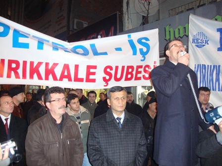 Ankara’da eylemleri devam eden Tekel işçilerine destek olmak amacıyla Türk – İş’ in almış olduğu karar gereği Kırıkkale Şubemiz bağlı işyerlerindeki yaklaşık 300 üyemizle AKP il binası önünde düzenlenen protesto eylemine katıldı.