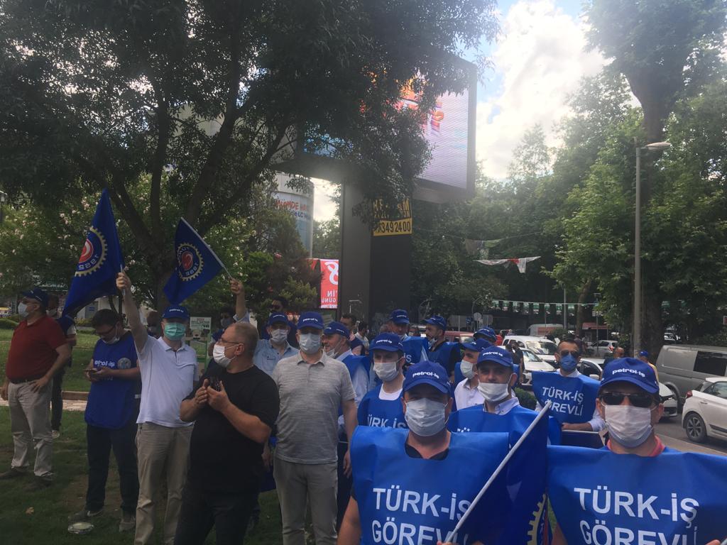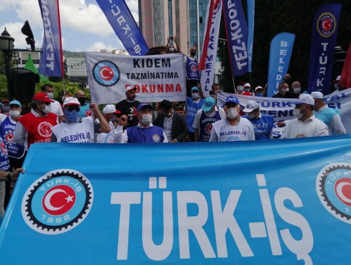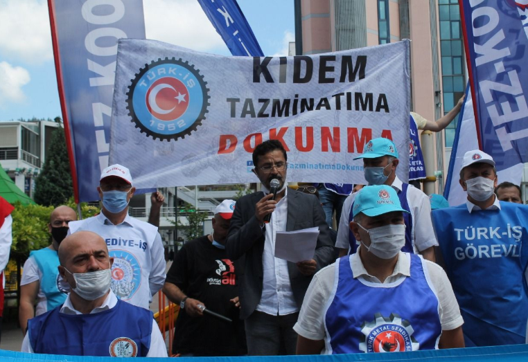Konfederasyonumuz Türk-İş’in kararı doğrultusunda 29 Haziran 2020 tarihinde Türk-İş’e bağlı sendikalar Türkiye’nin 81 ilinde eş zamanlı, kitlesel basın açıklamaları yaptı. Kocaeli Şubemiz de Kocaeli, Sabri Yalım Parkı’nda yapılan kitlesel basın açıklamasına katılarak kıdem tazminatı hakkına dokunma dedi.Şube Yöneticilerimiz, temsilcilerimiz, Türk-İş’e bağlı sendikaların yönetici ve temsilcilerinin bulunduğu basın açıklamasında kamuoyuna yansıyan kıdem tazminatı formüllerinden hiçbirinin kabul edilmeyeceği, kıdem tazminatı hakkının Türkiye işçi sınıfı ve Türk-İş’in kırmızı çizgisi olduğu vurgulandı. Türk-İş’in Genel Kurul kararları doğrultusunda, kıdem tazminatı hakkında herhangi bir geriye gidişin genel grev sebebi olduğu hatırlatıldı ve greve hazırız mesajı verildi.