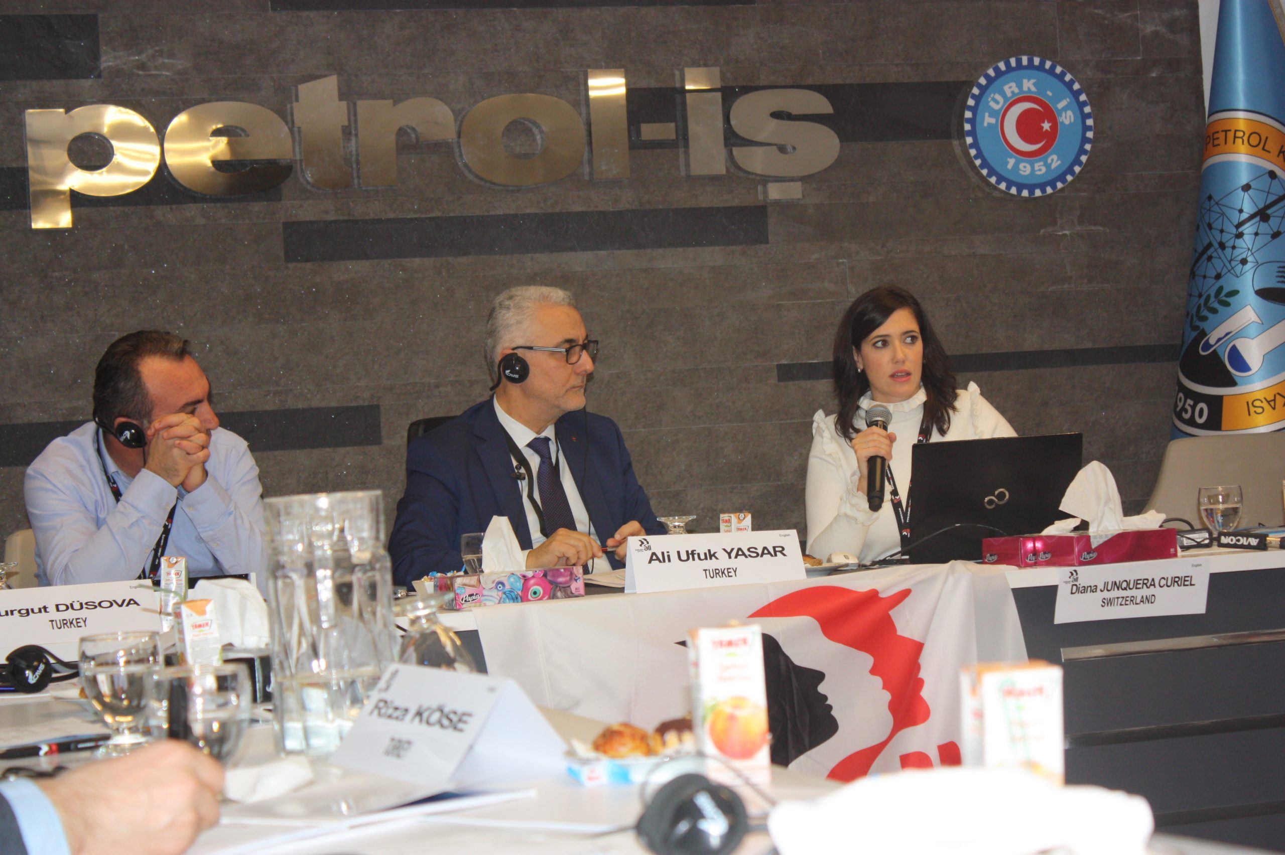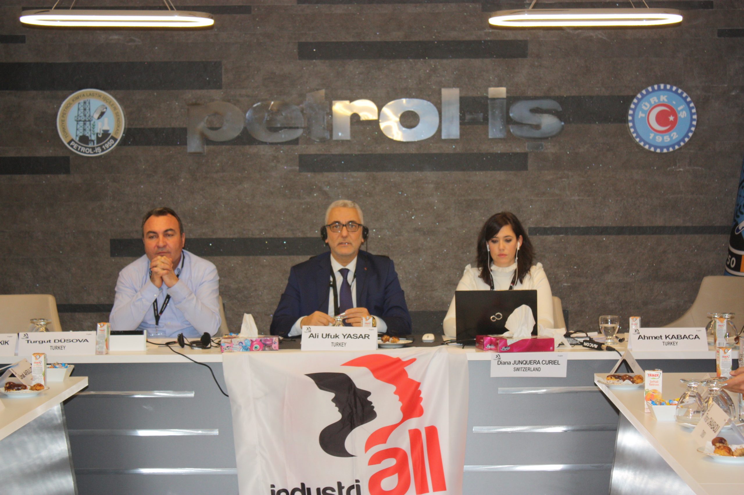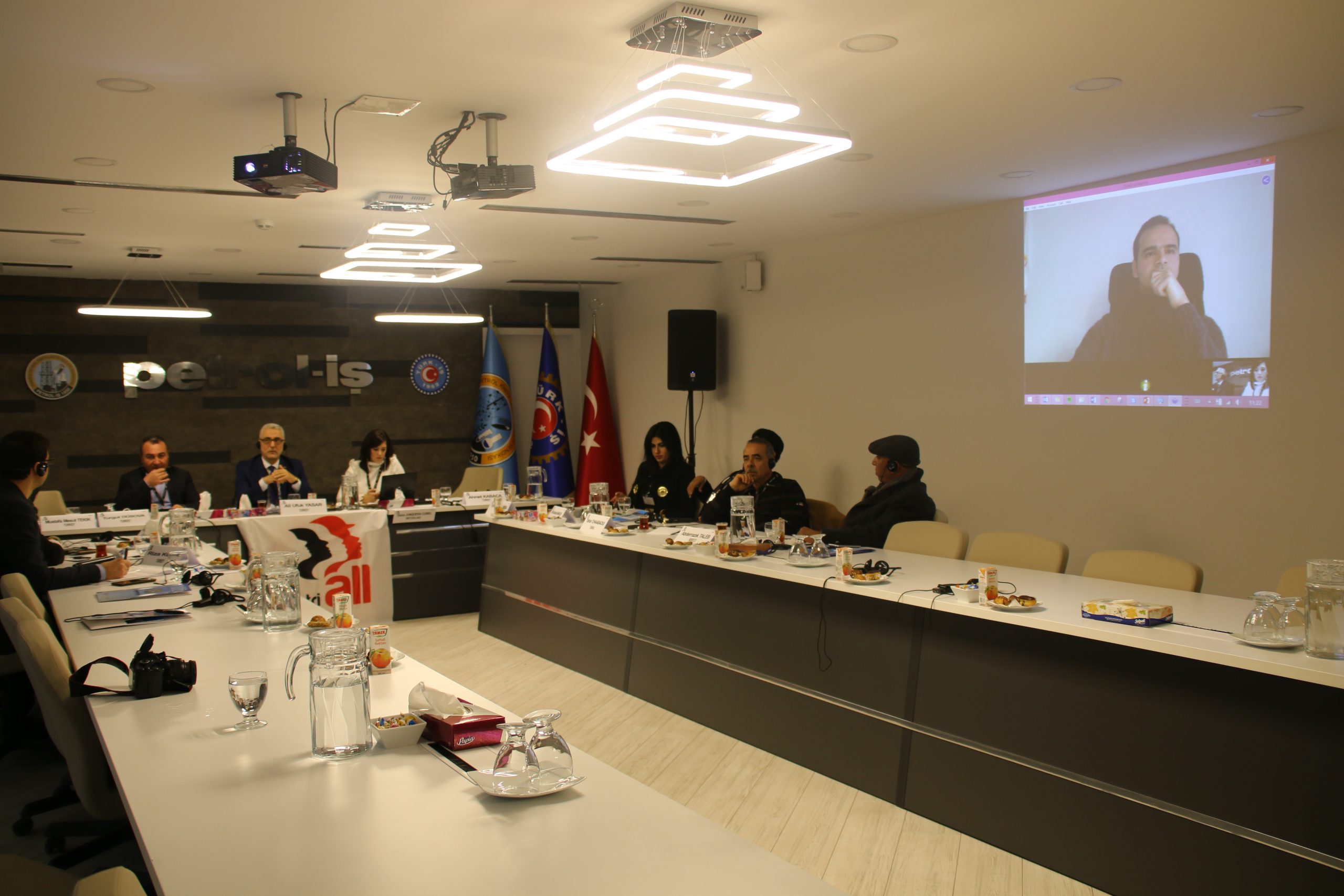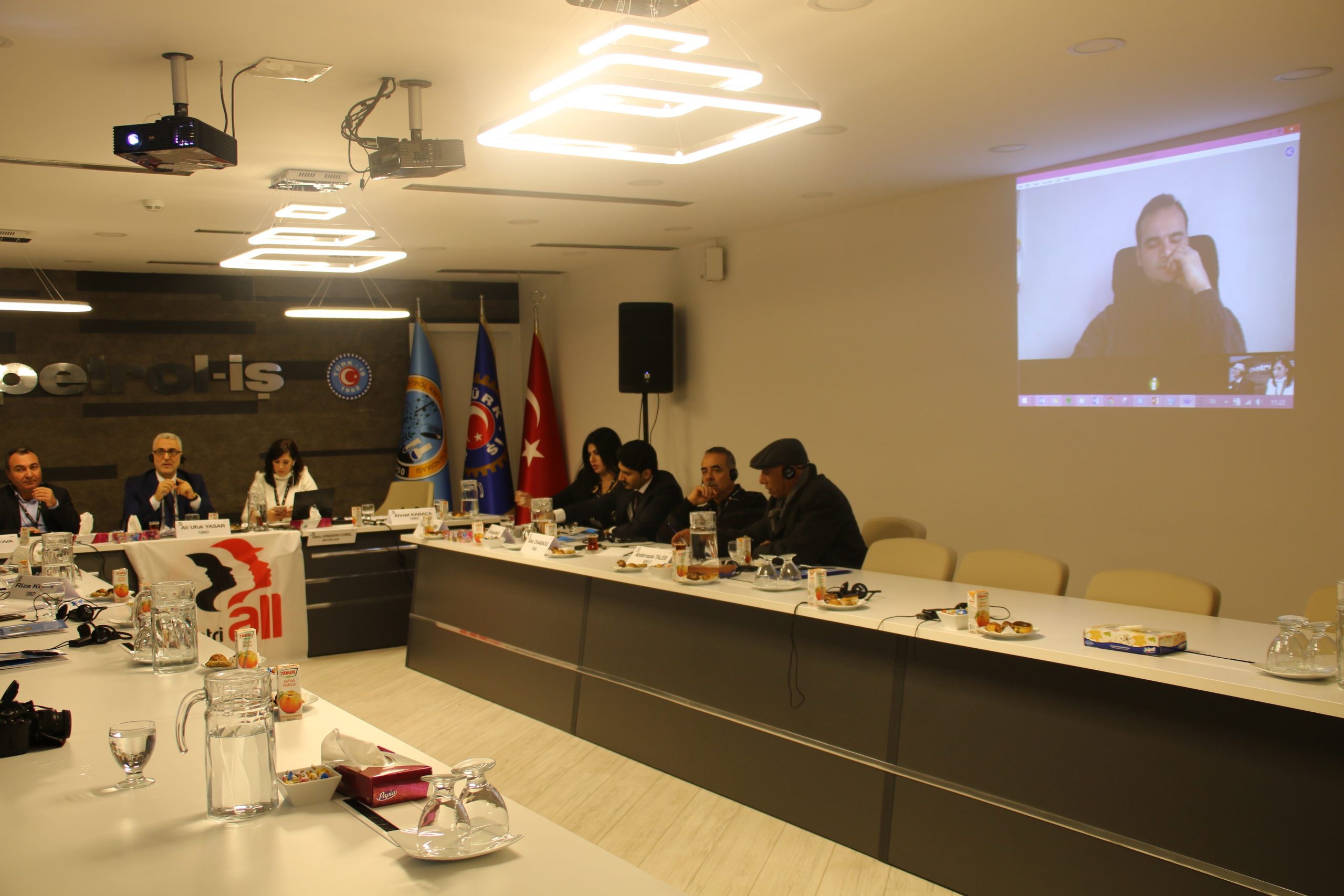 Almanya’da bulunan IndustriALL Küresel Sendika MENA Bölgesi İrtibat Sorumlusu Ahmed Kamel ise toplantıya Skype üzerinden katıldı.