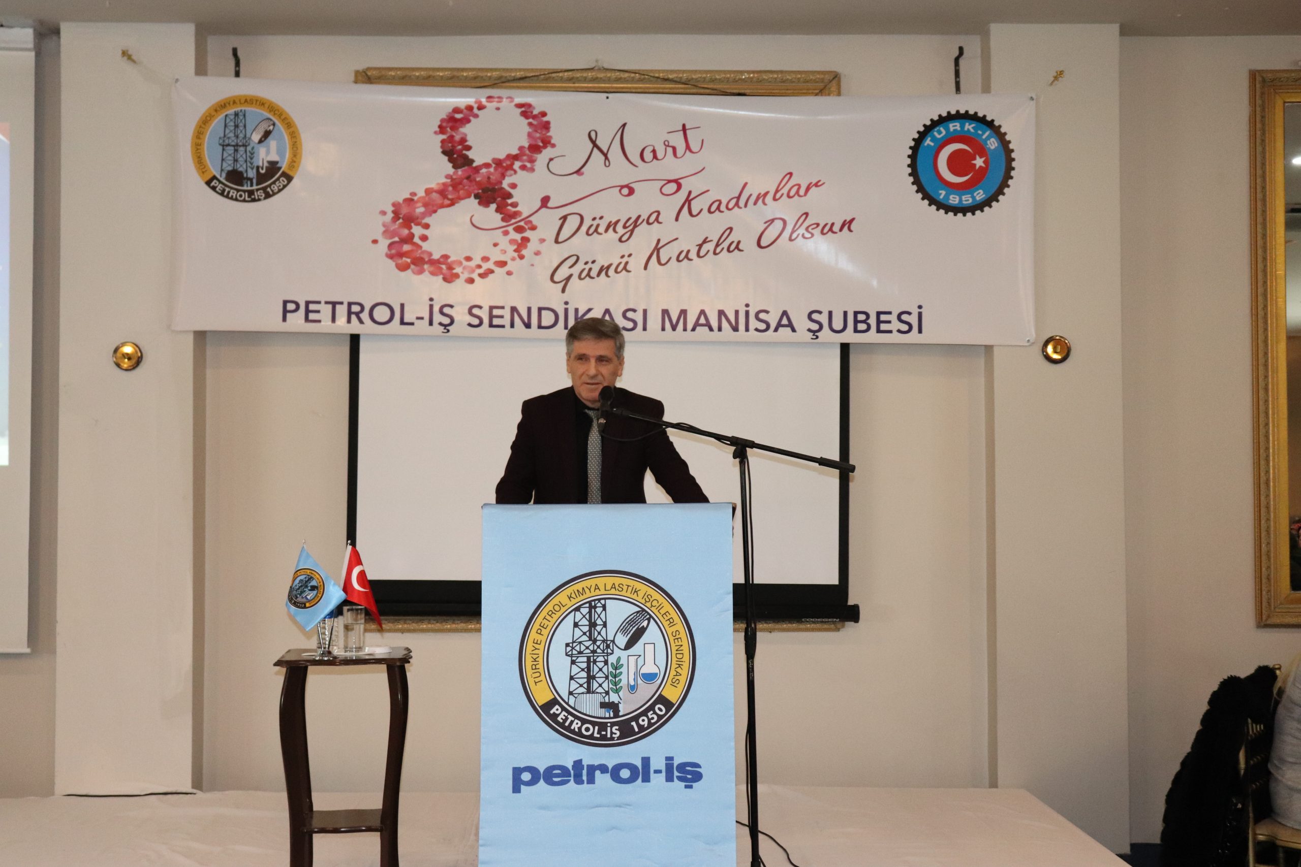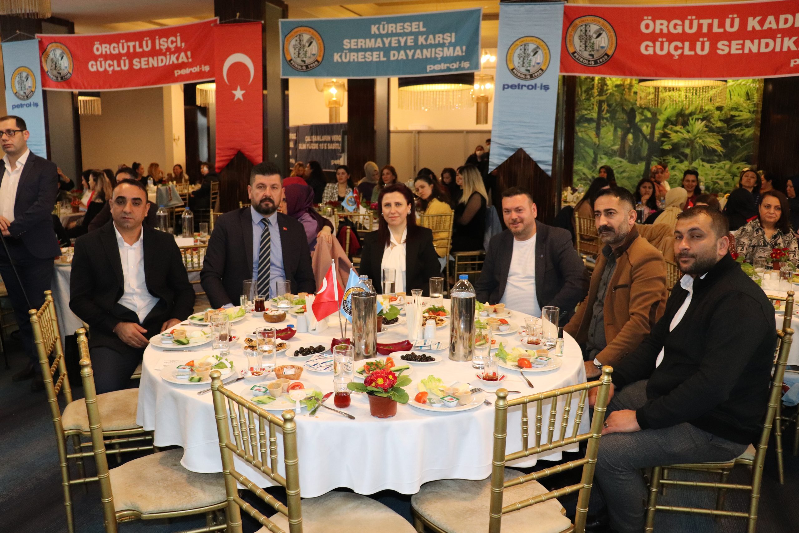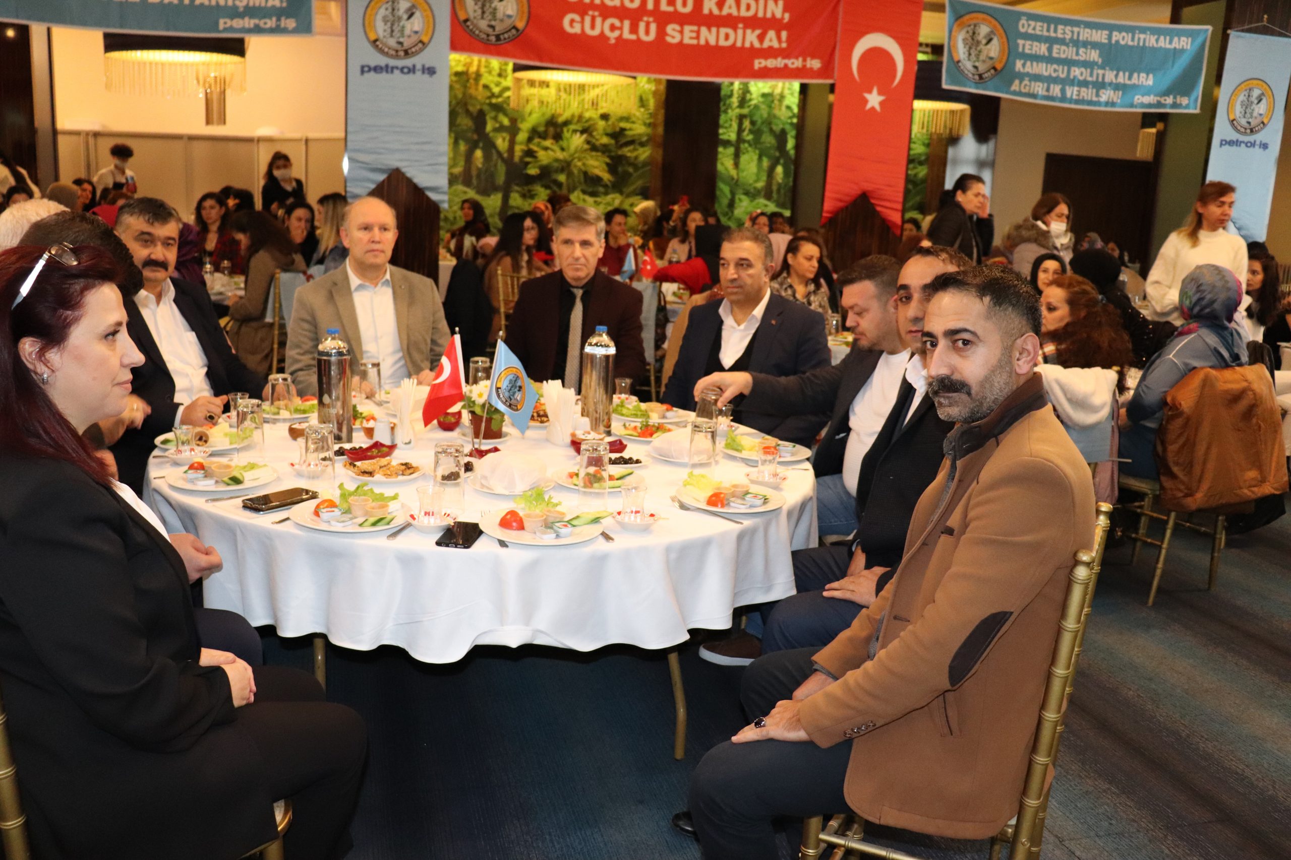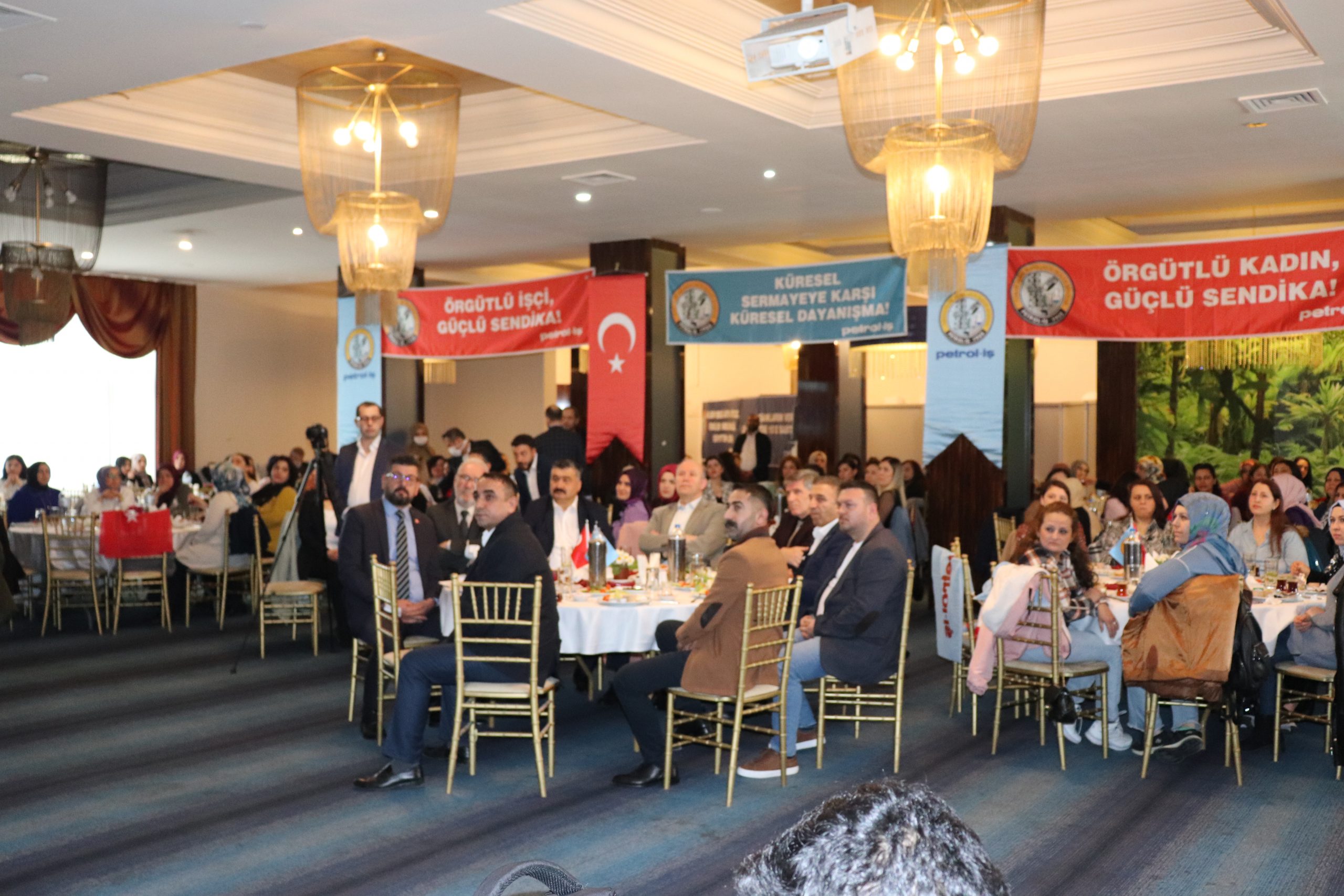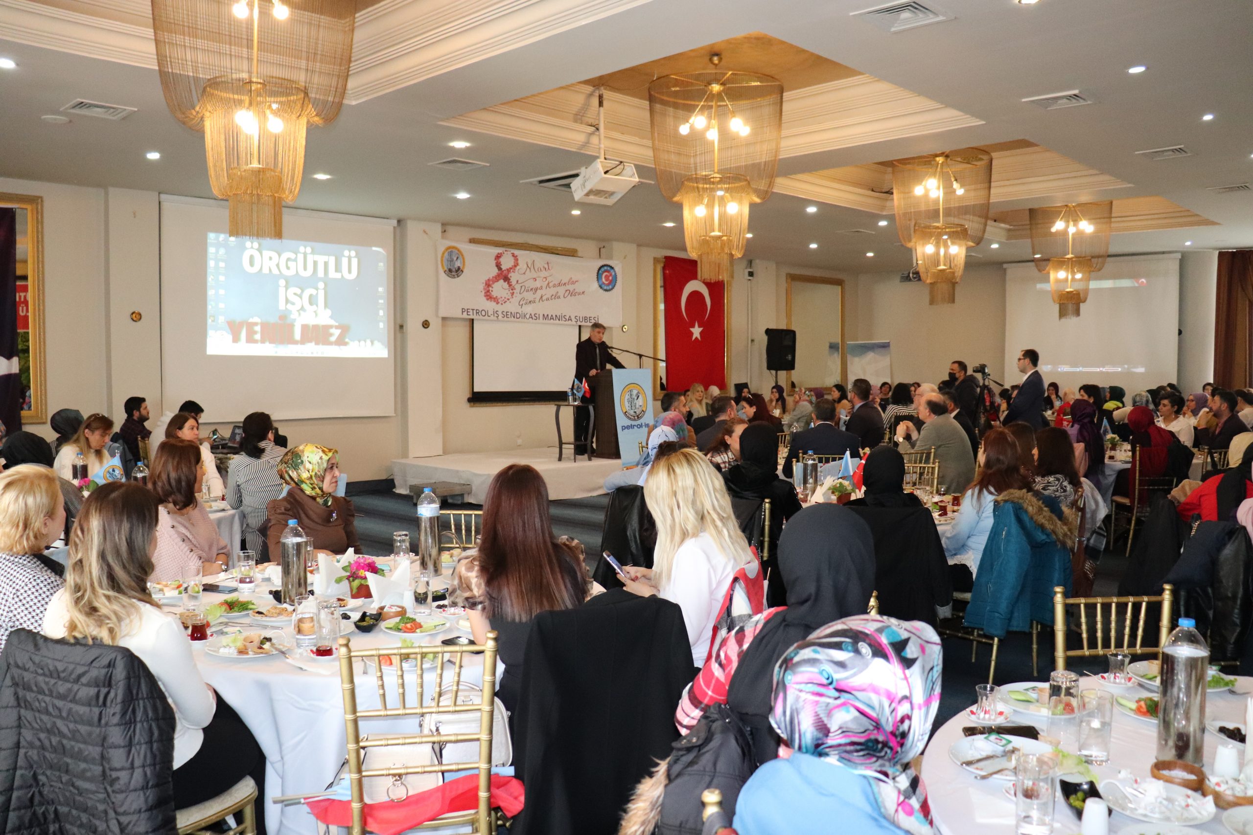 Sendikamız Merkez Yönetim Kurulu Üyeleri de etkinliğe katılarak üyelerimizle biraraya geldiler. Genel Başkanımız Süleyman Akyüz burada yaptığı konuşmasında 8 Mart’ın anlamı ve kadın hareketinin önemine değindi. Kadınların mutlak suretle örgütlenmesi gerektiğine vurgu yapan Genel Başkanımız Süleyman Akyüz, kadına yönelik her türlü şiddet ve ayrımcılığın ortadan kalkmasında sendikaların hayati önem taşadığını söyledi. Petrol-İş Sendikası’nın mücadele tarihinde Berec, Novamed, Bericap ve Flormar gibi kadınların öncülük ettiği mücadeleler olduğunu hatırlatan Genel Başkan Akyüz, birlik olarak, örgütlenerek ve sendikalaşarak zorlukların aşılabileceğini söyledi. Konuşmasının devamında Petrol-İş’in hem fiili mücadelesiyle hem de sözleşmelerine koyduğu maddelerle kadın üyelerinin haklarını koruduğunu belirten Genel Başkan, çalışma hayatında daha fazla kadına ulaşılması gerektiğini söyledi.
