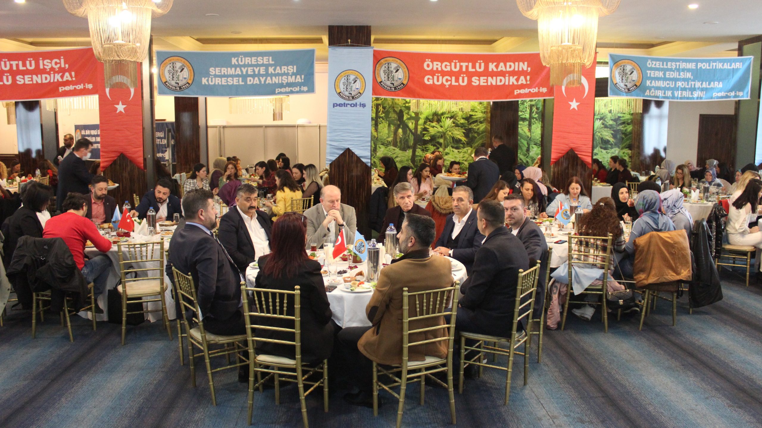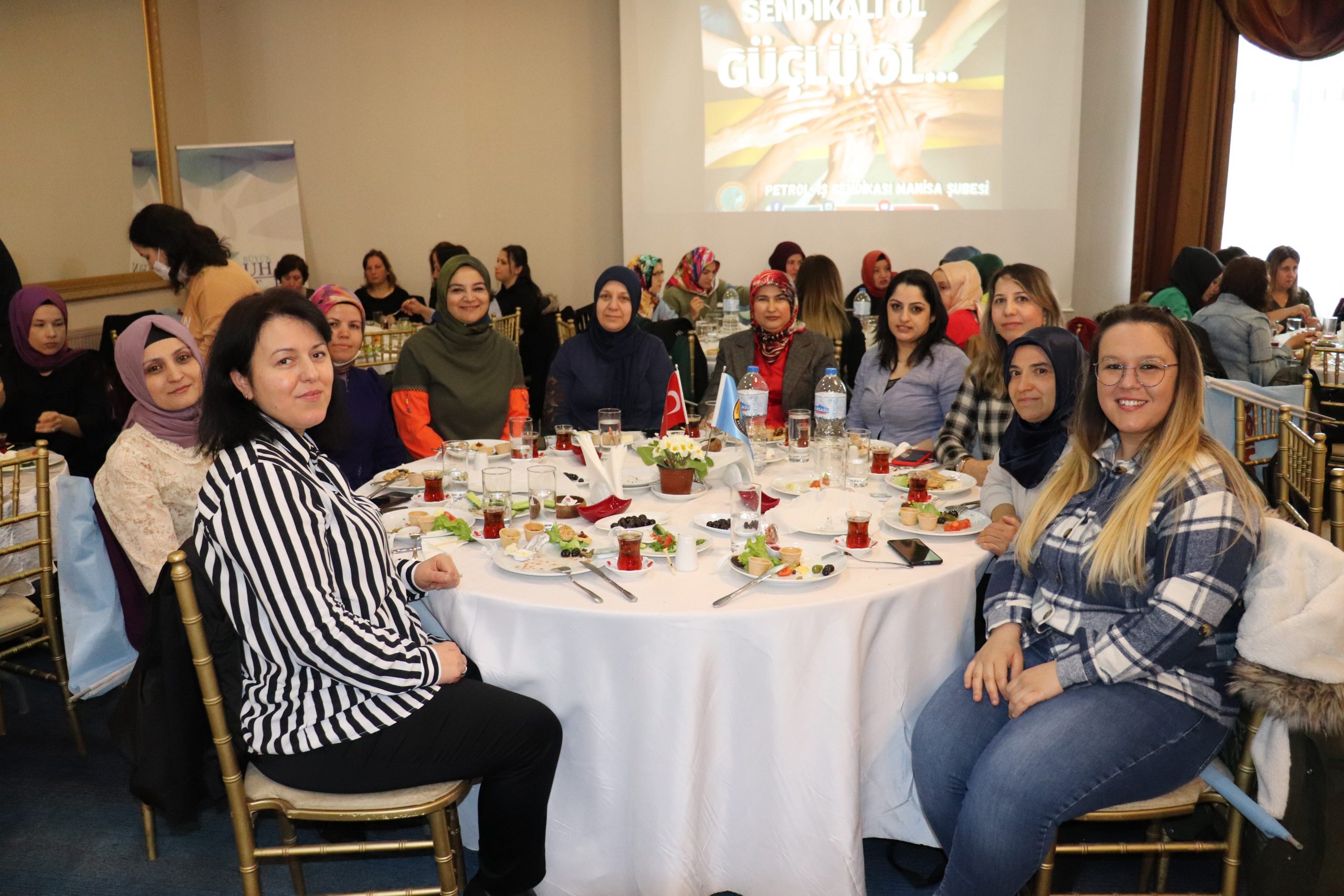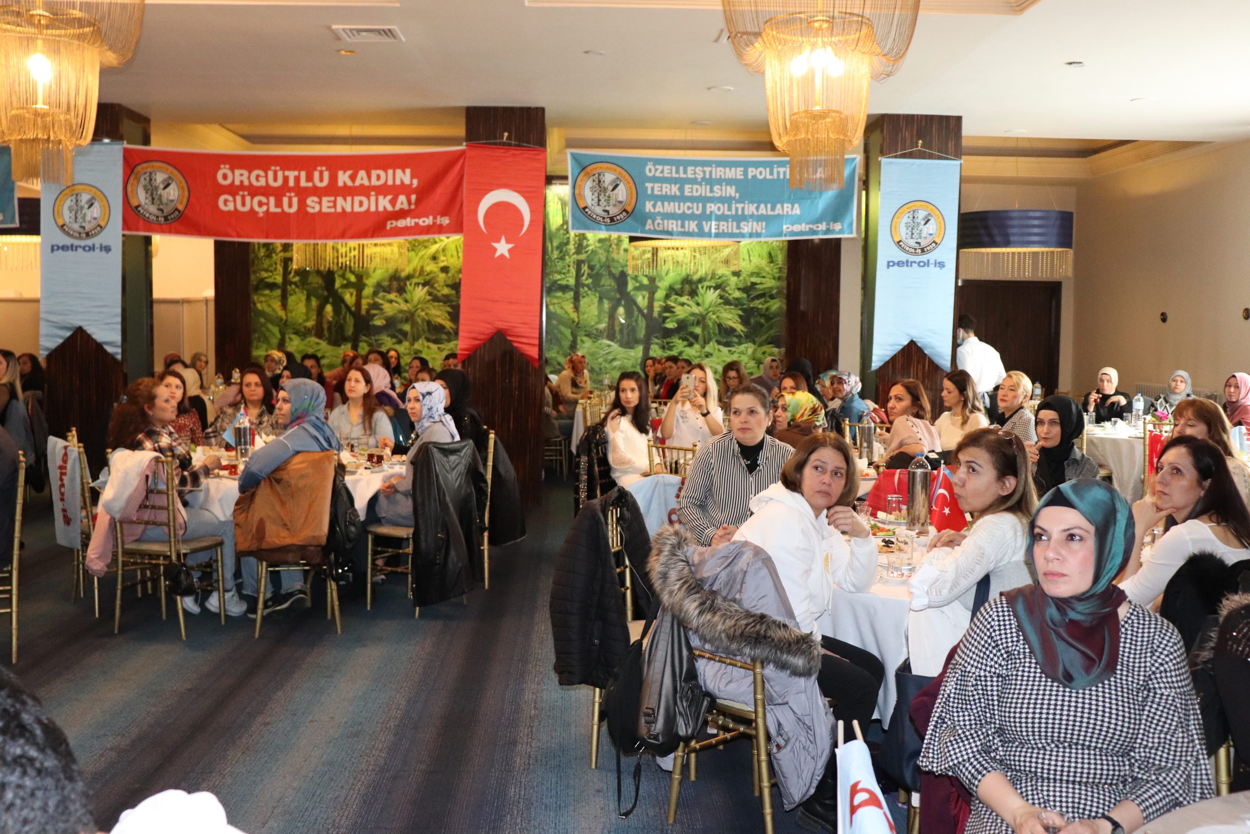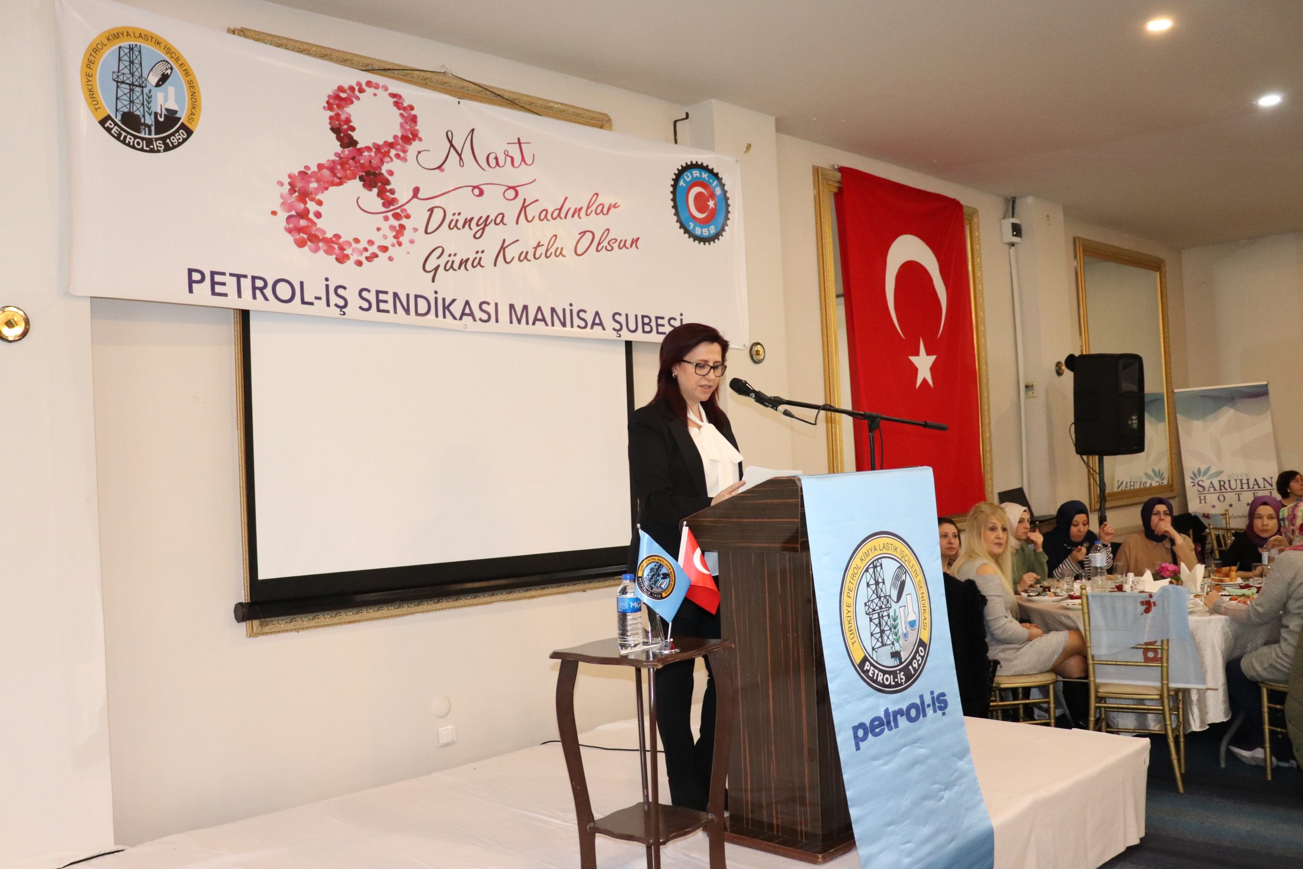 Sendikamız Merkez Yönetim Kurulu Üyeleri de etkinliğe katılarak üyelerimizle biraraya geldiler. Genel Başkanımız Süleyman Akyüz burada yaptığı konuşmasında 8 Mart’ın anlamı ve kadın hareketinin önemine değindi. Kadınların mutlak suretle örgütlenmesi gerektiğine vurgu yapan Genel Başkanımız Süleyman Akyüz, kadına yönelik her türlü şiddet ve ayrımcılığın ortadan kalkmasında sendikaların hayati önem taşadığını söyledi. Petrol-İş Sendikası’nın mücadele tarihinde Berec, Novamed, Bericap ve Flormar gibi kadınların öncülük ettiği mücadeleler olduğunu hatırlatan Genel Başkan Akyüz, birlik olarak, örgütlenerek ve sendikalaşarak zorlukların aşılabileceğini söyledi. Konuşmasının devamında Petrol-İş’in hem fiili mücadelesiyle hem de sözleşmelerine koyduğu maddelerle kadın üyelerinin haklarını koruduğunu belirten Genel Başkan, çalışma hayatında daha fazla kadına ulaşılması gerektiğini söyledi.