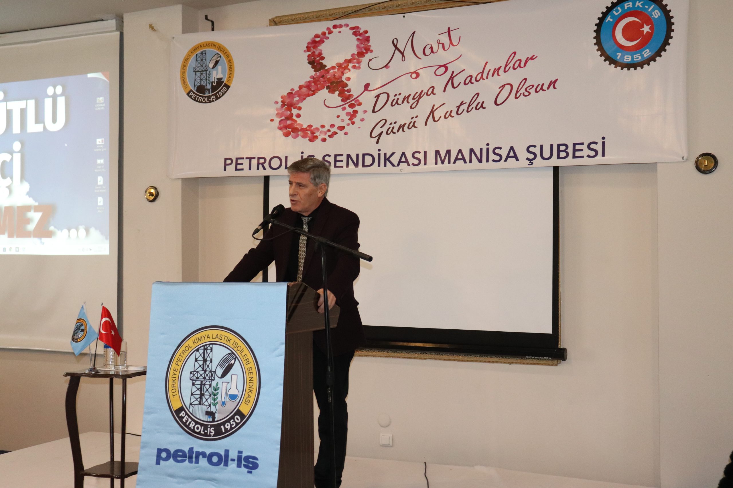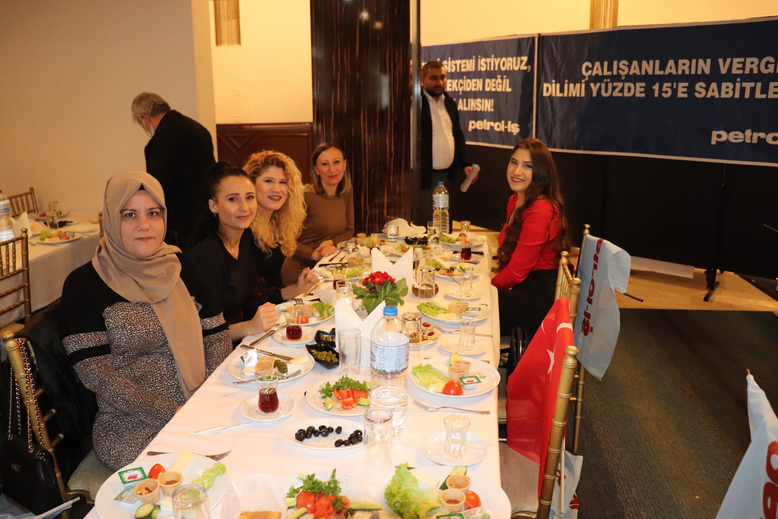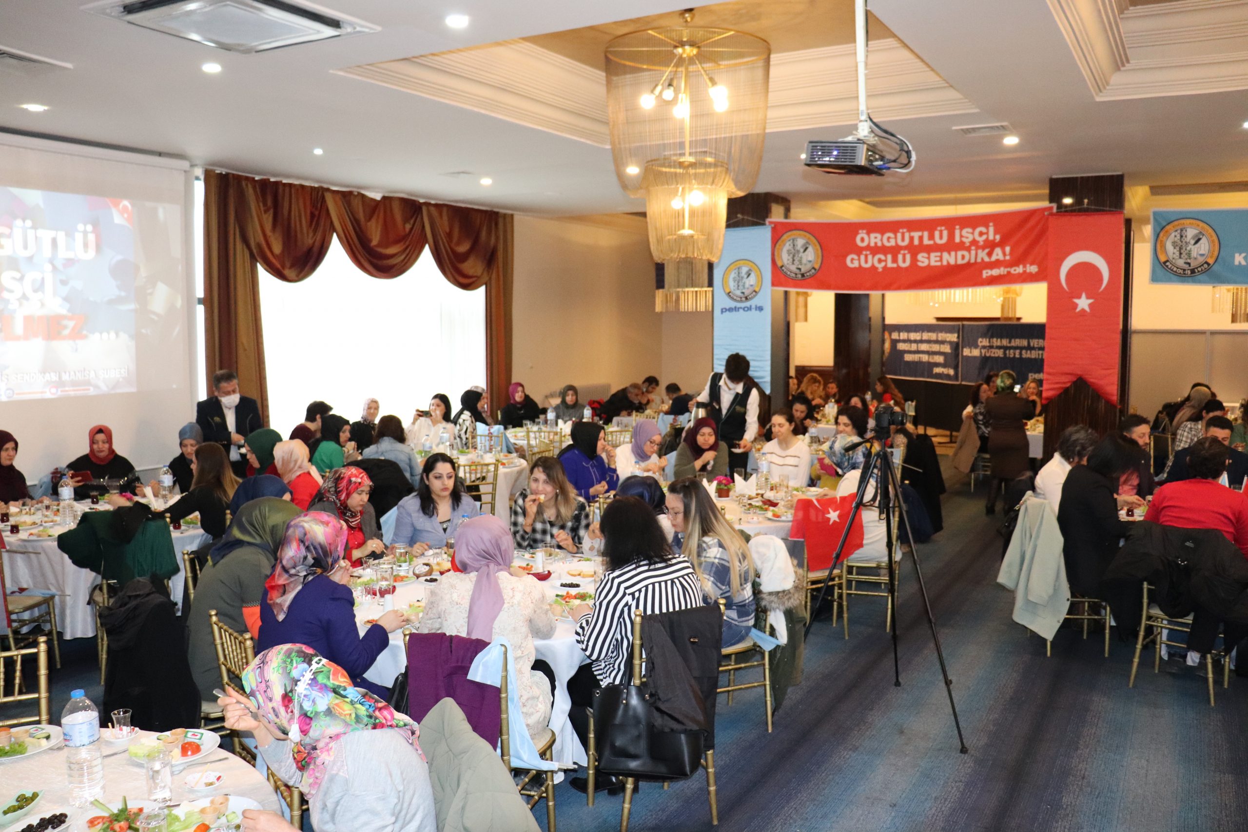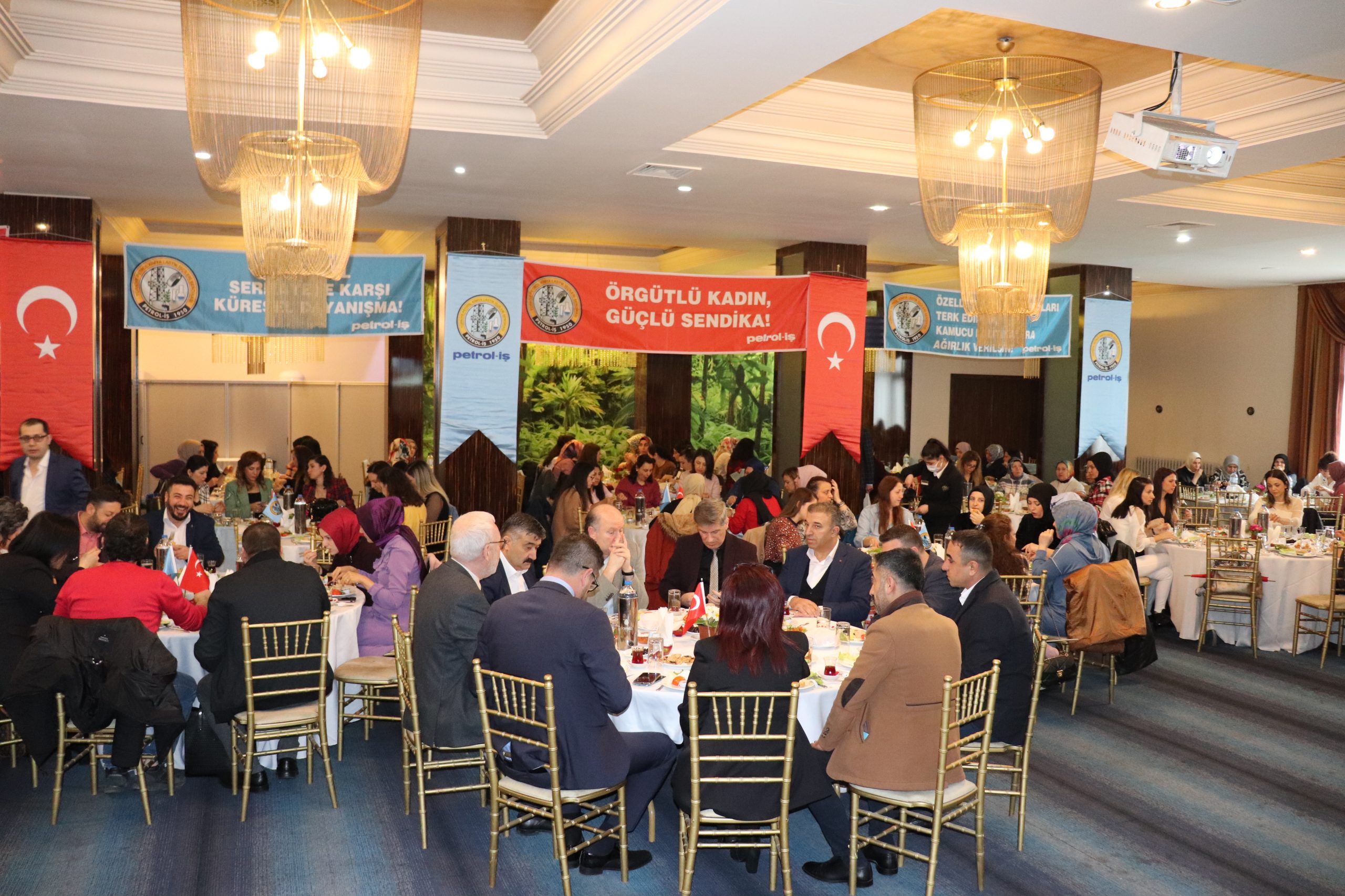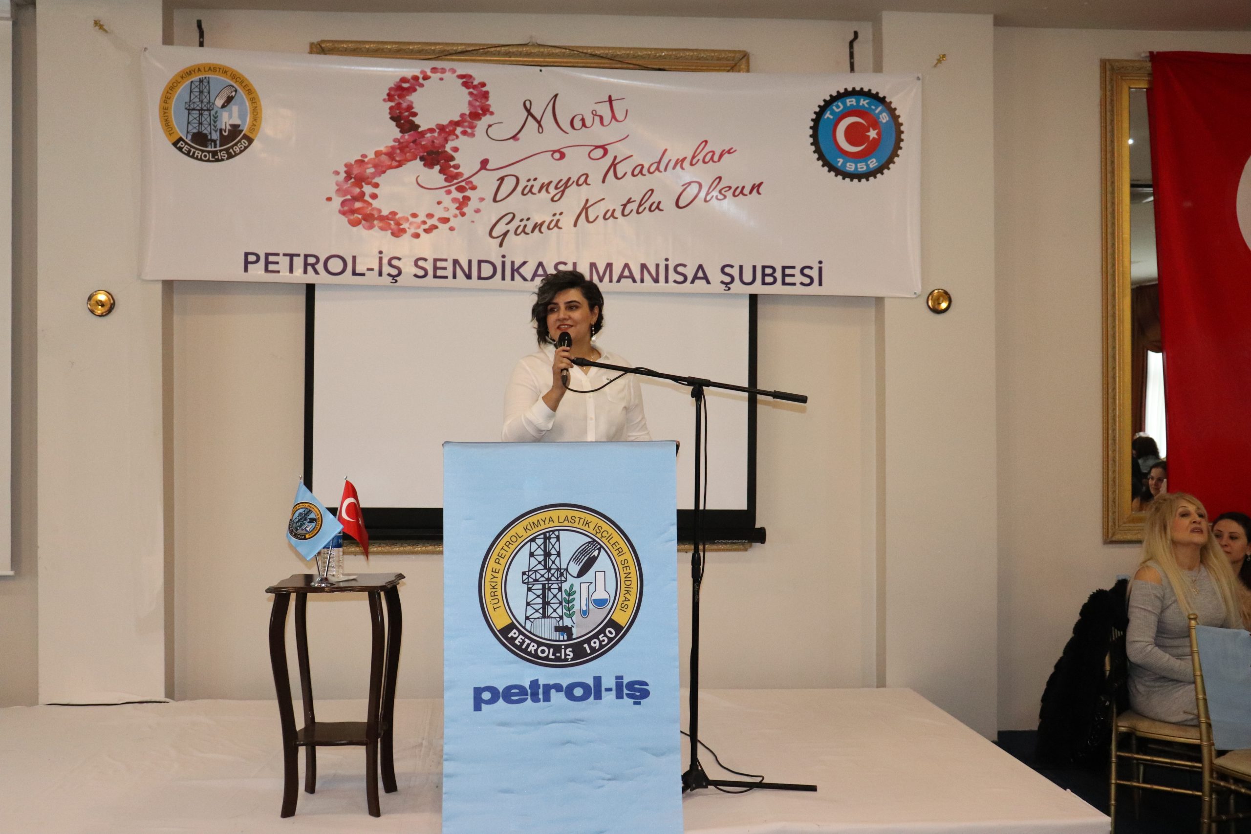 Sendikamız Merkez Yönetim Kurulu Üyeleri de etkinliğe katılarak üyelerimizle biraraya geldiler. Genel Başkanımız Süleyman Akyüz burada yaptığı konuşmasında 8 Mart’ın anlamı ve kadın hareketinin önemine değindi. Kadınların mutlak suretle örgütlenmesi gerektiğine vurgu yapan Genel Başkanımız Süleyman Akyüz, kadına yönelik her türlü şiddet ve ayrımcılığın ortadan kalkmasında sendikaların hayati önem taşadığını söyledi. Petrol-İş Sendikası’nın mücadele tarihinde Berec, Novamed, Bericap ve Flormar gibi kadınların öncülük ettiği mücadeleler olduğunu hatırlatan Genel Başkan Akyüz, birlik olarak, örgütlenerek ve sendikalaşarak zorlukların aşılabileceğini söyledi. Konuşmasının devamında Petrol-İş’in hem fiili mücadelesiyle hem de sözleşmelerine koyduğu maddelerle kadın üyelerinin haklarını koruduğunu belirten Genel Başkan, çalışma hayatında daha fazla kadına ulaşılması gerektiğini söyledi.