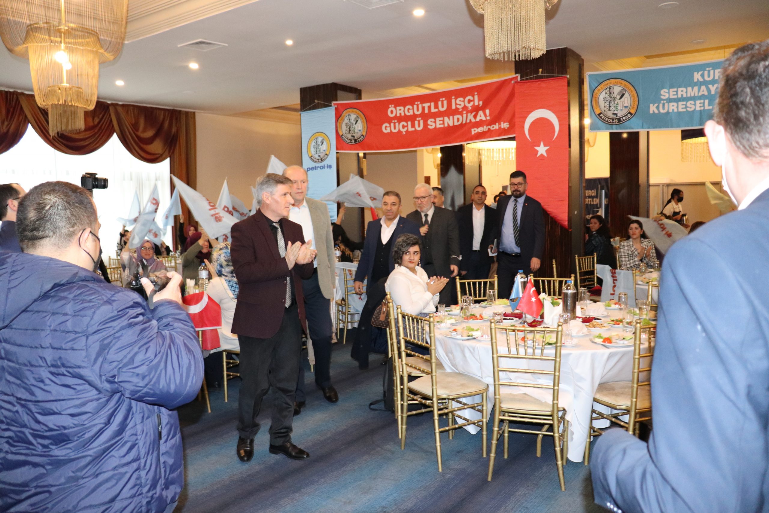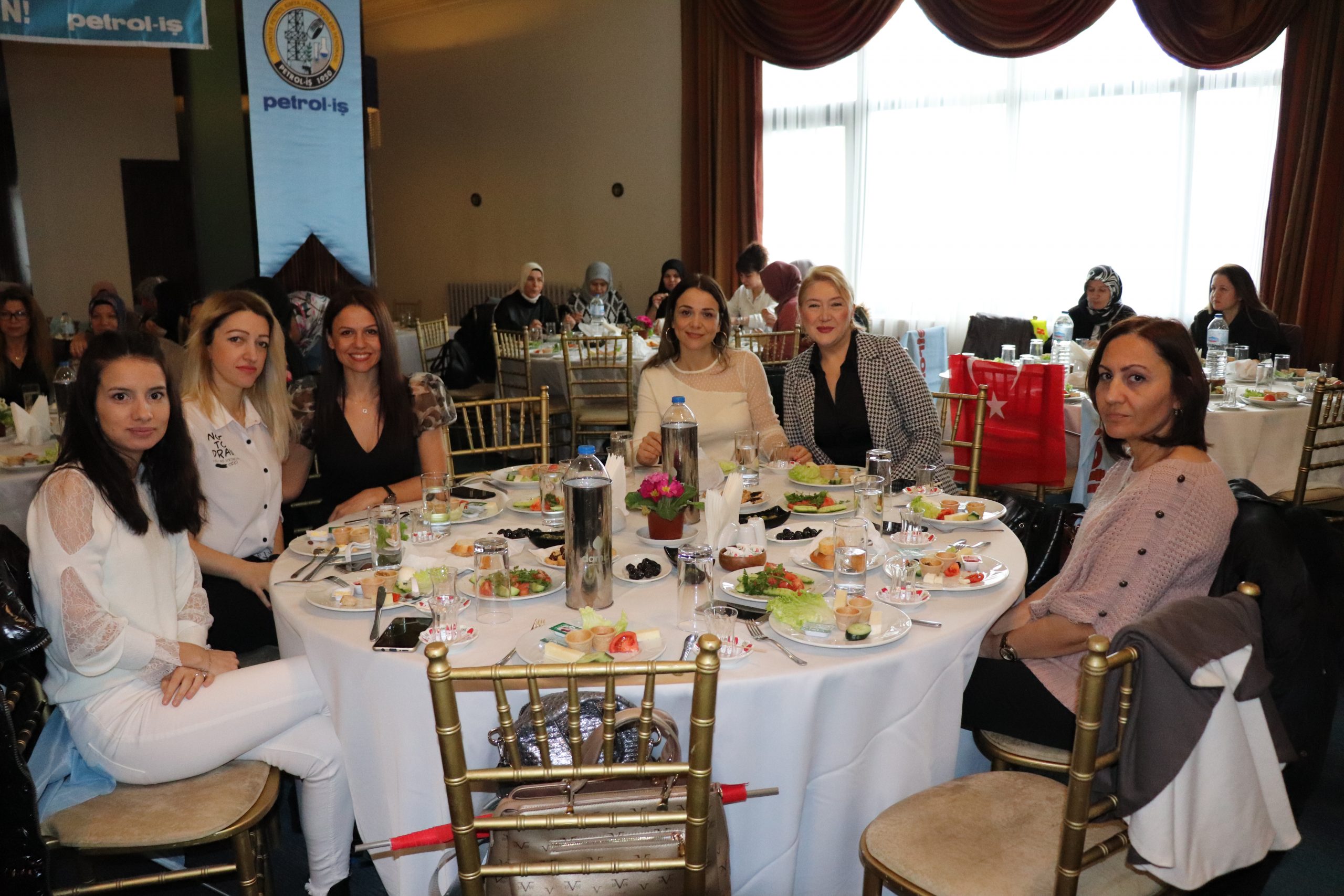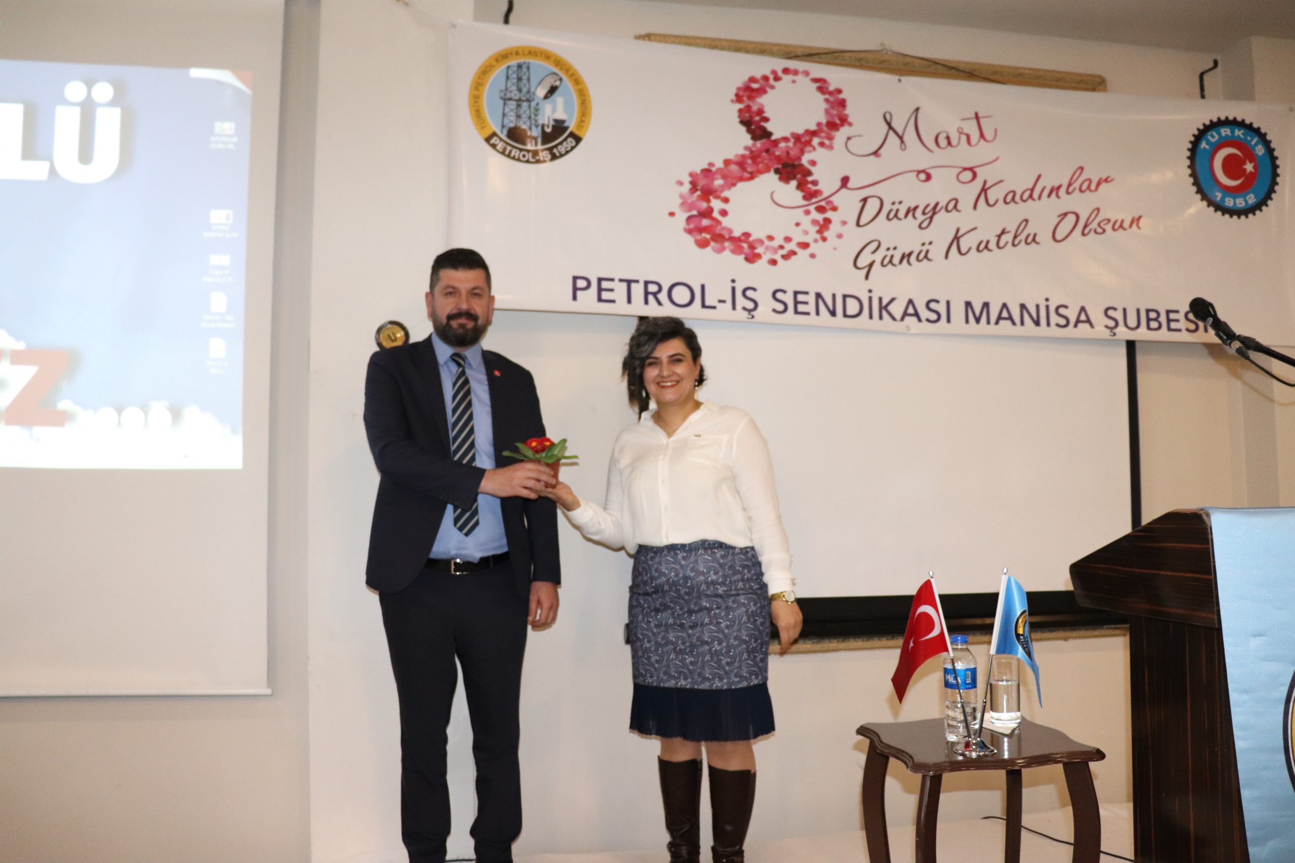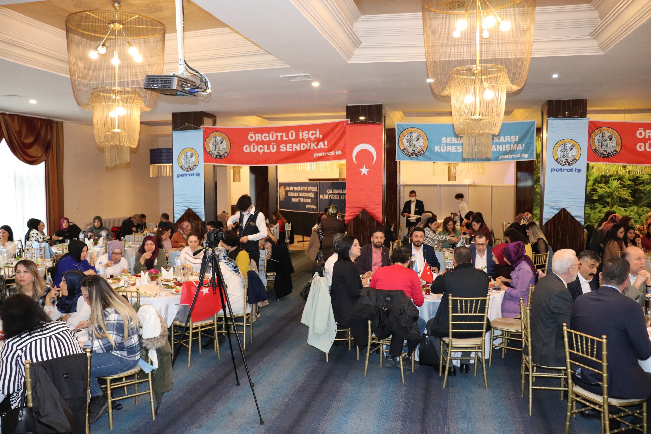 Sendikamız Merkez Yönetim Kurulu Üyeleri de etkinliğe katılarak üyelerimizle biraraya geldiler. Genel Başkanımız Süleyman Akyüz burada yaptığı konuşmasında 8 Mart’ın anlamı ve kadın hareketinin önemine değindi. Kadınların mutlak suretle örgütlenmesi gerektiğine vurgu yapan Genel Başkanımız Süleyman Akyüz, kadına yönelik her türlü şiddet ve ayrımcılığın ortadan kalkmasında sendikaların hayati önem taşadığını söyledi. Petrol-İş Sendikası’nın mücadele tarihinde Berec, Novamed, Bericap ve Flormar gibi kadınların öncülük ettiği mücadeleler olduğunu hatırlatan Genel Başkan Akyüz, birlik olarak, örgütlenerek ve sendikalaşarak zorlukların aşılabileceğini söyledi. Konuşmasının devamında Petrol-İş’in hem fiili mücadelesiyle hem de sözleşmelerine koyduğu maddelerle kadın üyelerinin haklarını koruduğunu belirten Genel Başkan, çalışma hayatında daha fazla kadına ulaşılması gerektiğini söyledi.
