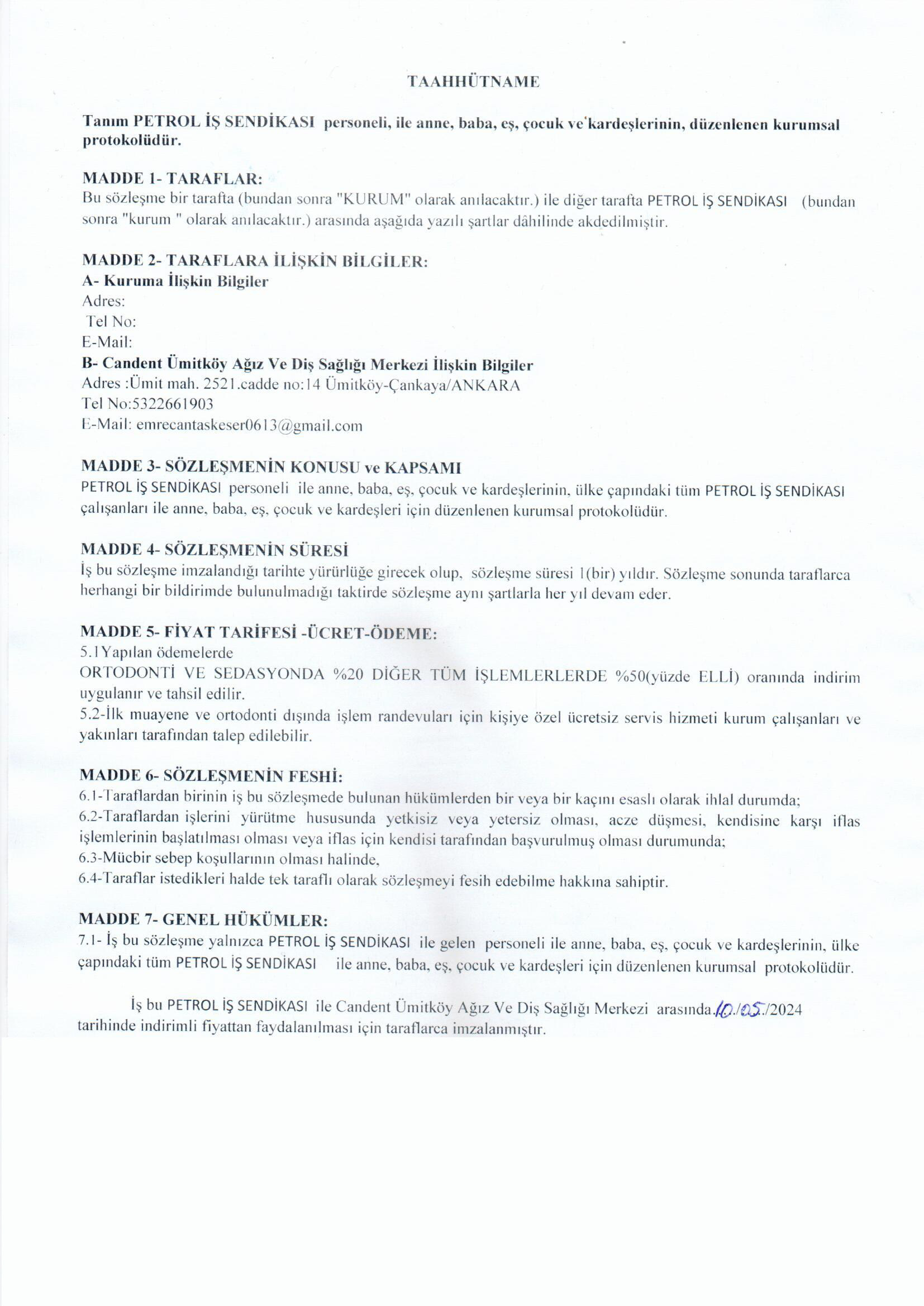 Özel Ankara Can Dental Ağız ve Diş Sağlığı Merkezi A.Ş. ile Petrol-İş Sendikası Ankara Şube  arasında üye ve  yakınlarına Ortodonti ve Sedasyonda  %20 Diğer Tüm İşlemlerde %50  indirimli  özel anlaşma sağlanmıştır.