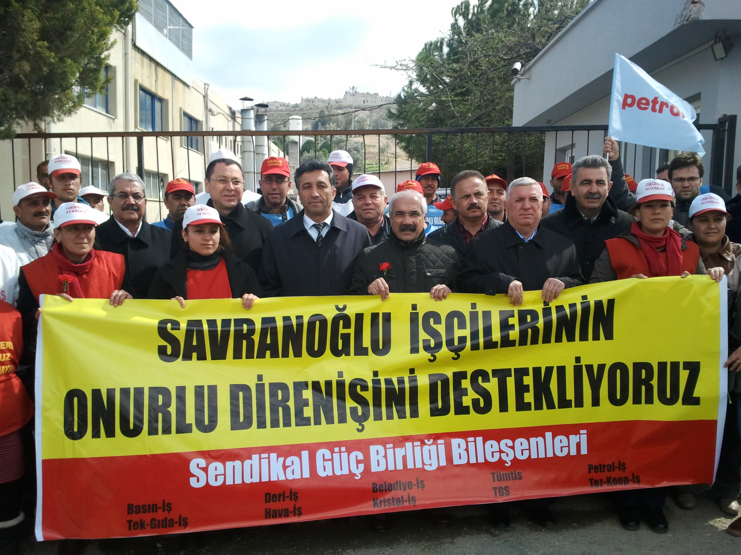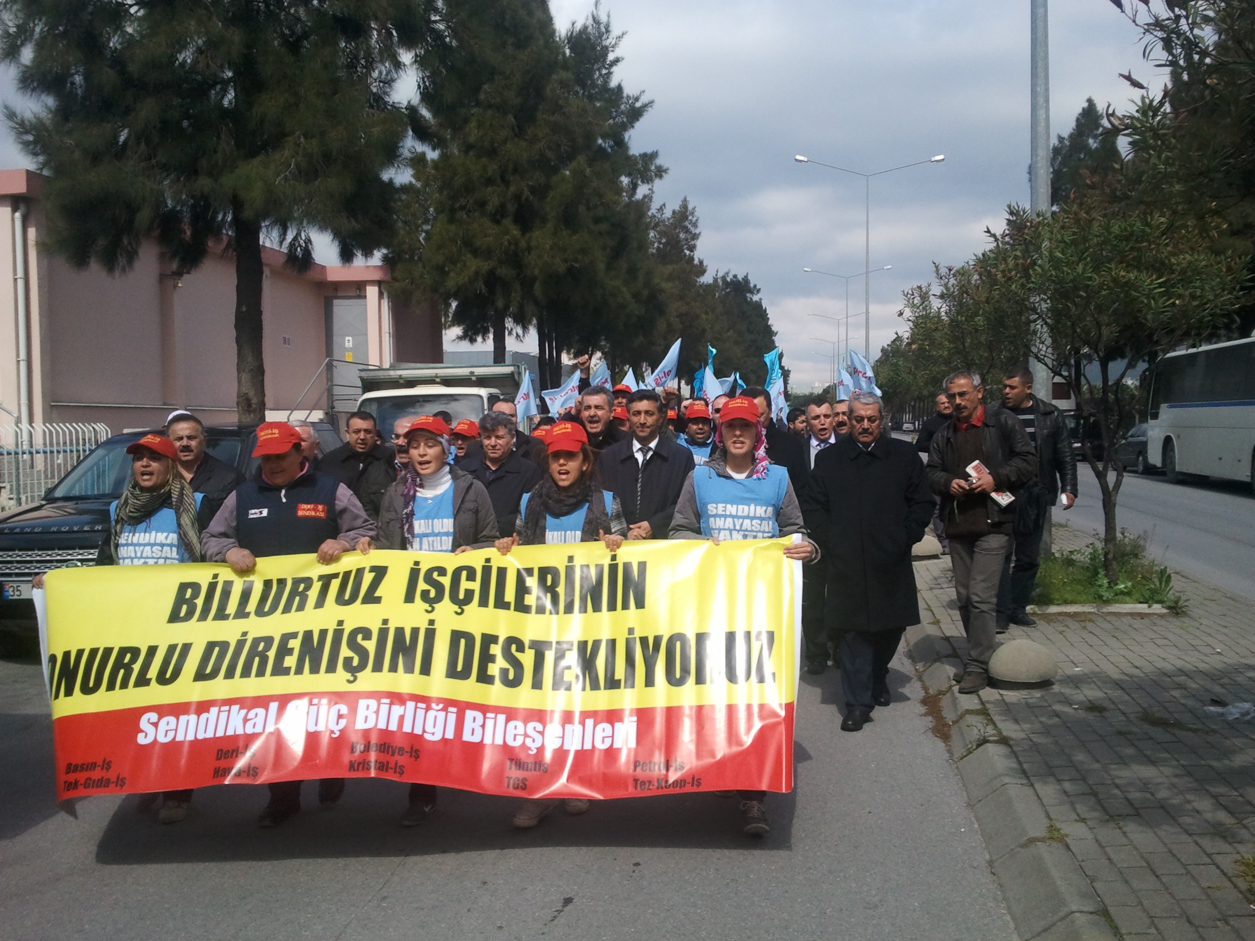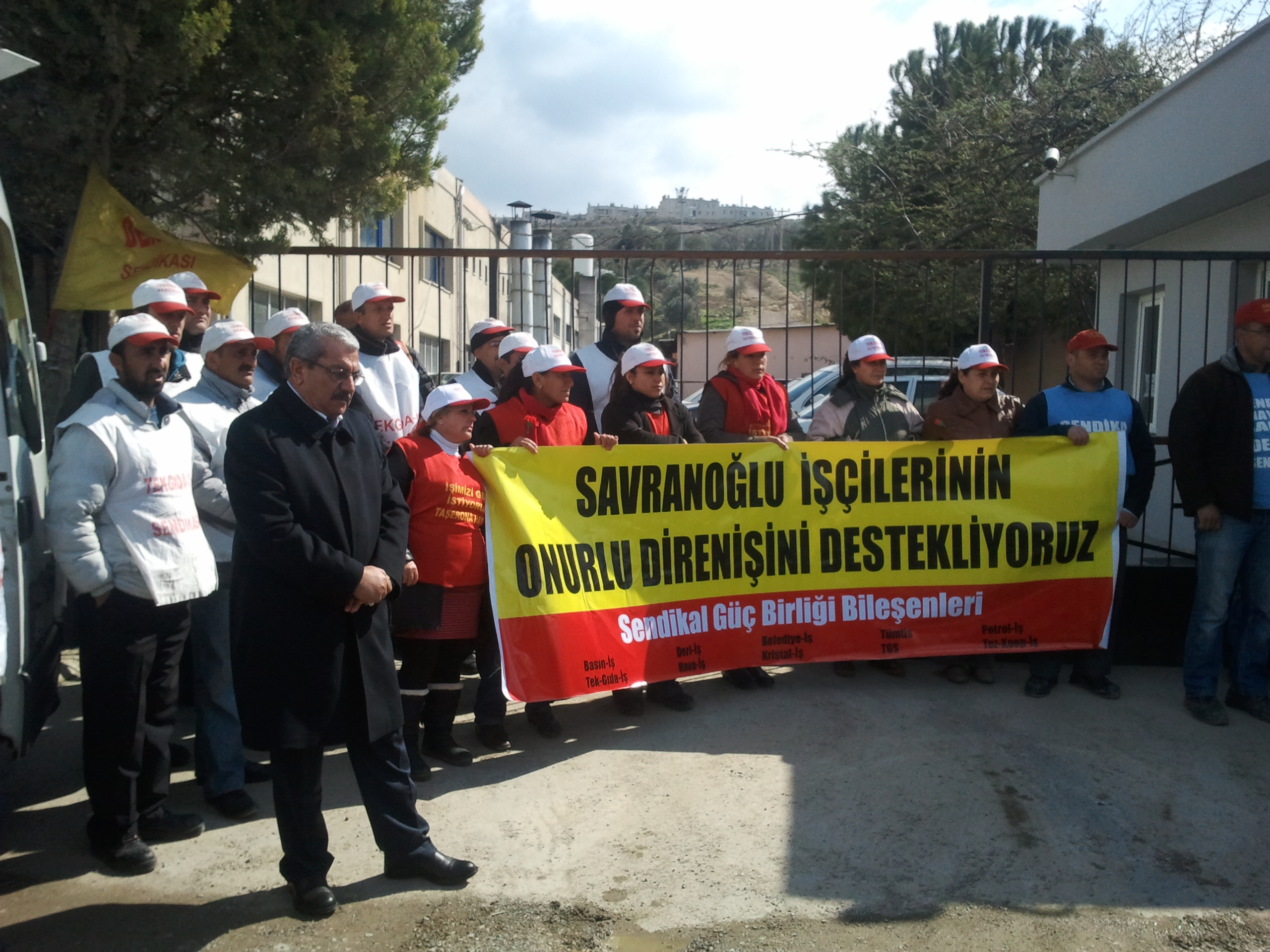 Sendikal Güç Birliği Platformu bileşenleri Genel Başkanları, İzmir Şube Başkanları ile yapılan basın toplantısı sonucu 14 Mart 2012 Çarşamba günü Genel Başkanımız Mustafa ÖZTAŞKIN, Şube Başkanımız A.Gani GÜNDOĞDU ve Şube Başkan Yardımcısı (Mali) Orhan ZENGİN ile Dyo Boya Fabrikası Çiğli çalışanı üyelerimizle birlikte Billur Tuz’ dan örgütlenme nedeniyle işten atılan ve 78 gündür eylemde olan işçiler ziyaret ettiler. Daha sonra Sendikal Güç Birliği Platformu Genel Başkanları ve Şube Başkanları 292 gündür eylemde olan Menemen’ de kurulu Savranoğlu Deri Fabrikası direnişçi işçilerini ziyaret ettiler.