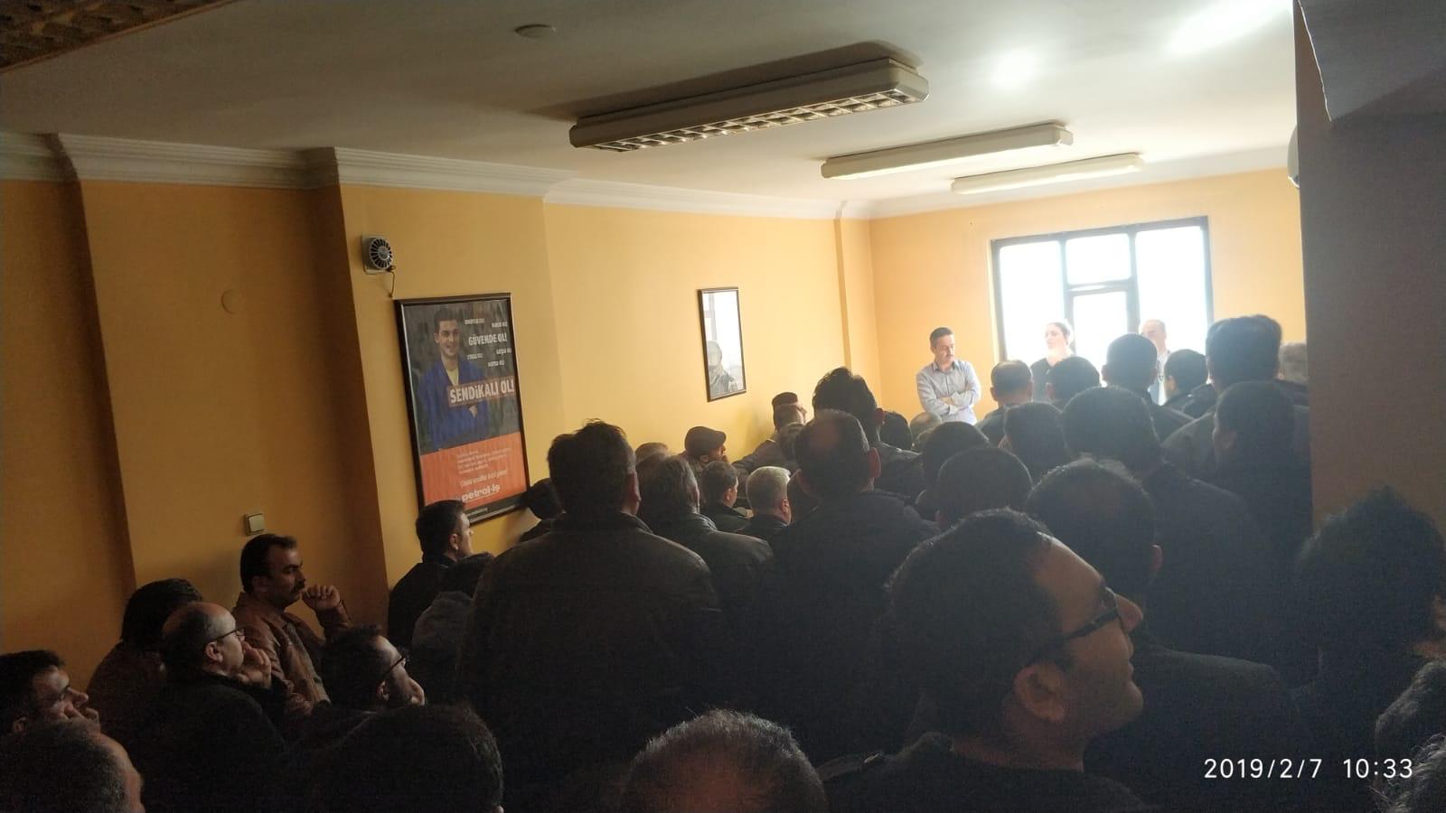 7 Şubat 2019 Perşembe günü Konya örgütlenme büromuzda Ankara Şube Başkanımız Ali Haluk Koşar, Ankara Şube Avukatımız Lütfiye Yazkan Pakpen işyerimizdeki üyelerimize yönelik bilgilendirme toplantısı yaptılar. Ankara Şube Avukatımız Lütfiye Yazkan, yaklaşık 4 aydır maaş ve sosyal yardımlarını alamayan üyelerimiz hukuki süreçte yapılması gerekenler ile ilgili üyelerimizi bilgilendirdi.