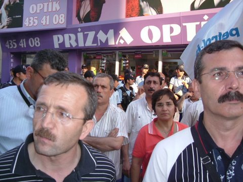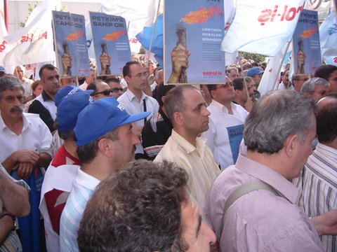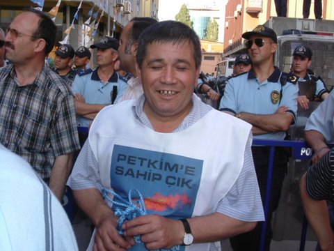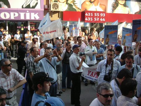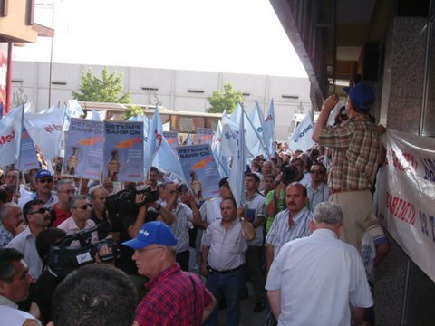PETKİM İŞÇİLERİ AKP İL ÖRGÜTÜ ÖNÜNDE EYLEM YAPTIÖzelleştirmeye karşı mücadele eden Petkim işçileri dün (14.06.2007) günü saat 18.00 de İzmir AKP İl Başkanlığı önünde basın açıklaması yaparak özelleştirme uygulamalarında ısrar den hükümeti protesto etti. İş çıkışı evlerine gitmeyip servis otobüsleri ile İzmir-Bayraklı’da bulunan İl binası önüne gelen işçiler polis tarafından alınan yoğun güvenlik önlemleri ile karşılaştı.