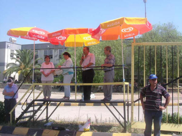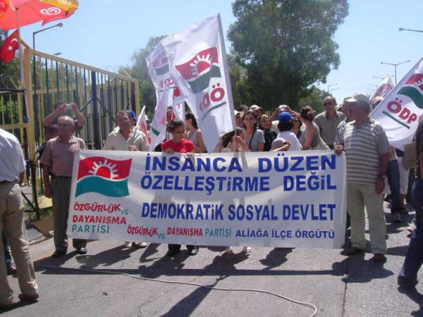 Petkim İşçileri satışa Direniyor!05.07.2007AKP hükümeti tarafından satılması için yoğun çaba sarf edilen Türkiye’nin tek petrokimya kompleksi Petkim’in satılmasına karşı direnen işçiler, bugün de işbaşı yapmayarak direnişini sürdürüyor. Satış işlemlerinin yapıldığı B Kapı önünde toplanan işçileri ziyaret edenlere bugün de yenileri eklendi.Bugünün ilk ziyareti halkın Yükselişi Partisi Genel başkan Yardımcıları, genel Merkez ve İl Yöneticileri “Petkim gibi bir büyük kuruluşun satılmasına kesinlikle karşı olduklarını, iktidara geldiklerinde yapacakları ilk işin ÖİB’yi kapatmak olacağını belirten temsilciler Petkim işçilerine başarılar dilediler.İkinci ziyaret Demokrat Partililer tarafından yapıldı. Milletvekili adayı Muhsin Erdem ve Parti Yöneticileri yaptıkları ziyaret ile desteklerini sundular, satışa karşı olduklarını belirttiler.Günün son heyeti Özgürlük ve Dayanışma Partisi oldu. İl Başkanı İbrahim Akın ve Milletvekili adayları ile ziyarete gelen ÖDP’liler Petkim işçilerine, parti olarak özelleştirmelere zaten karşı olduklarını, bu politikaların kaynağında İMF-DB programının olduğunu, gerçek kurtuluşun emekçilerin halkın iktidarında olduğunu söyleyerek, petkim işçilerine destek ve başarı dileklerini sundular.Öte yandan dün yola çıkarak Ankara’ya ihalenin yapılacağı Swissotel önüne gelen Petrol-İş Yöneticileri ve Petkim işçileri tepkilerini dile getirerek“Bu satış ahlaksızdır, bütün özelleştirmeler gibi ülke çıkarına aykırıdır, bu iş bitmedi, mücadelemiz devam edecek. 22 Temmuz Seçimlerinde memleketi satanlara en iyi cevabı sandıkta vereceğiz. Ayrıca Danıştay’da açtığımız dava sürüyor, bu satış hukuka da aykırıdır. İhale şartnamesinde yatırım-üretim, istihdam gibi konulara dair herhangi bir kısıt yok!Şunu net bir şekilde belirtiyoruz: Petkim’e ülkesini seven herkesin sahip çıkması gerekir, ama yalnız başımıza kalsak bile biz sahip çıkmaya devam edeceğiz.
