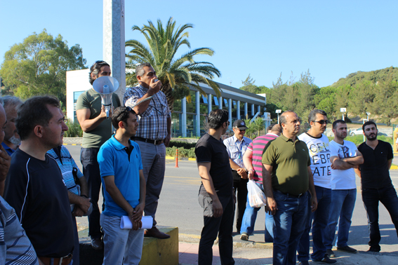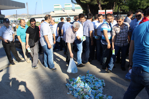 Aliağa Şubemizde örgütlü Petkim’de çalışan üyelerimiz, Sütaş’ın işçi çıkarmalarını protesto etmek amacıyla Petkim’de Sütaş ürünleri kullanılmamasını istediler. Gece vardiyasından çıkan yaklaşık 500 işçi, fabrika sahasında toplandıktan sonra Petkim tesislerinin dış kapısına alkışlar ve sloganlar atarak gelip, yanlarında getirdikleri Sütaş markalı yoğurt ve süt ürünlerini yerlere atarak Sütaş firmasının Bursa ve Aksaray’daki iş yerlerinden 59 işçinin çıkarılmasını protesto ettiler. Toplanan işçilere hitaben bir konuşma yapan Aliağa Şube Başkanımız Ahmet Oktay, Petrol-İş’in örgütlü olduğu işyerlerinde Sütaş ürünlerinin tüketilmemesini istedi.