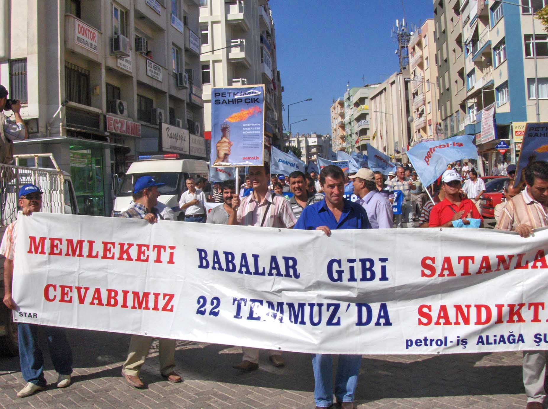 PETKİM’DE EYLEMLERE DEVAM!02.07.200729 Haziran Cuma günü, toplu iş sözleşmesindeki taleplerinin bir an önce yerine getirilmesi amacıyla yarım gün iş bırakan Petkim işçileri bugün (02 Temmuz 2007) sabah da işbaşı yapmayarak Aliağa’ya yürüdü. Sabah işe gelen yaklaşık bin işçi, otobüslerle Aliağa’daki Sendika Şube binasının önüne geldiler. Buradan yürüyerek ilçe merkezindeki PTT önüne gelen işçilere hitaben bir konuşma yapan Şube Başkanı İbrahim Doğangül şöyle konuştu: “Ülkemiz son derece önemli bir seçime doğru gidiyor, ancak yaratılan yapay gündemler ve kaotik ortam nedeniyle halkımız seçimleri konuşamıyor. AKP iktidarının yaptığı ekonomik-sosyal tahribat ve bunun nedeni olan neo liberal politikalar sorgulanamıyor. Bu politikaların en önemli parçası özelleştirmelerdir. Geldiği günden beri her şeyi satmakla övünen iktidar şimdi de, ülkemizin tek petrokimya üreticisi Petkim’i, alelacele satmaya çalışılıyor. Bütün bunlar olurken siyasi partilerimizden ses çıkmıyor, iktidara gelirlerse bu konuda neler yapacaklarını doğrusu çok fazla bilmiyoruz. İşte bu nedenle biz de kendilerine yazılı olarak bir kez daha soralı istedik: Siz bu seçim barajlarını aşıp Meclis’e girebilirseniz ne yapacaksınız? IMF politikalarına, özelleştirme uygulamalarına devam mı edeceksiniz? Kendilerine bu amaçla hazırladığımız metni birazdan fakslayacağız. Bilmek istiyoruz: Biz burada Aliağa halkıyla birlikte mücadele ederken, onlar nerede olacaklar? Bizim yanımızda mı, karşımızda mı? Bu tavırları bizim 22 Temmuz’da tutum açısından belirleyici olacak. Biz IMF partilerine, özelleştirmecilere oy vermeyeceğiz. Sol-sosyalist parti ve adaylara sormuyoruz, çünkü onlar zaten kamusal mülkiyetten, bütün üretim araçlarının özel tekellerin değil, halkın malı olmasından, dünya nimetlerinin eşit ve adil bölüşümünden yanalar; böyle yazıyor parti programlarında, seçim bildirgelerinde. Bunun dışındaki partilerin ise programları fazla net değil, bu yüzden kendilerine yazılı olarak soracağız. Daha sonra bu partilerin Aliağa İlçe Örgütlerini de ziyaret edip, eğer bizim gibi düşünüyorlar, yani özelleştirmenin yanlışlığına inanıyorlarsa bu mücadeleye destek vermelerini isteyeceğiz. Bütün olumsuzluklara rağmen, bugüne kadar olduğu gibi yine direneceğiz ve Petkim’in satılmasının ne kadar yanlış bir şey olduğunu ortaya koyacağız. Ve göreceksiniz çok yakında kamuoyu başta Petkim olmak üzere özelleştirmeler ve yıkıcı sonuçlarını tartışmaya başlayacak. Bu hafta Türkiye Petkim’i konuşacak!”Bu konuşmanın ardından Doğangül, bir grup işçiyle birlikte Aliağa Postanesi’ne gidip, elindeki metni CHP, Demokrat Parti, Milliyetçi Hareket Partisi ve Saadet Partisi Genel Başkanlıklarına gönderdi. Saat 09.45’e kadar süren bu eylemin ardından işçiler, geldikleri güzergâhtan yürüyerek Sendikanın önüne geldiler; burada bekleyen otobüslere binerek Petkim’e, işlerinin başına döndüler.