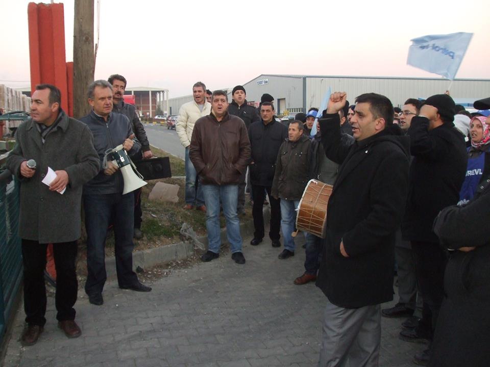 Düşova konuşmasının devamında ise, “Sendika olarak fabrika içinde çalışan üyelerle birlikte, inatla, kararlılık ve inanç ile mücadelemizi sonuna kadar sürdüreceğiz. Türkiye’deki yasalara ve anayasaya göre sendikalaşmayı engellemek suçtur. İşveren sanırım bunun farkında değil. İşverenin içerideki arkadaşlara baskı yaparak, tehdit ederek sendikalaşmalarını işten atarak diğer arkadaşlara gözdağı vererek, engelleme girişimini basın yolu ile suç duyurusunda bulunuyorum. İşverenler tarafından sendikaya bağlı 5 işçi işten çıkarıldı. İçeride sendikalı olanları istifaya zorlamak için tehdit etmiştir. Bazılarını ise fabrika küçülmeye gidiyor bahanesi ile çıkarmıştır” dedi.