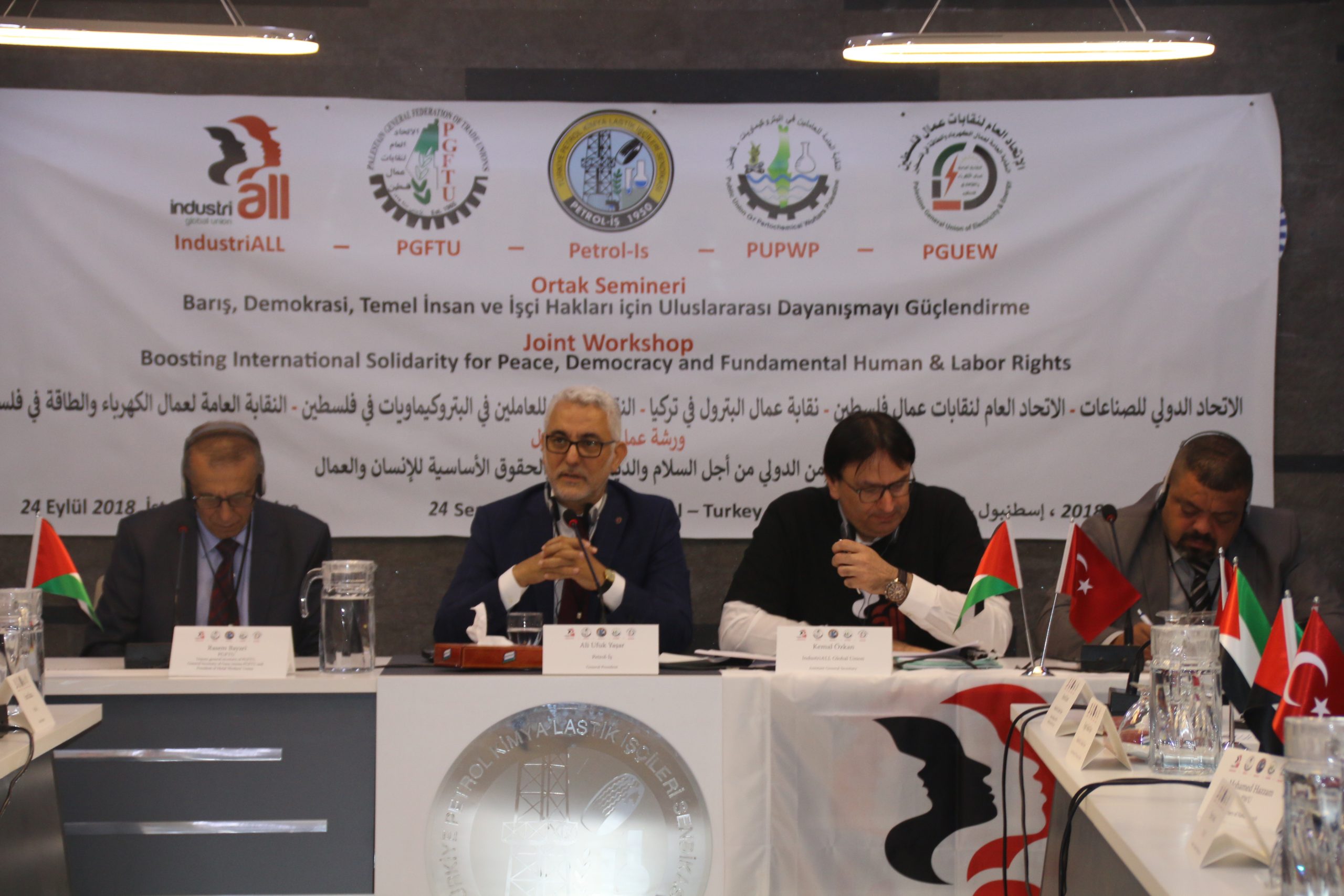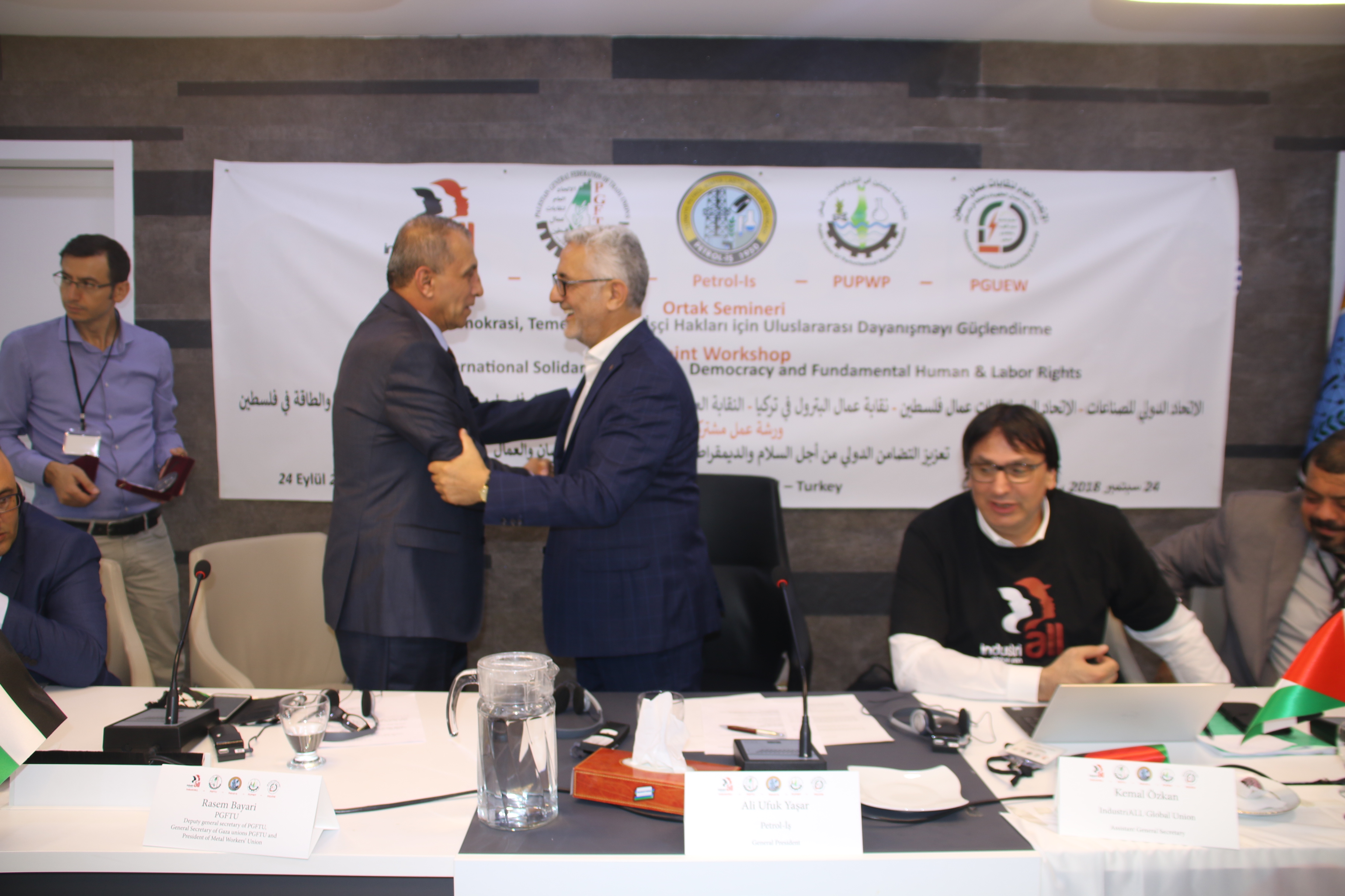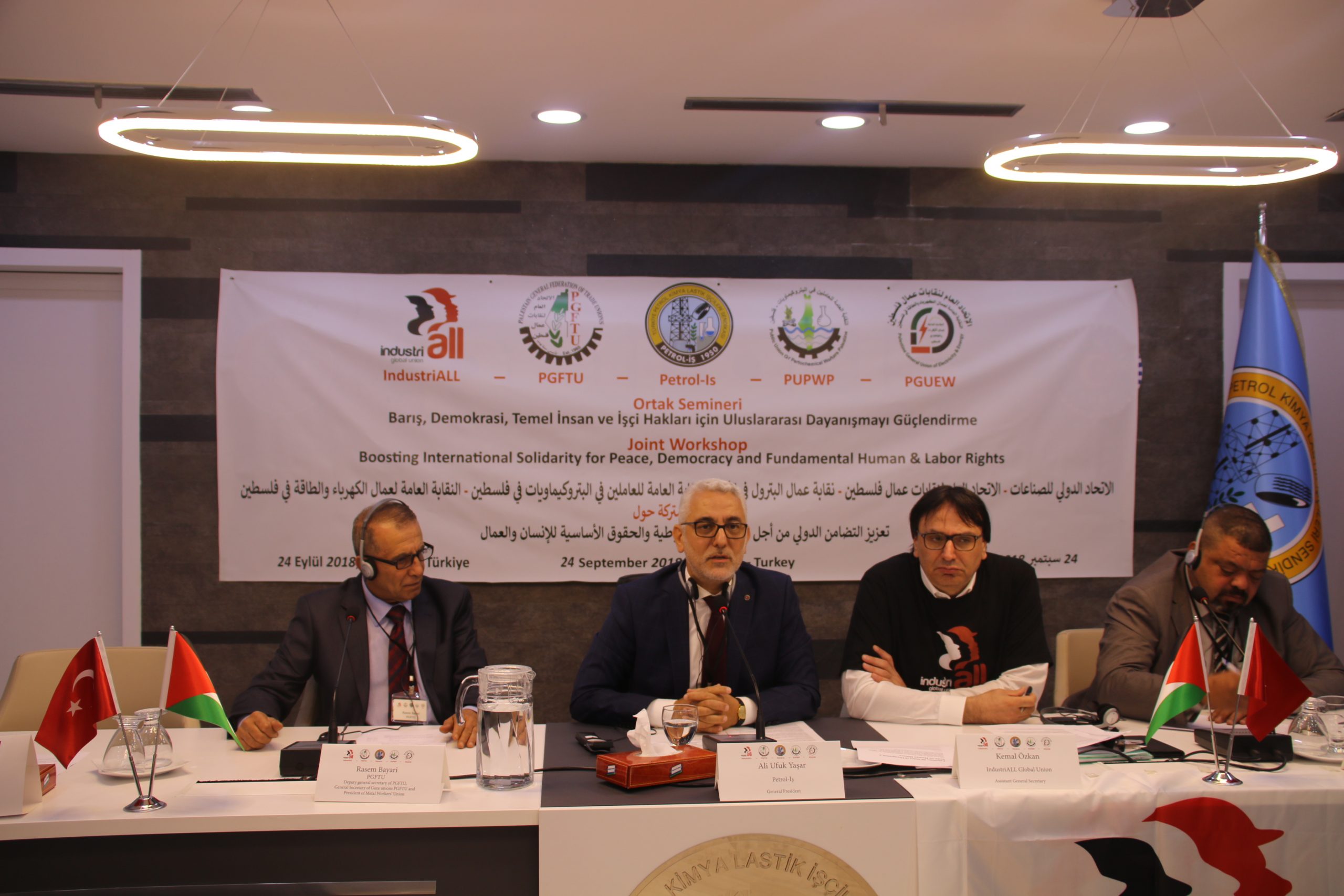 Sendikamızın son olarak 26 Mart tarihinde Filistin’e yaptığı ziyaretin ardından Filistin Sendikaları ile dayanışma ve işbirliği süreci devam ediyor. Bugün (24 Eylül 2018), Filistin halkı ve sendikaları ile varolan ilişkileri daha da ilerletmek için Petrol-İş Genel Merkezinde “Barış, Demokrasi, Temel İnsan ve İşçi Hakları İçin Uluslararası Dayanışmayı Güçlendirme Semineri” yapıldı.