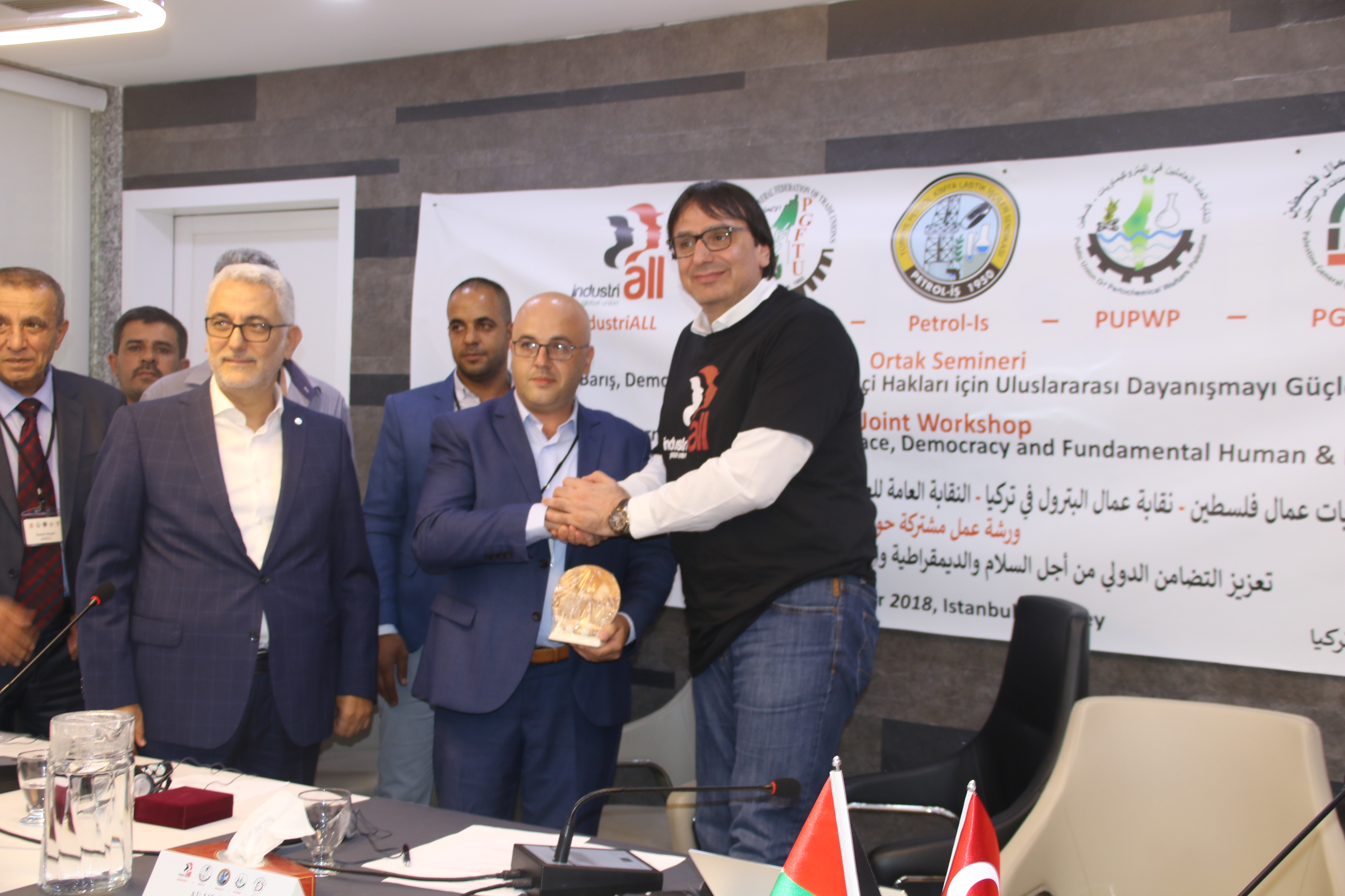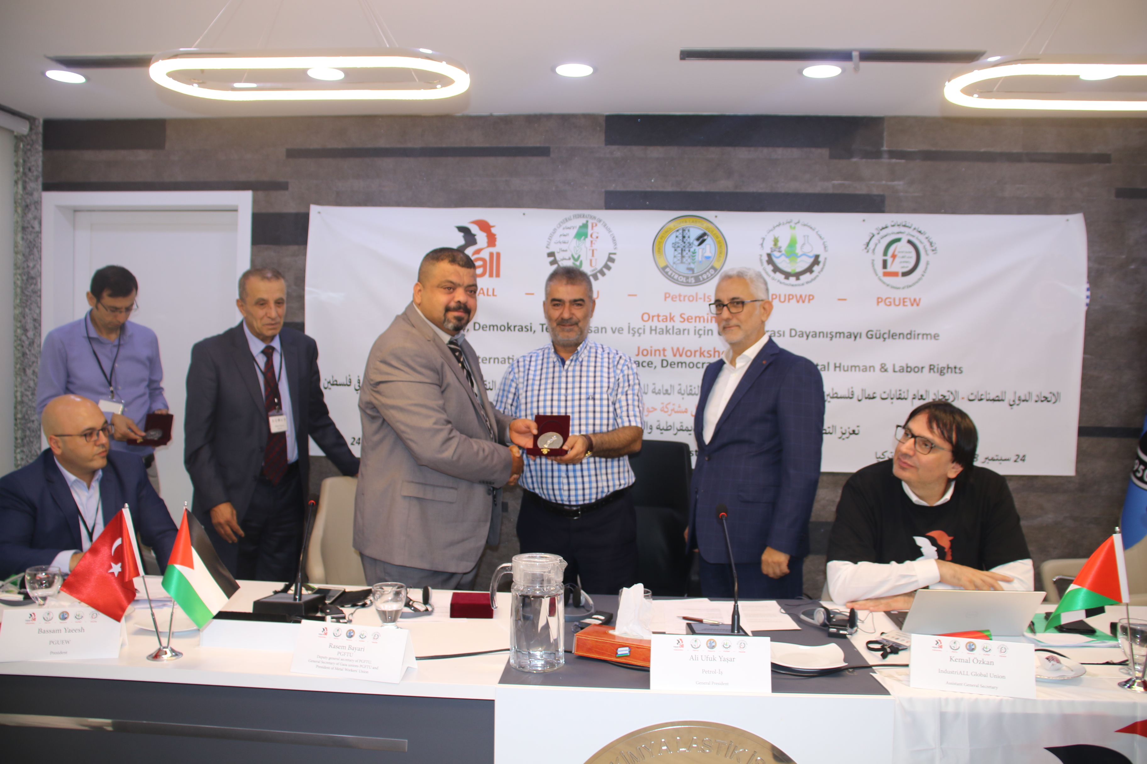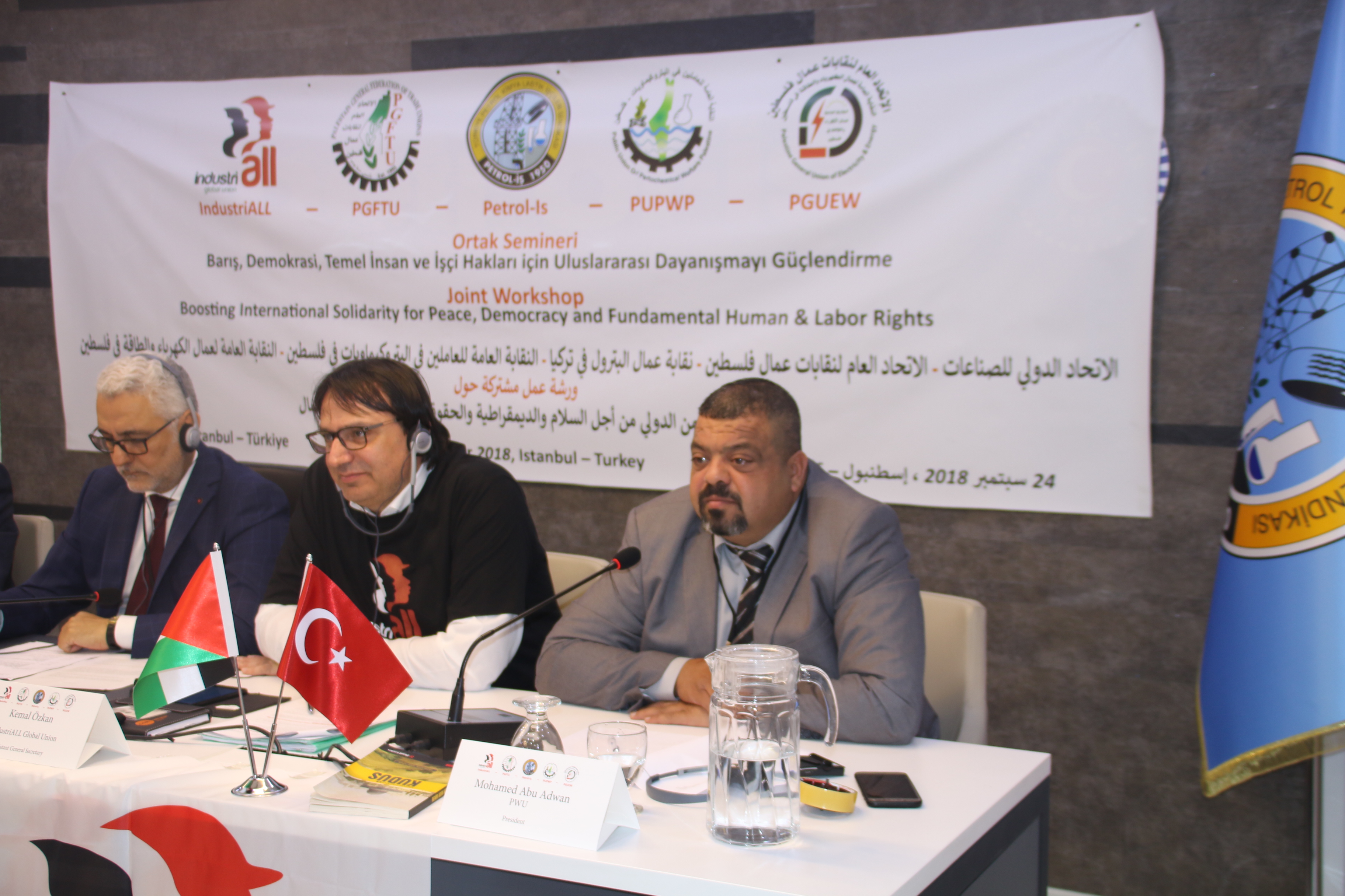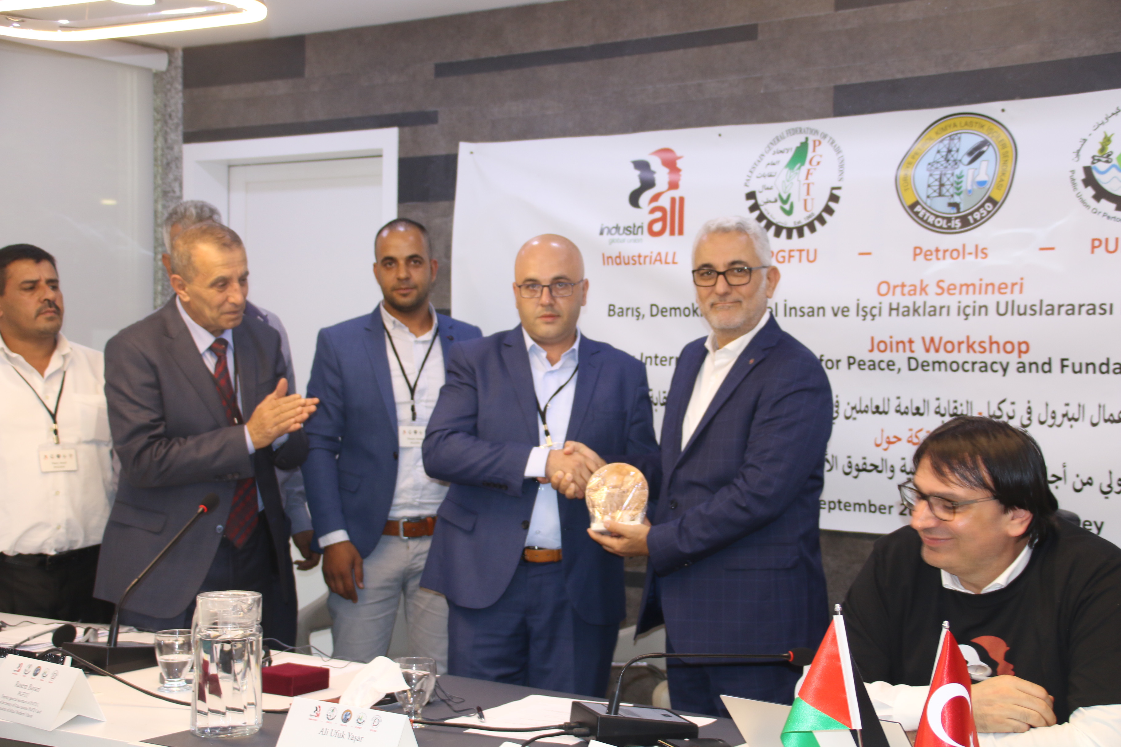 Sendikamızın son olarak 26 Mart tarihinde Filistin’e yaptığı ziyaretin ardından Filistin Sendikaları ile dayanışma ve işbirliği süreci devam ediyor. Bugün (24 Eylül 2018), Filistin halkı ve sendikaları ile varolan ilişkileri daha da ilerletmek için Petrol-İş Genel Merkezinde “Barış, Demokrasi, Temel İnsan ve İşçi Hakları İçin Uluslararası Dayanışmayı Güçlendirme Semineri” yapıldı.