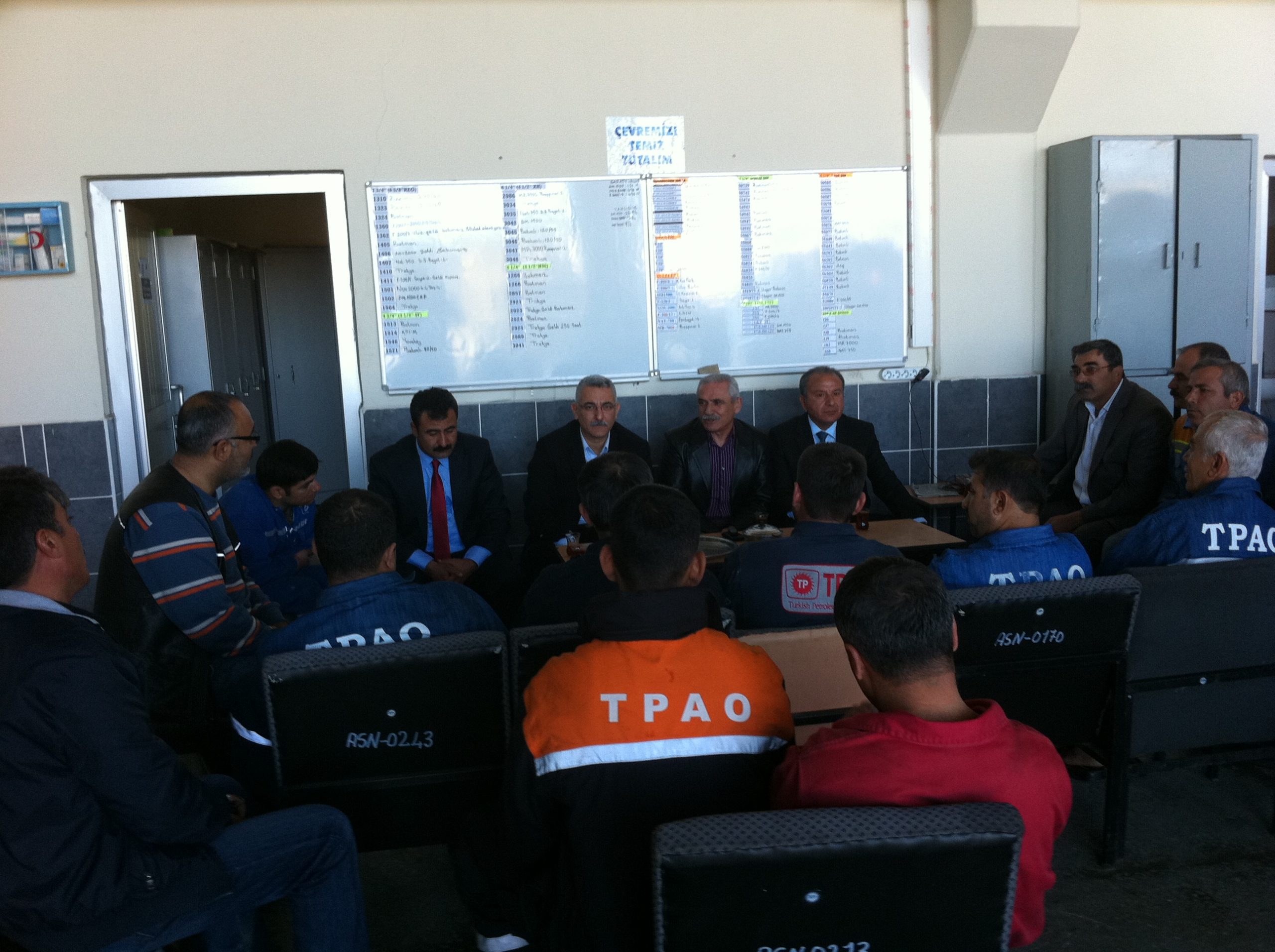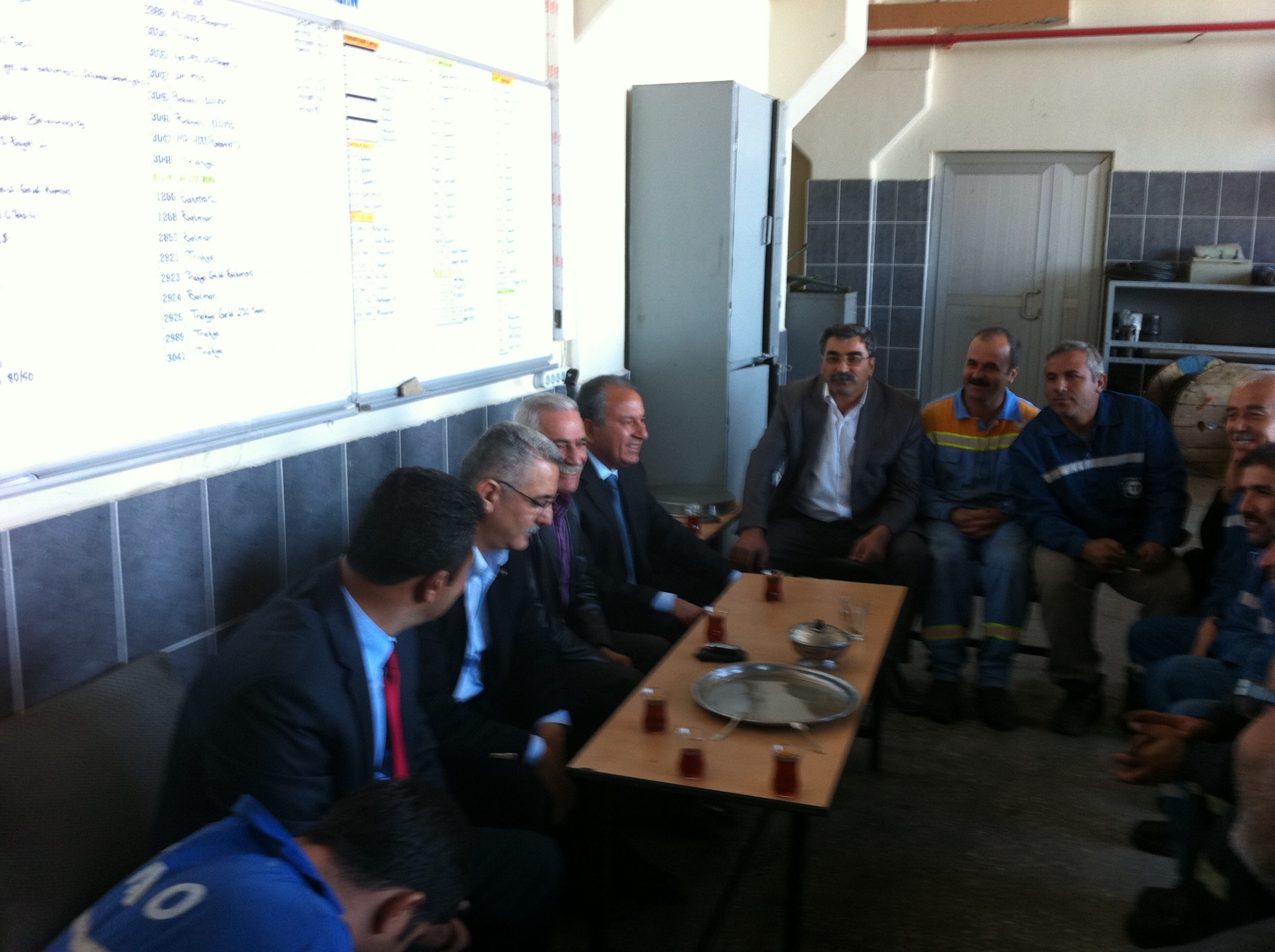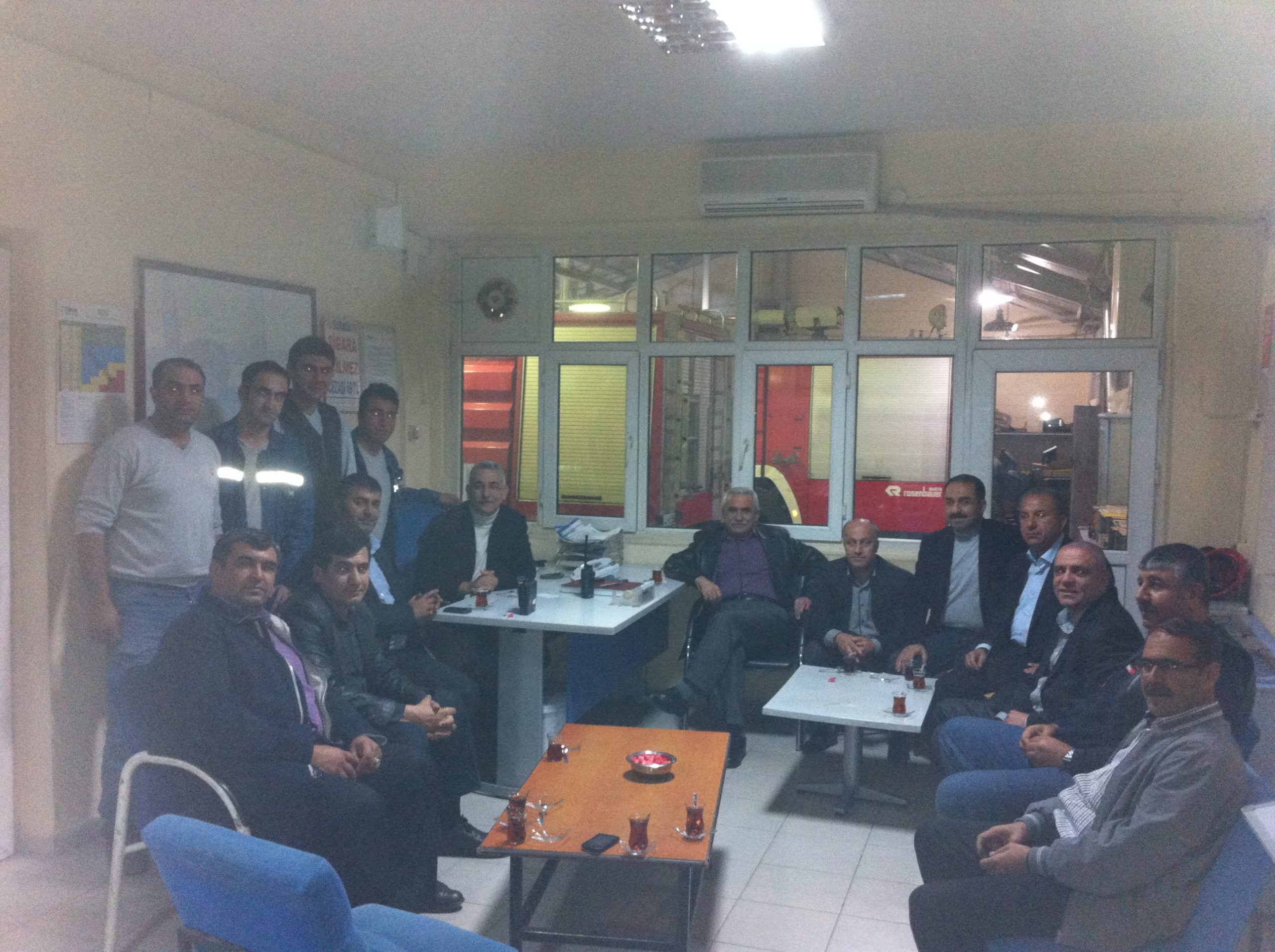 Batman Bölge Müdürlüğü’ne bağlı, Siirt Sondaj Bölge Müdürlüğü Sondaj Kulesi’ne gelerek burada çalışan arkadaşlarla konuşan merkez yöneticilerimiz, Genel Başkanın da katılımıyla 1 Kasım gecesi Diyarbakır’da Batman TPAO Bölge Müdürlüğü’ne bağlı Sarıcak Kompresör Şefliği’nde gece vardiyasında çalışan işçileri ziyaret ettiler.