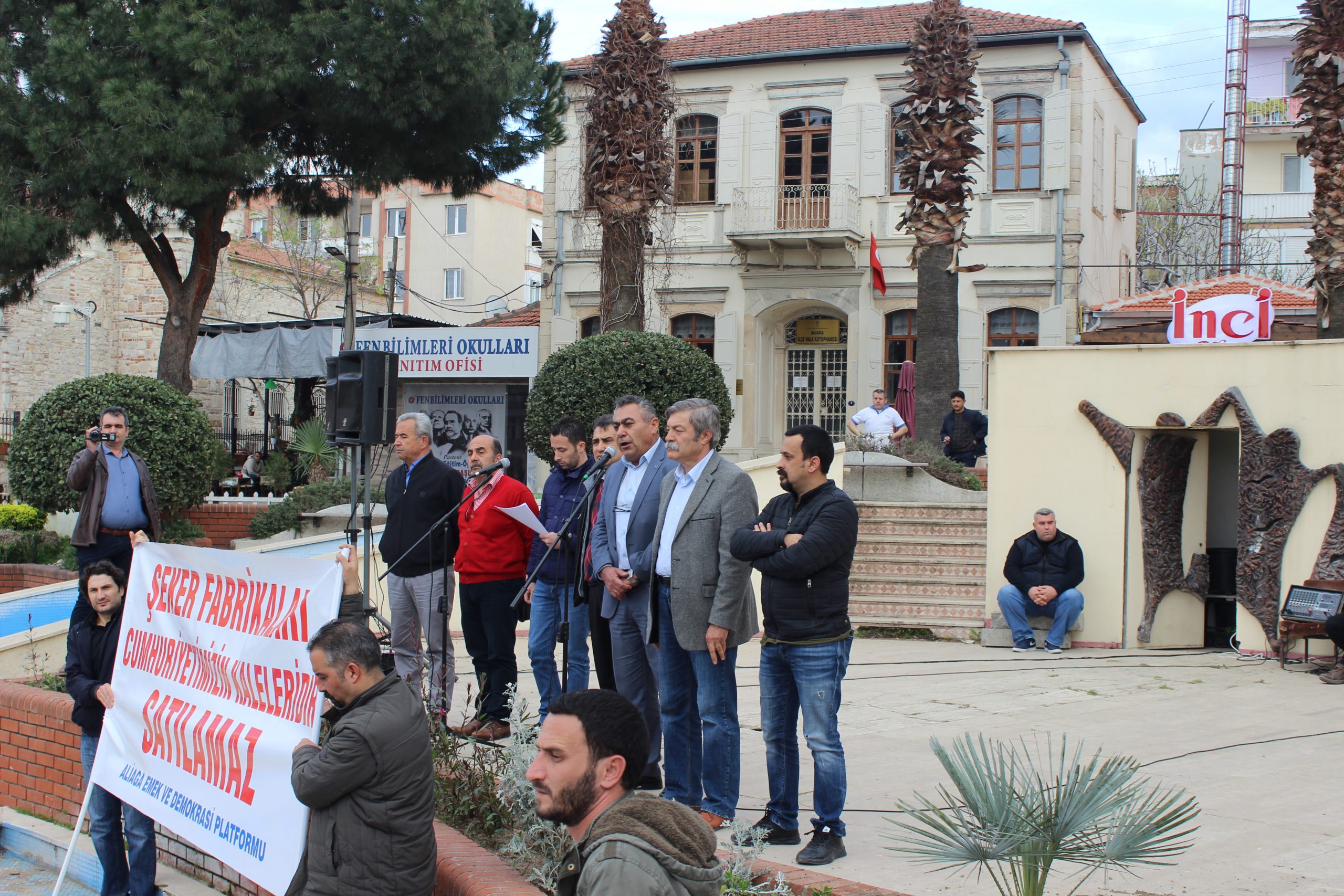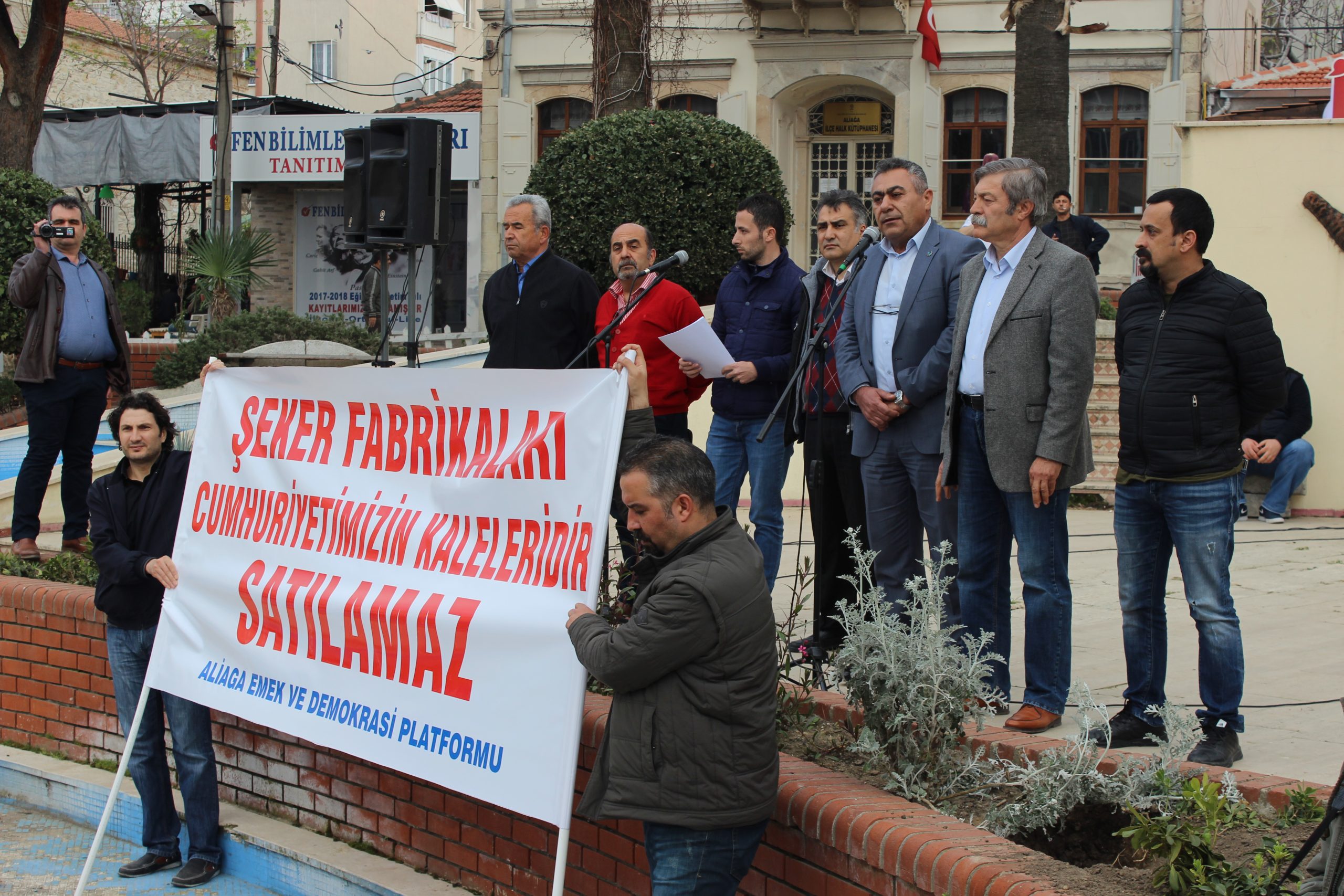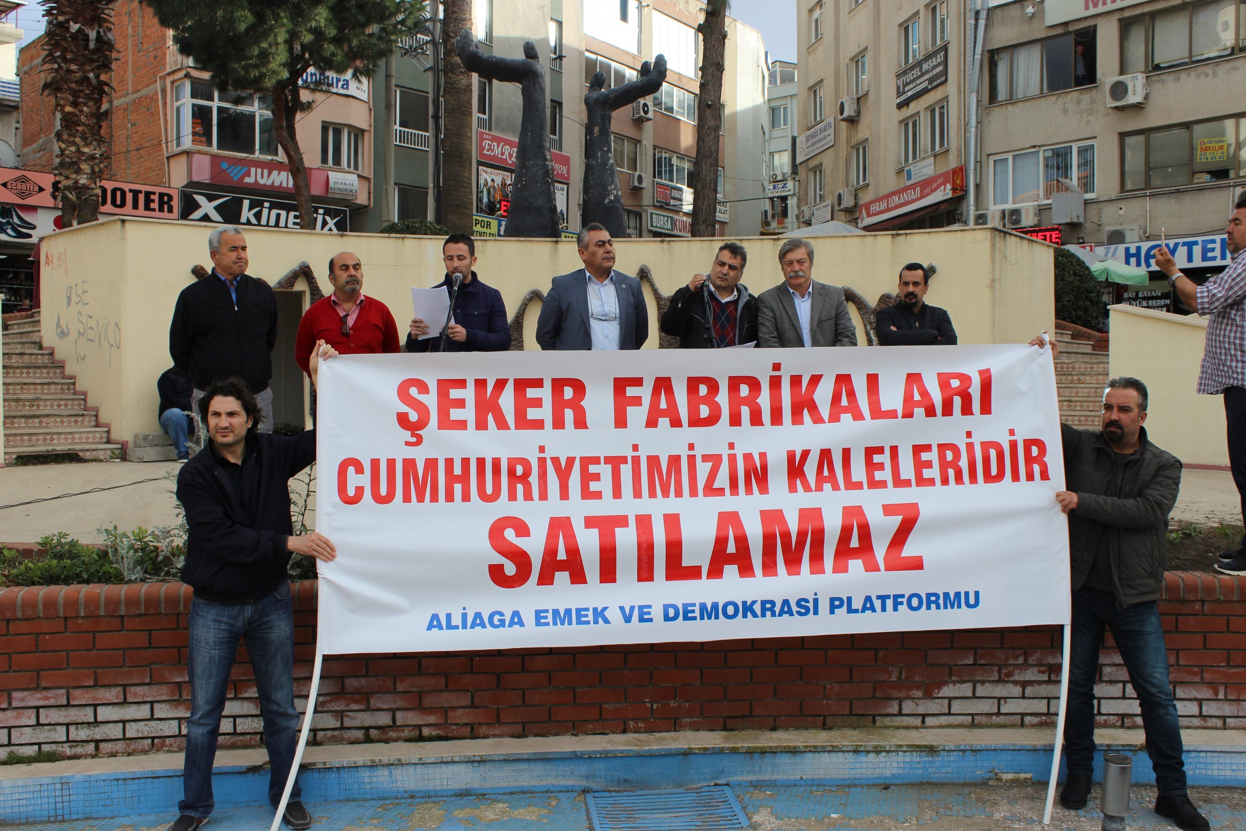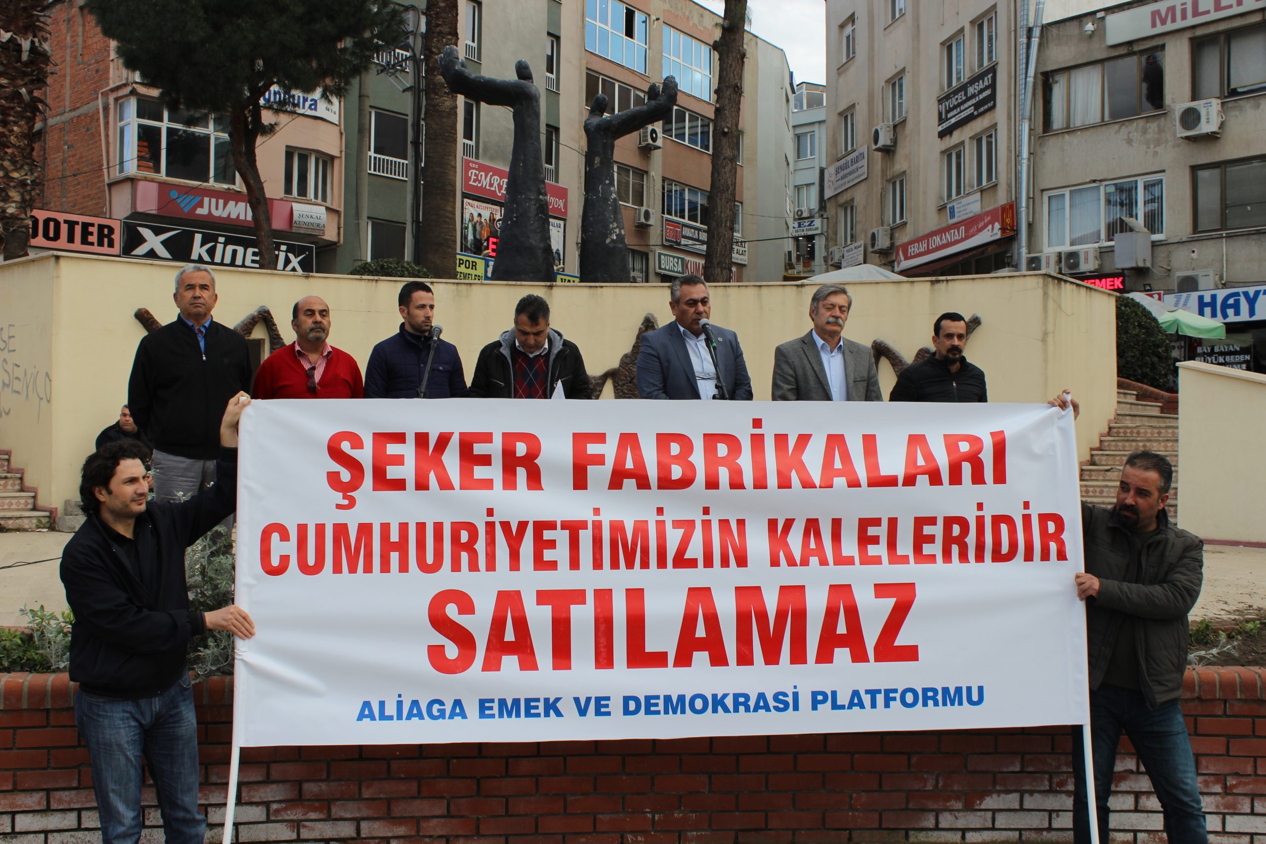 Aliağa Emek ve Demokrasi Platformu Bileşenleri olarak 19 Mart Pazartesi günü Aliağa Demokrasi Meydanında Şeker Fabrikalarının Özelleştirilmesi ve İş Cinayetleri ile ilgili bir basın açıklaması yaptılar.