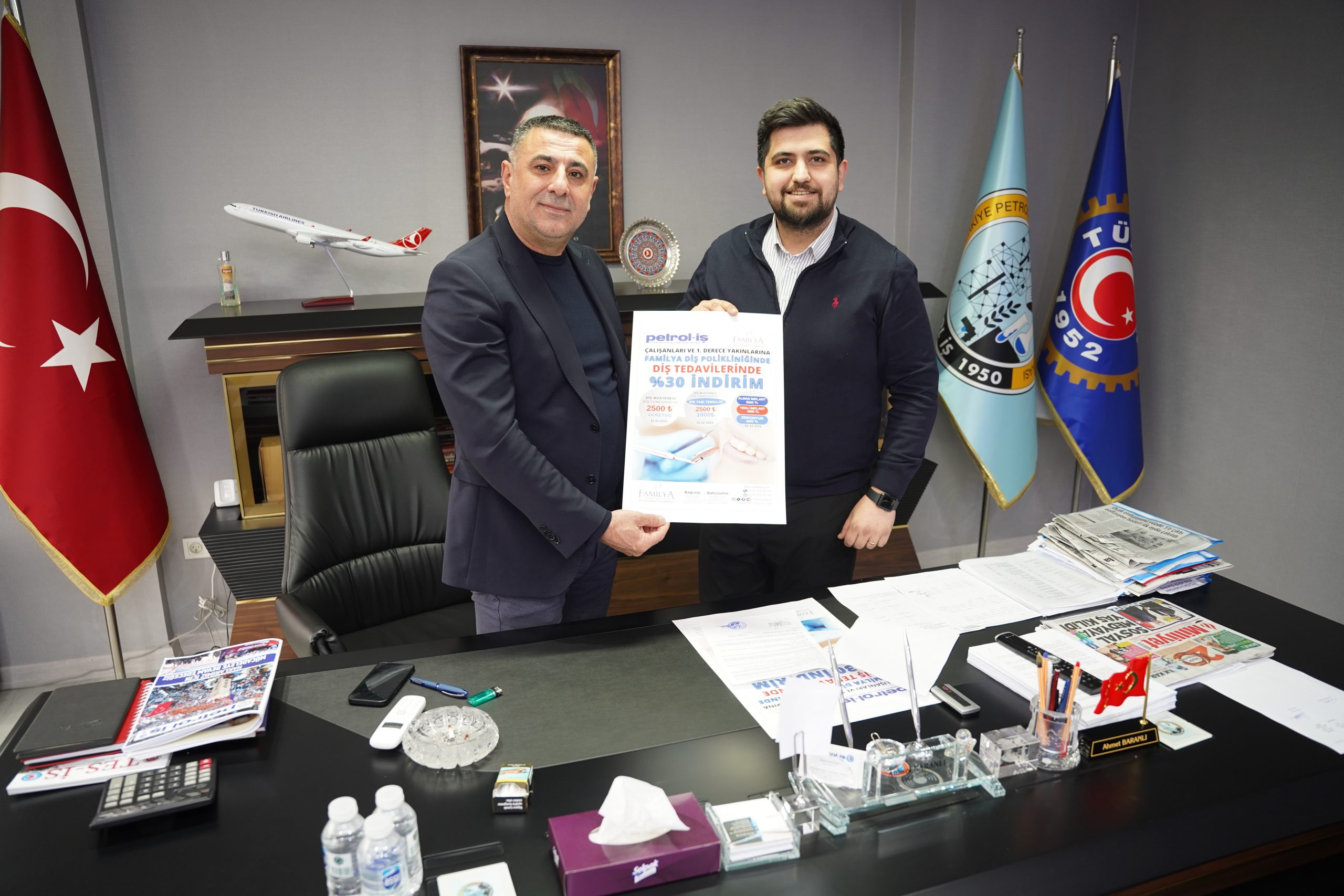 Sendikamızda örgütlü üyelerimizin ve birinci derece yakınlarının, uygun koşullarda nitelikli sağlık hizmeti alabilmesi için Familya Ağız ve Diş Sağlığı Grubu arasında kurumsal anlaşma yapılmıştır. 5 Şubat Çarşamba günü Genel Merkezimizde Familya Ağız ve Diş Grubu Genel Direktörü Ali Avcılar ve Genel Sekreterimiz Ahmet Baranlı arasında imzalanan mutabakata göre diş tedavilerinde %30 indirim sağlanacaktır.