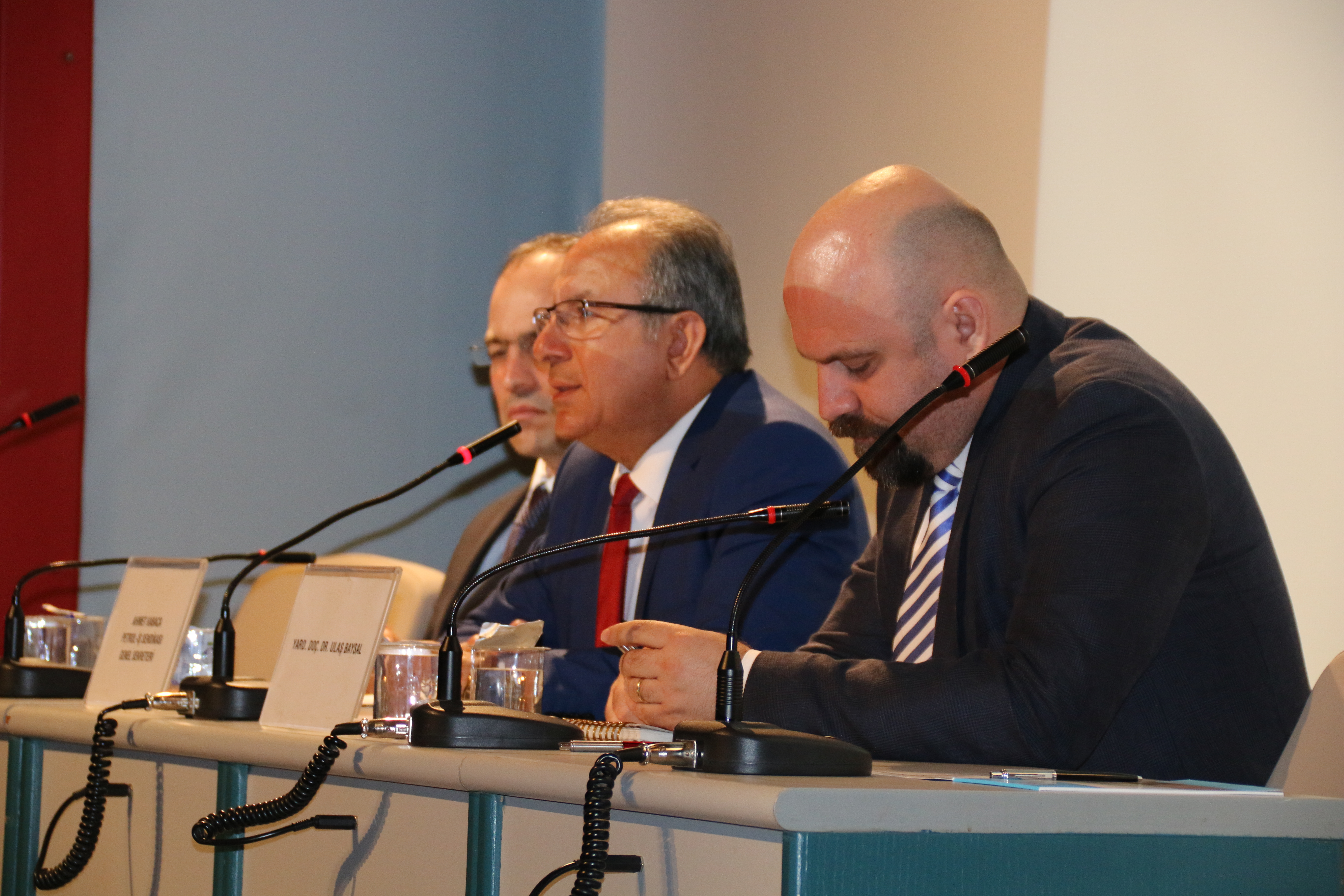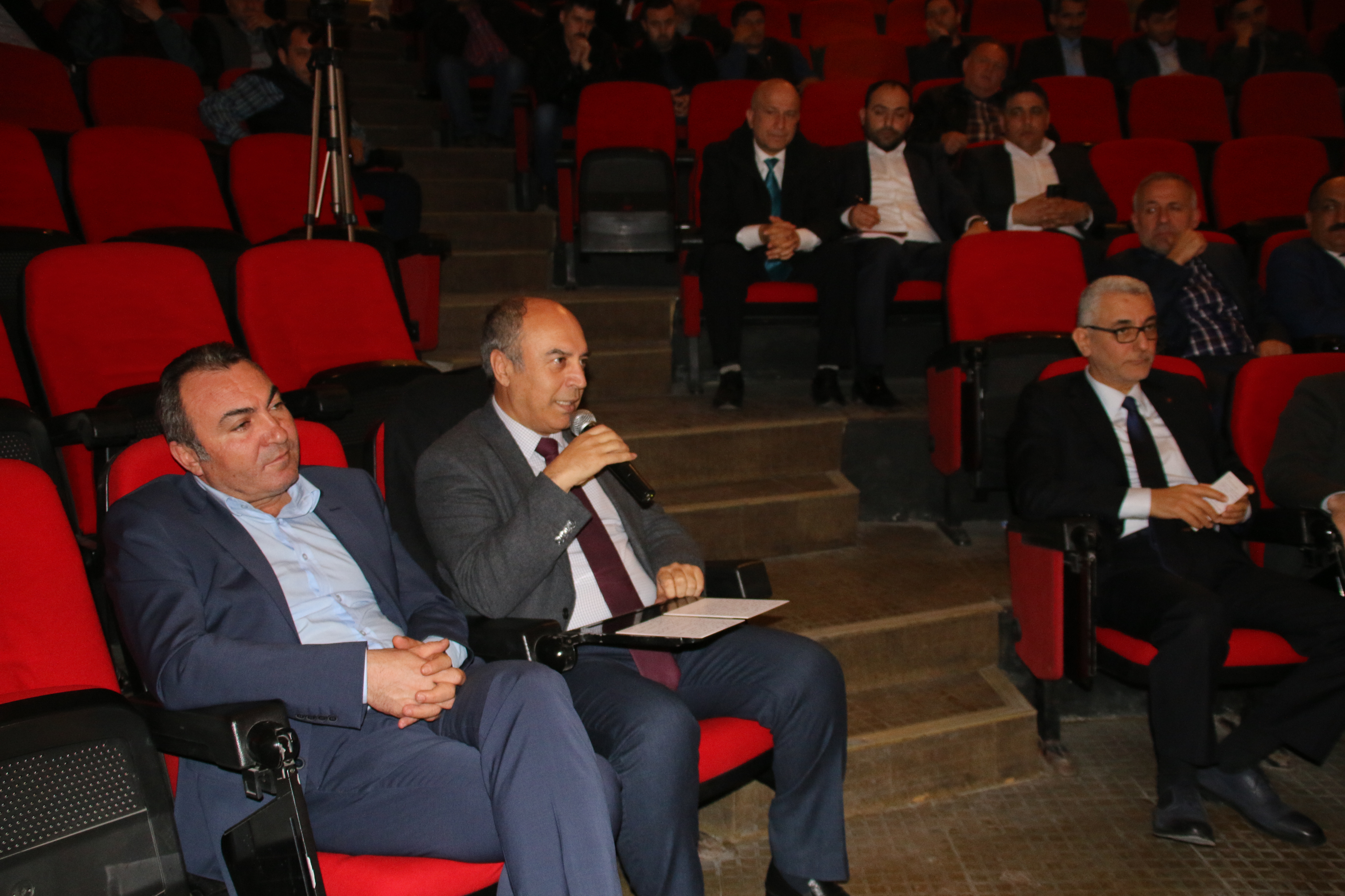 Genel Başkanımızın konuşmasının ardından öğleden önceki 1. oturumu yönetmek için Hukuk müşavirimiz Abdi Pesok ve zorunlu arabuluculuk konusunu değerlendirmek üzere Av. Kürşat Karacabey ve Yard. Doç. Dr. Mustafa Göksu yerlerini aldılar.