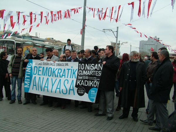 Aralarında sendika, siyasi parti ve sivil toplum örgütü temsilcilerinin bulunduğu Sivil-Demokatik Anayasa Platformu üyeleri hafta sonu Kadıköy’de düzenlenecek miting için Taksim Meydanı’nda biraraya geldi. Platform adına bir açıklama yapan Adalet Ağaoğlu, eşitlikçi, özgürlükçü, çoğulcu, sivil, demokratik bir anayasa istediklerini belirterek Türkiye toplumunun darbe anayasaları ile yaşamaya layık olmadığını, ayrımcılığa uğrayan, hakları ihlal edilen kesimlerin kendi anayasalarını yapabileceğine inandıklarını söyledi.