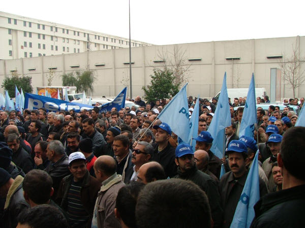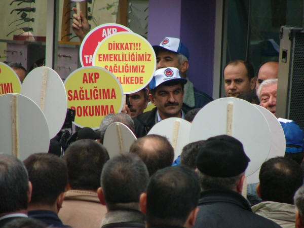 AKP’den Sosyal Sigortalar ve Genel Sağlık Sigortası Yasa tasarısının geri çekilmesi istendi.15 Ocak 2008 tarihinde, saat 11.00 de AKP İl binası önünde, Sosyal Sigortalar ve Genel Sağlık Sigortası Yasa tasarısının geri çekilmesi için TÜRK-İŞ İzmir Bölge temsilciliği öncülüğünde yapılan eyleme destek verdik.Türk-İş’e bağlı sendikalardan yaklaşık 2000 işçinin katılmış olduğu eyleme, Şubemizde Yönetici, Temsilci ve Üyelerden oluşan bir gurup ile katıldık.Eylemde “Faşizme karşı omuz omuza” “Yaşasın sınıf dayanışması”, “Suskun Türk-İş istemiyoruz” , “Kahrolsun işçi düşmanları” sloganları atan coşkulu işçiler saat 12.00 da dağılarak eylemi bitirdiler.